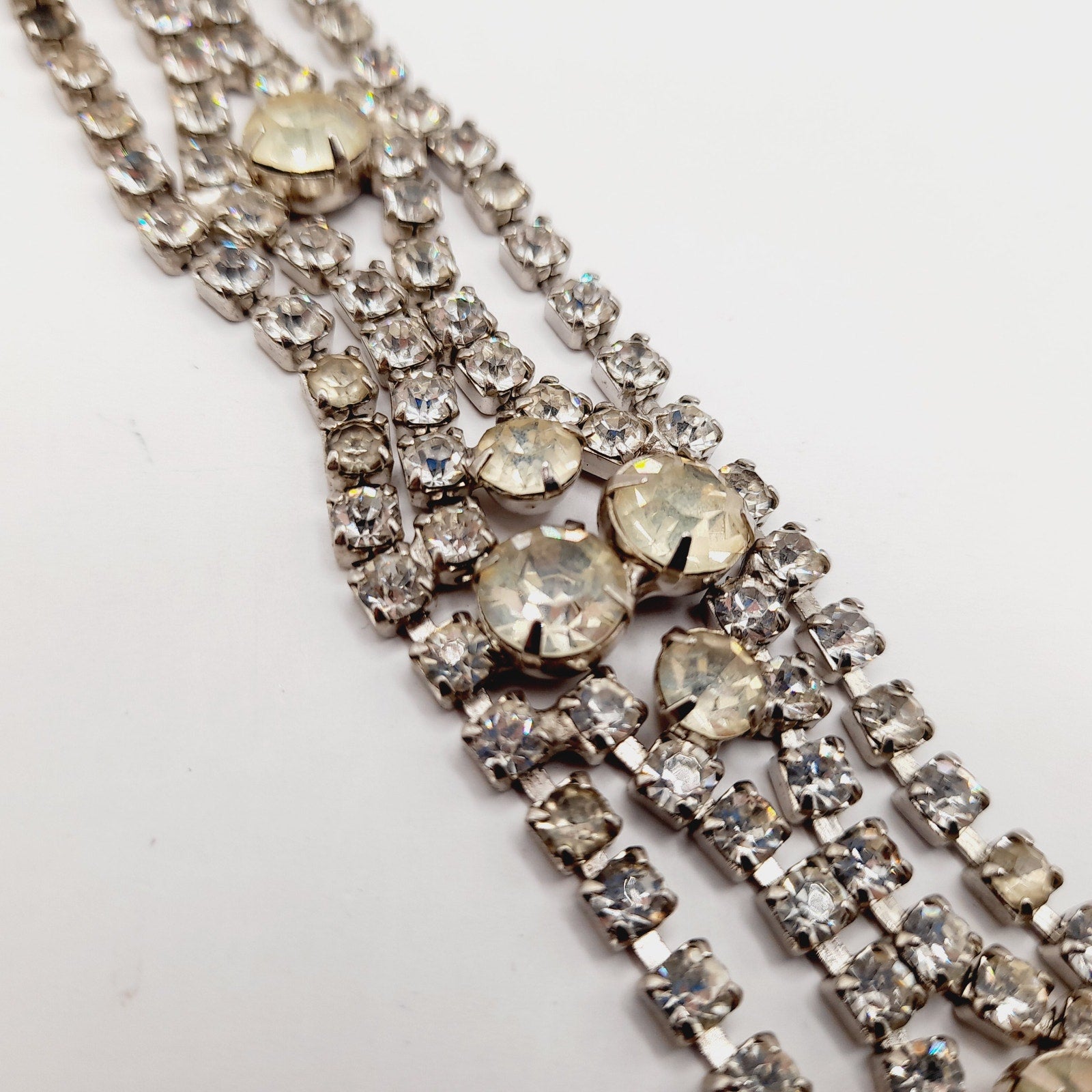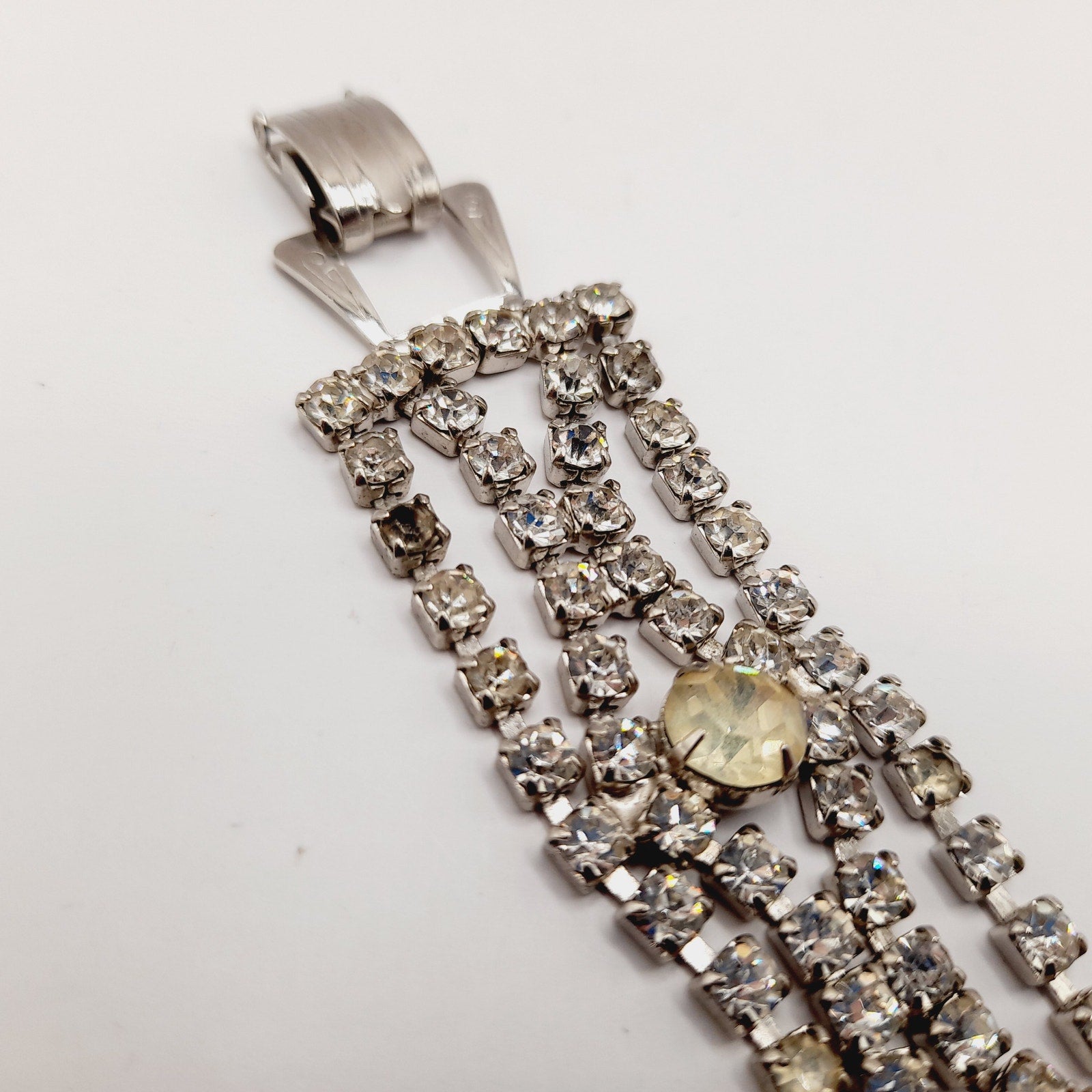 Add timeless sparkle to your jewelry collection with this vintage 1950s clear rhinestone bracelet. Featuring four elegant rows of prong-set rhinestones, this dazzling piece measures approximately 7 1/4 inches and offers a secure, comfortable fit. Its classic design makes it the perfect accessory for weddings, formal events, or special occasions.