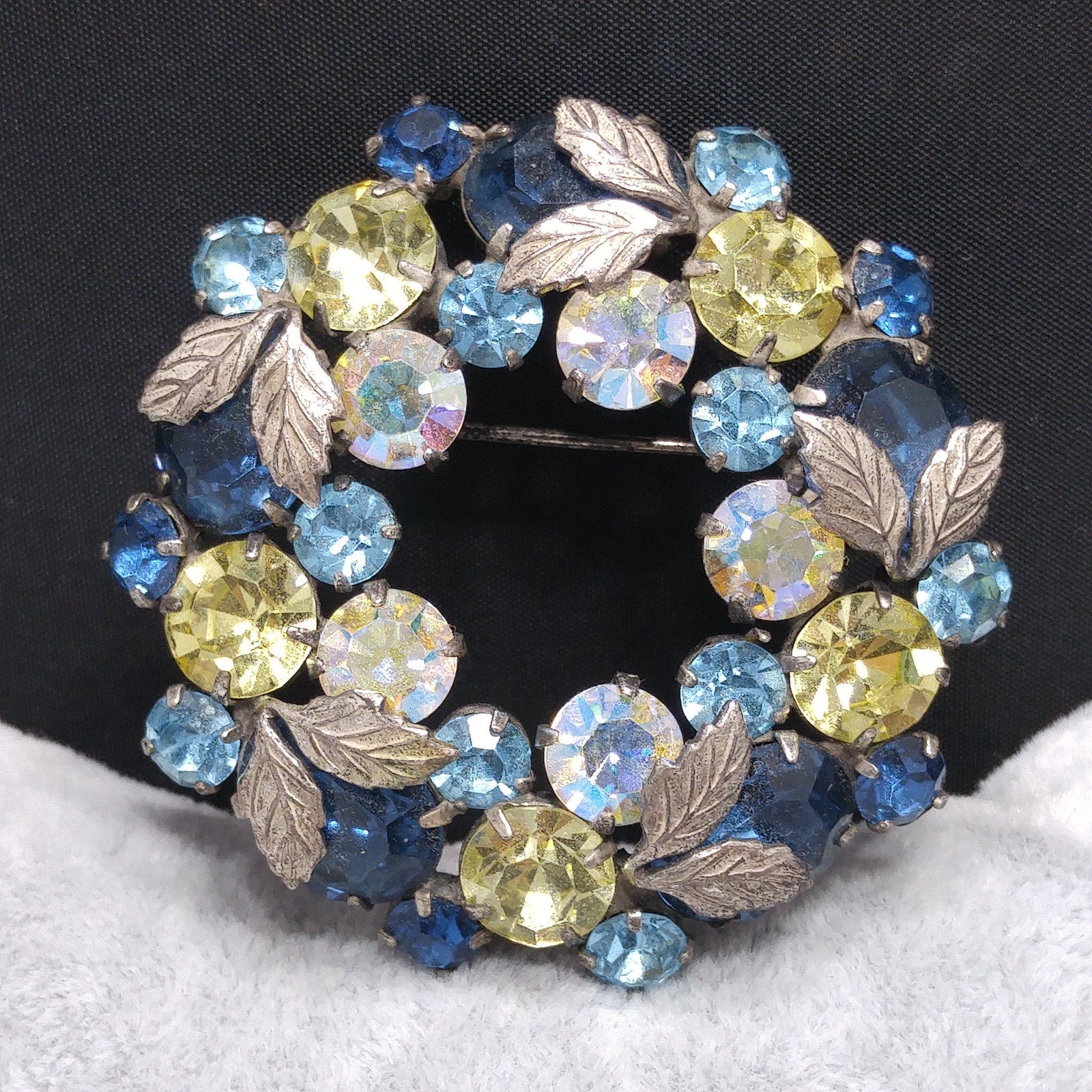 Vintage 1950s Crystal Rhinestone Wreath Brooch – Blue, Yellow, Aurora Borealis – Regency Style