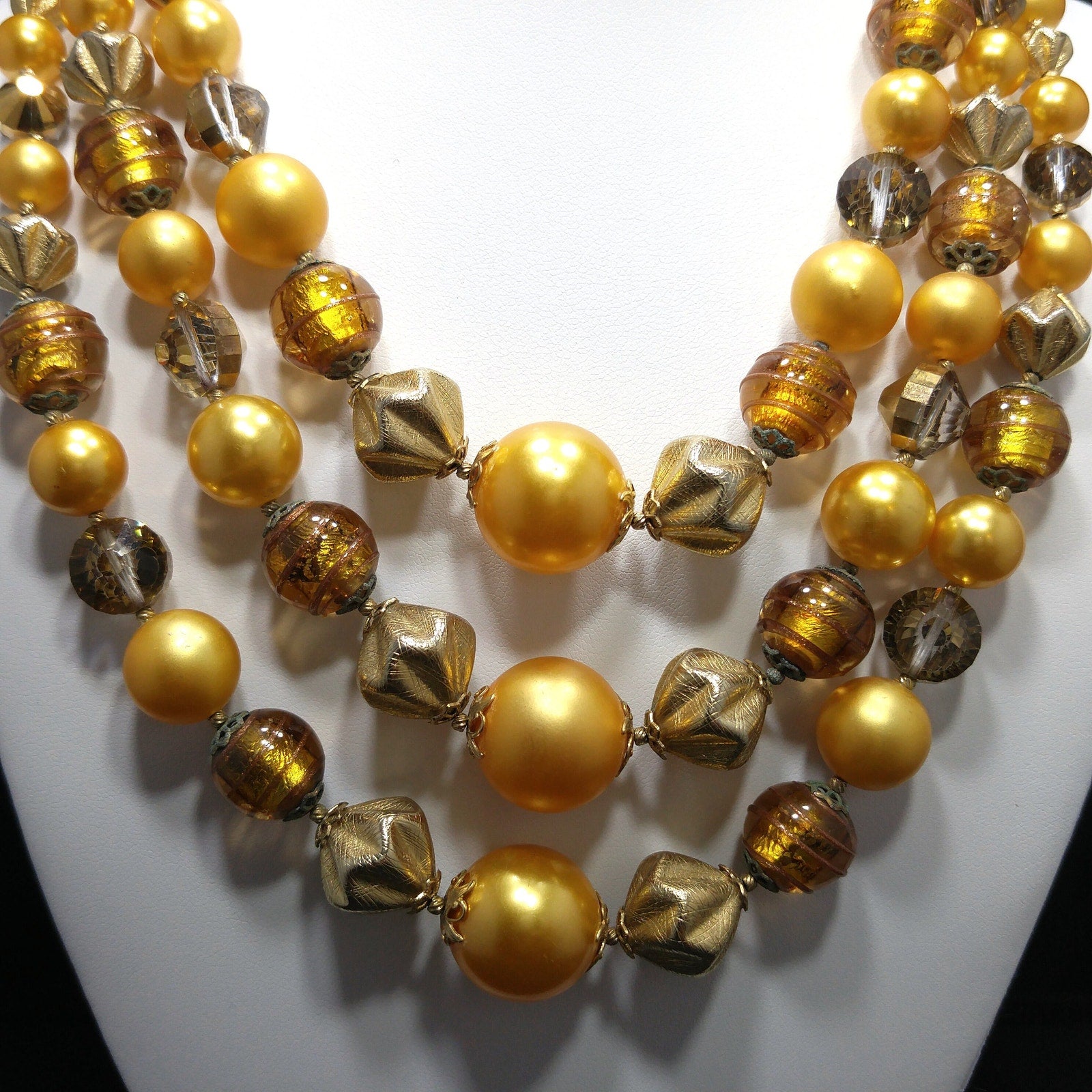Vintage 1950s Gold Glass Bead Necklace, 3 Strand Mid-Century Statement Jewelry