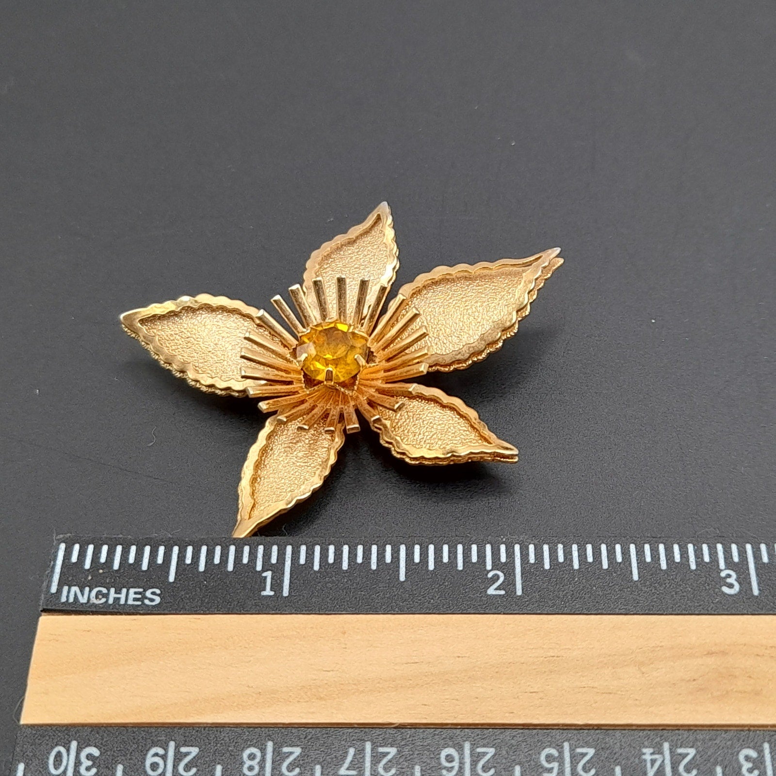 This vintage 1950s gold tone flower brooch sparkles with classic mid-century charm. Designed with layered metal petals and accented by brilliant rhinestones at the center, the brooch captures the elegance of retro costume jewelry. Measuring 2 1/4 inches, it’s the perfect accessory to pin on a lapel, dress, or scarf for a timeless touch of sparkle.