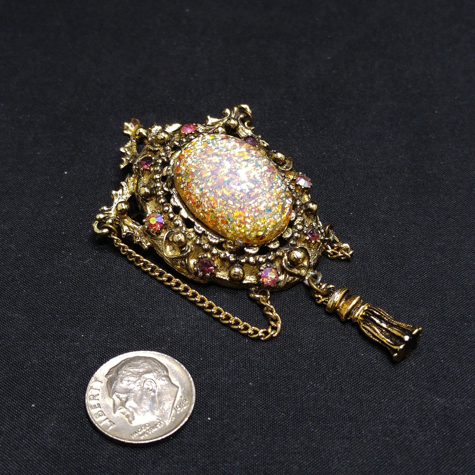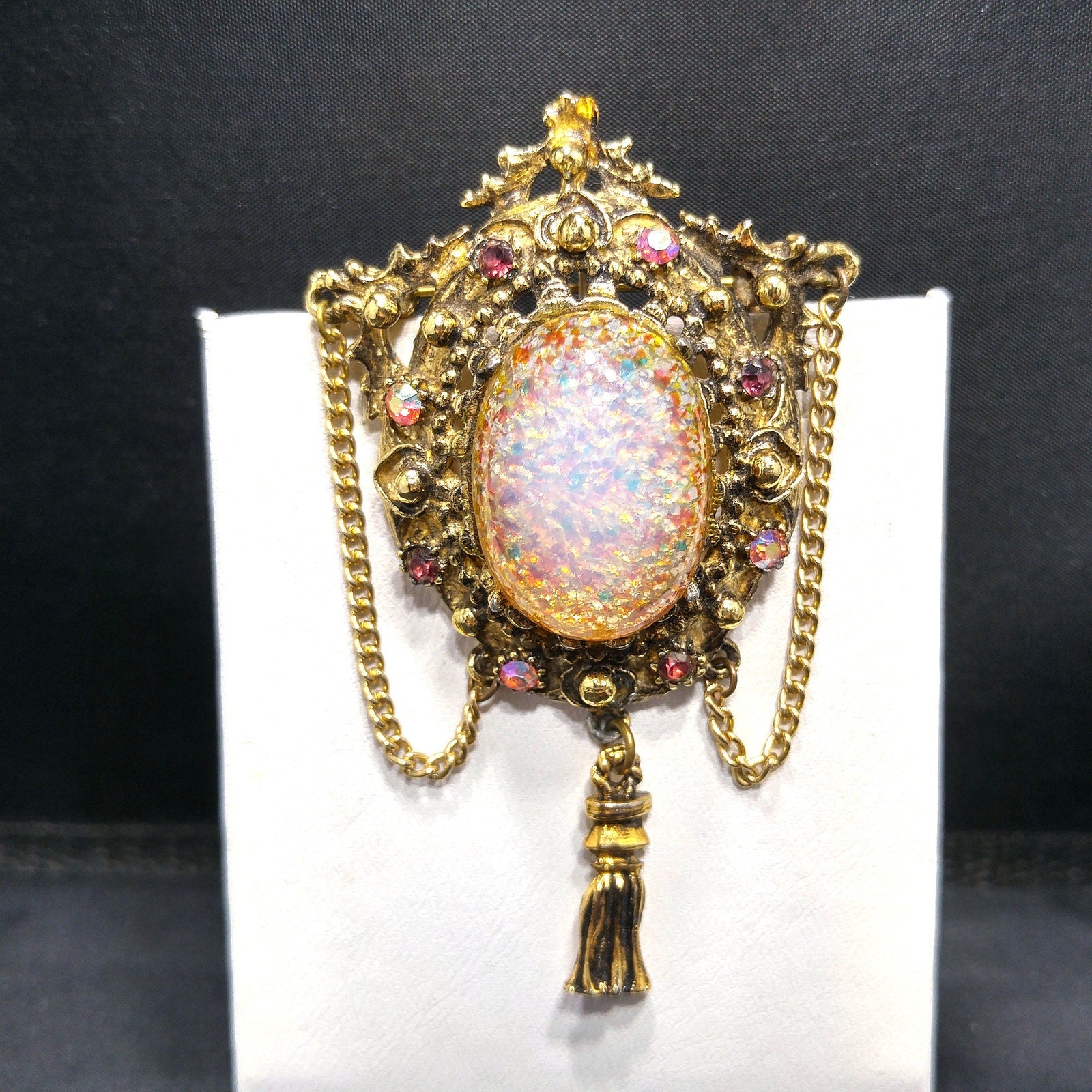 Vintage 1950s Hollywood Faux Opal Glitter Glass Brooch Tassel