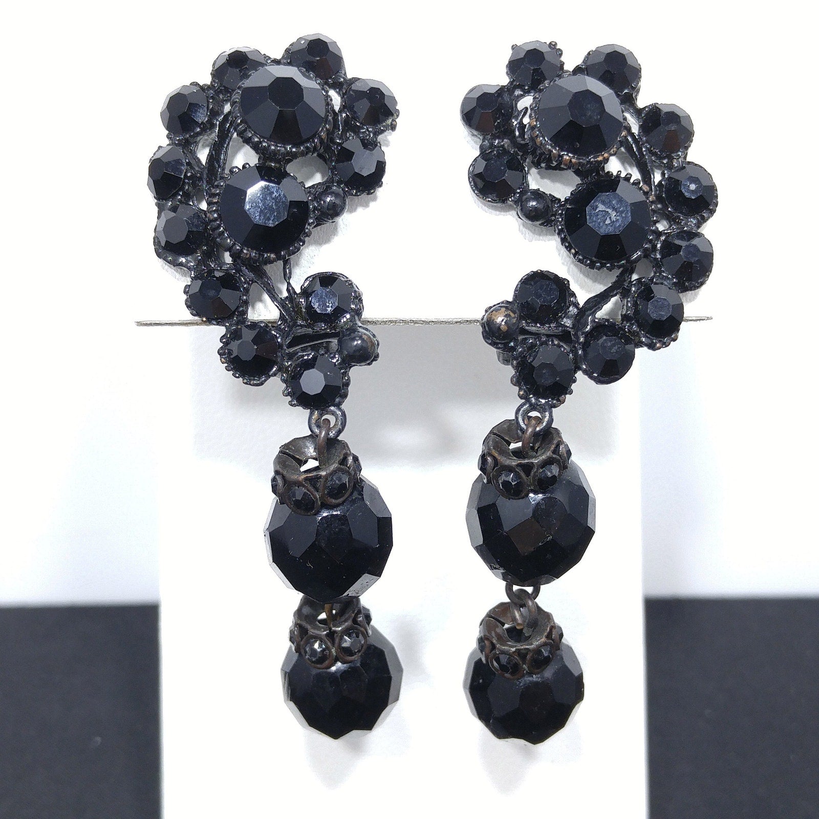The upper section of the earrings showcases layered black rhinestones in ornate settings, while the dangles include faceted crystal beads accented with black rhinestone rondelles. These earrings are clip-on style, typical of the mid-century design era, and make a perfect accessory for evening wear, holiday occasions, or vintage collectors who appreciate bold statement jewelry.