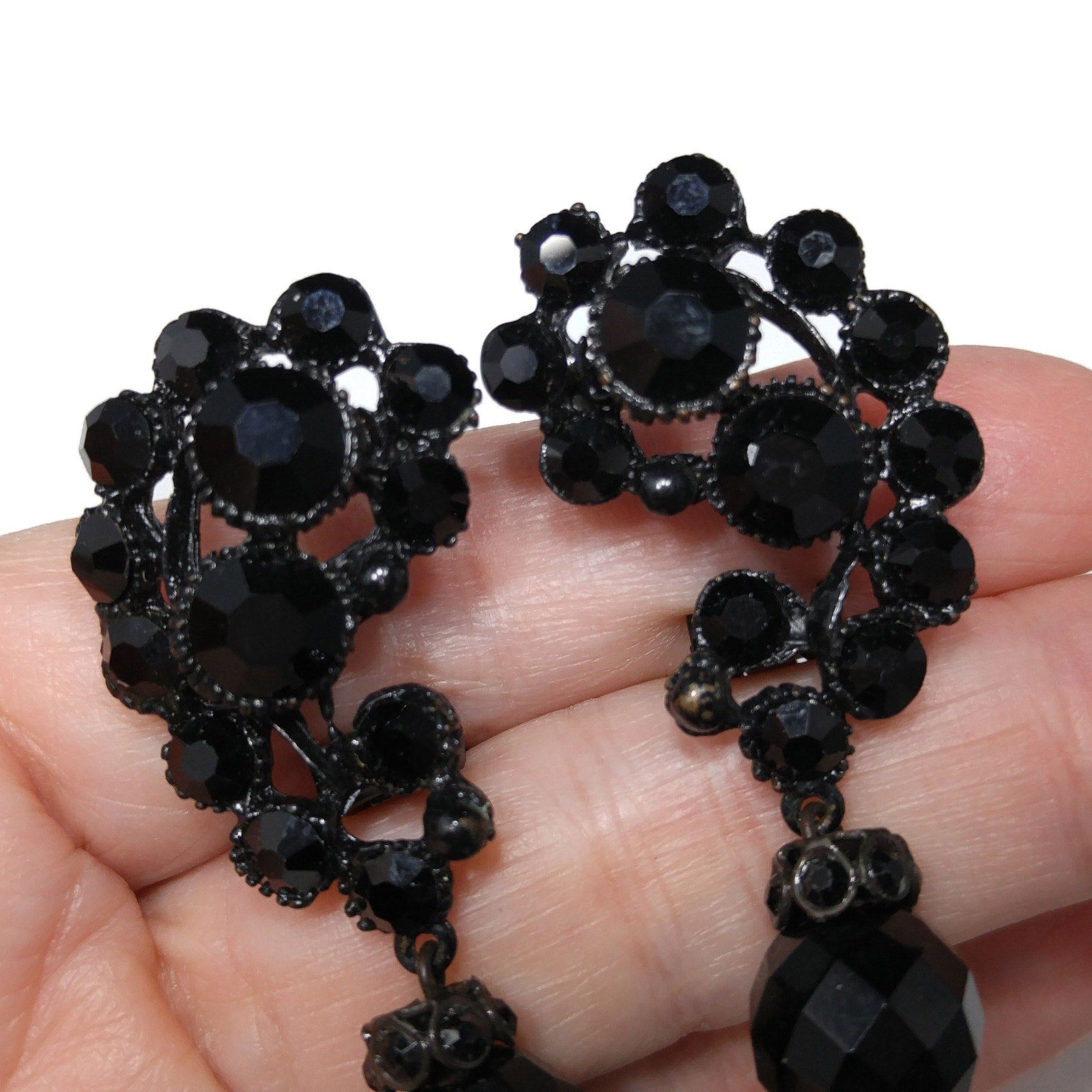 This is a stunning pair of vintage 1950s Japanned ear climber style drop earrings featuring deep black crystal rhinestones and faceted beads. Each earring has an intricate black enamel finish over non-magnetic metal, often referred to as “Japanning,” which gives the piece a dramatic and elegant Gothic look.