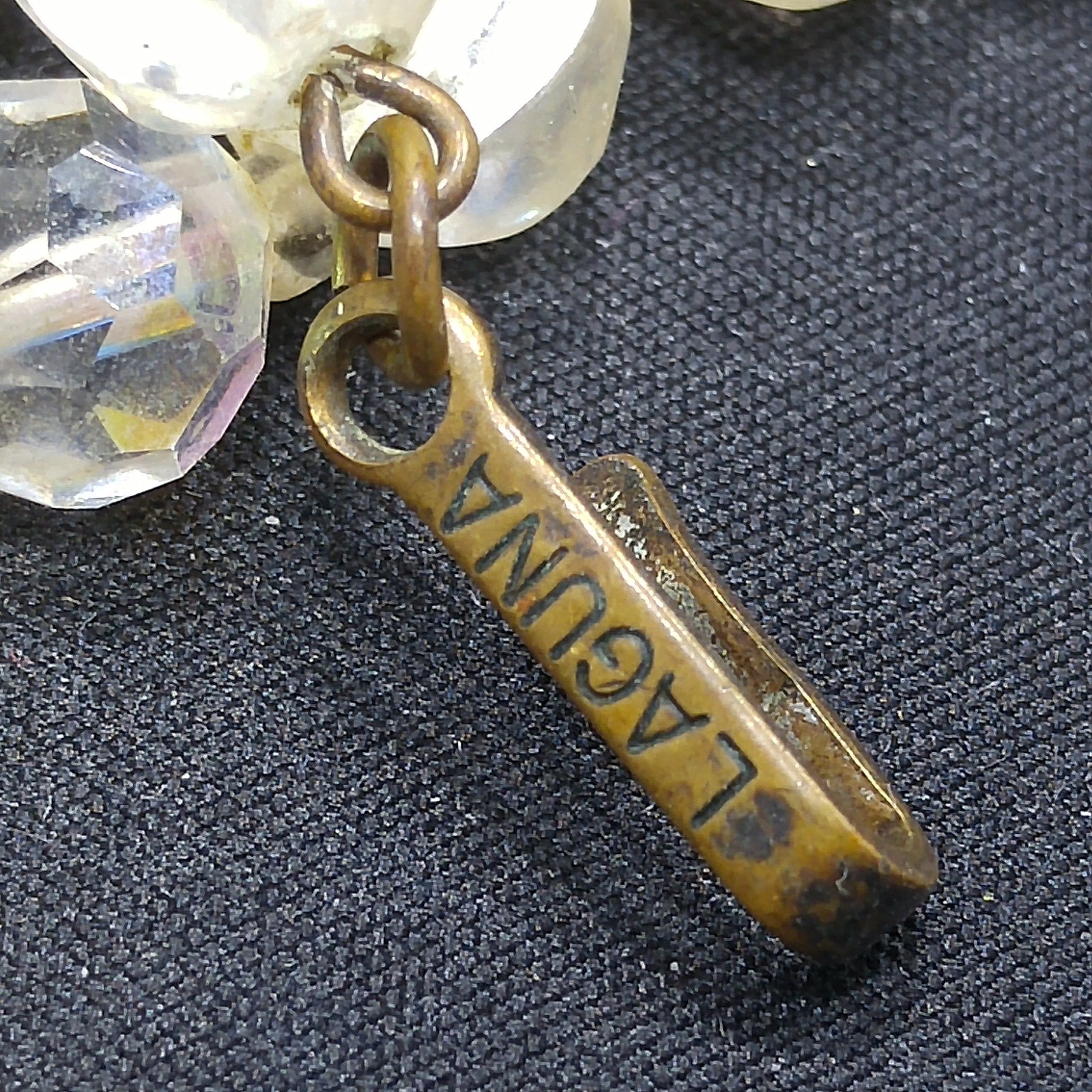 Each bead alternates between faux crackle glass Lucite and clear aurora borealis-finished crystal, adding dimension and light reflection. The necklace is completed with a hook clasp and a signed “LAGUNA” hang tag near the clasp.