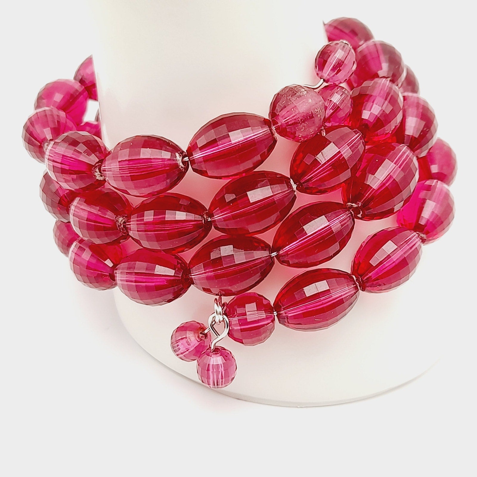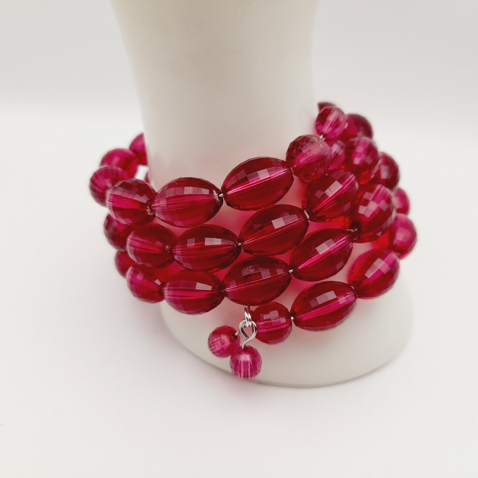 Add a touch of mid-century charm to your jewelry collection with this stunning vintage-inspired memory wire bracelet. Handcrafted with genuine 1950s Lucite beads, it features beautifully faceted oval purple beads that catch the light with every movement. The memory wire design allows the bracelet to coil comfortably around the wrist, making it easy to wear without a clasp.