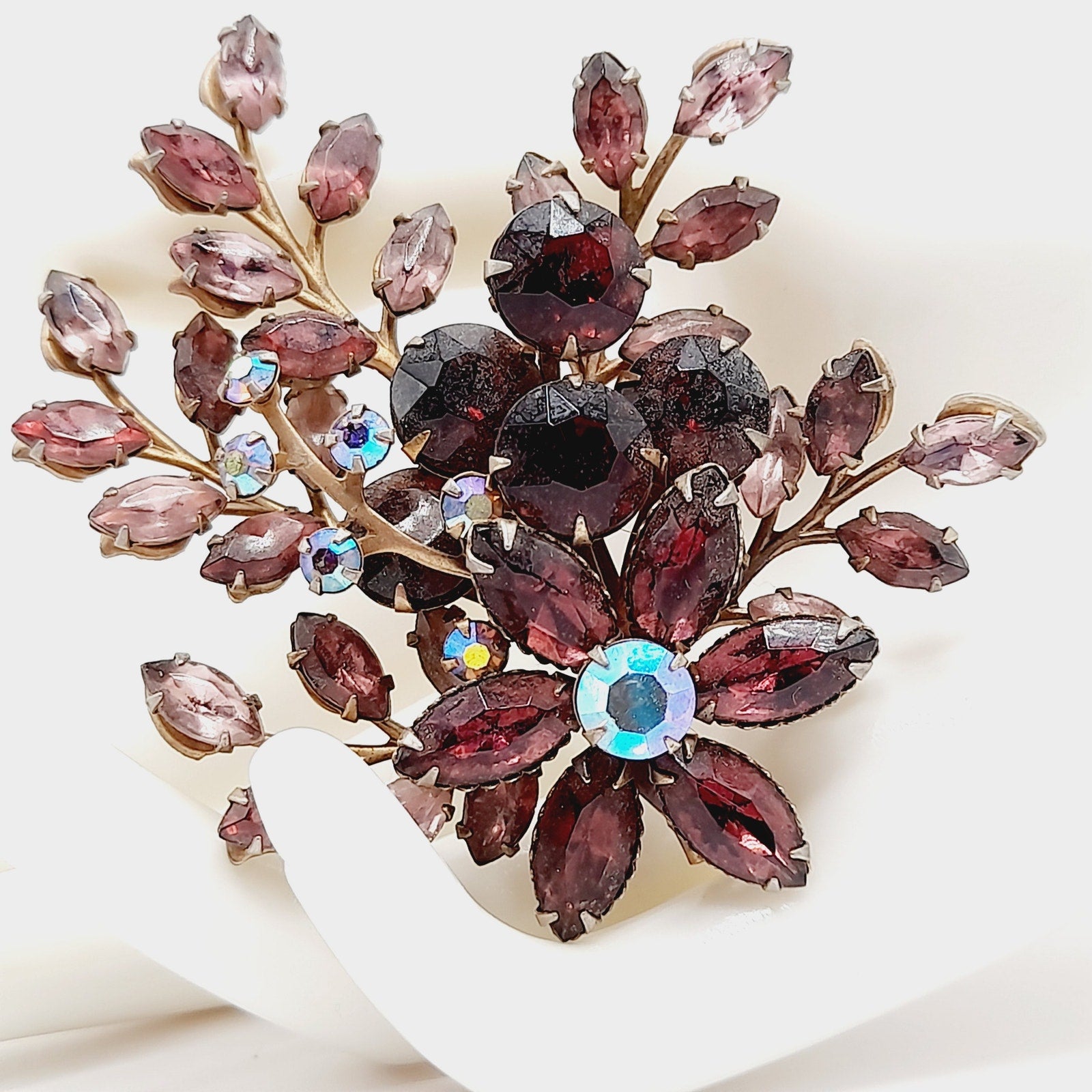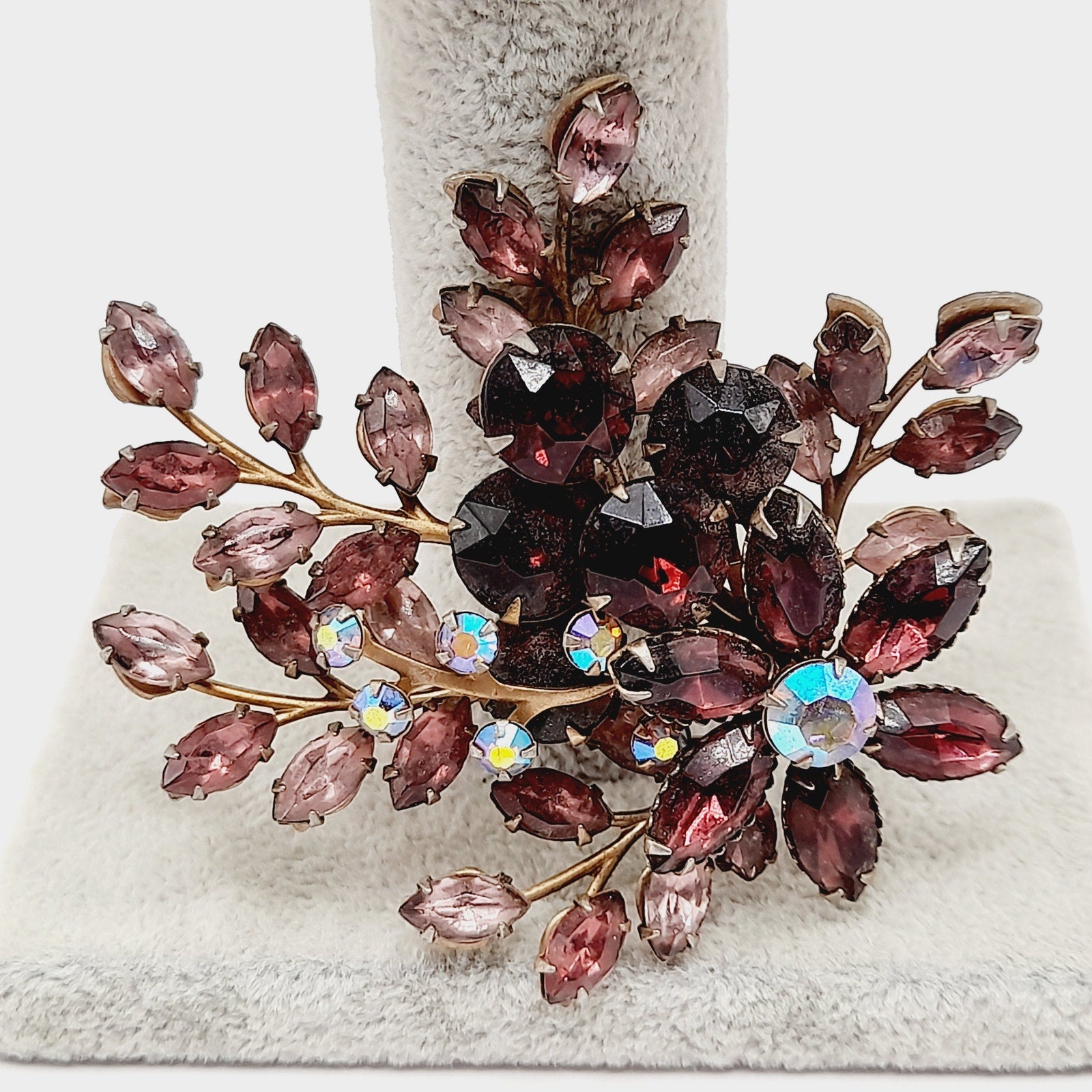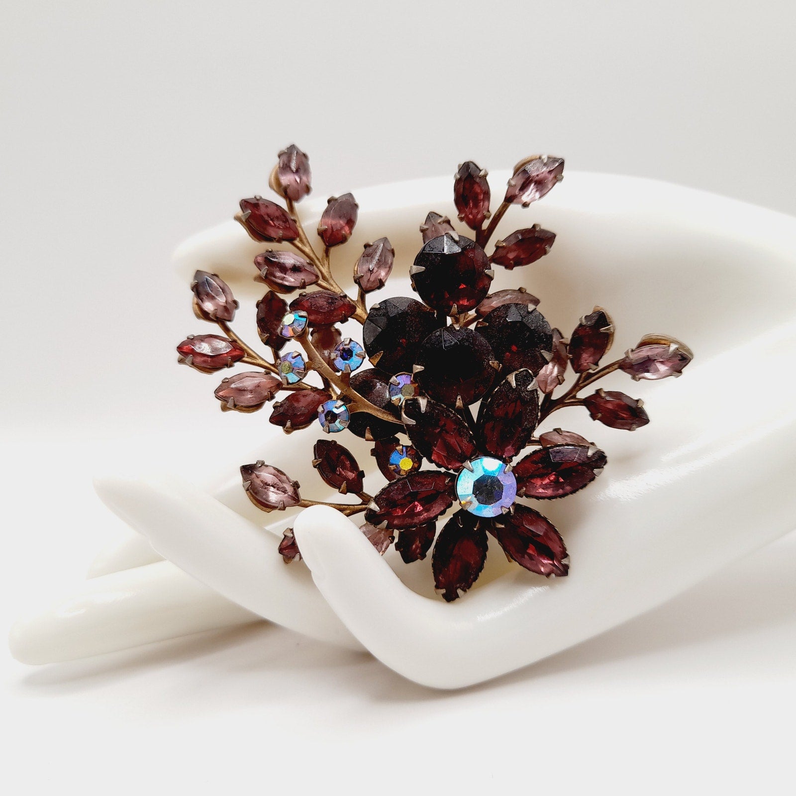 This vintage 1950s floral spray brooch showcases sparkling purple and lavender rhinestones arranged in a graceful bouquet design. Crafted in the style of Beau Jewels and Judy Lee, the brooch features layered petals and leaves, accented with brilliant faceted stones that shimmer beautifully in the light. Measuring a bold 3 inches, it’s an elegant statement piece that captures the romantic style of mid-century costume jewelry.