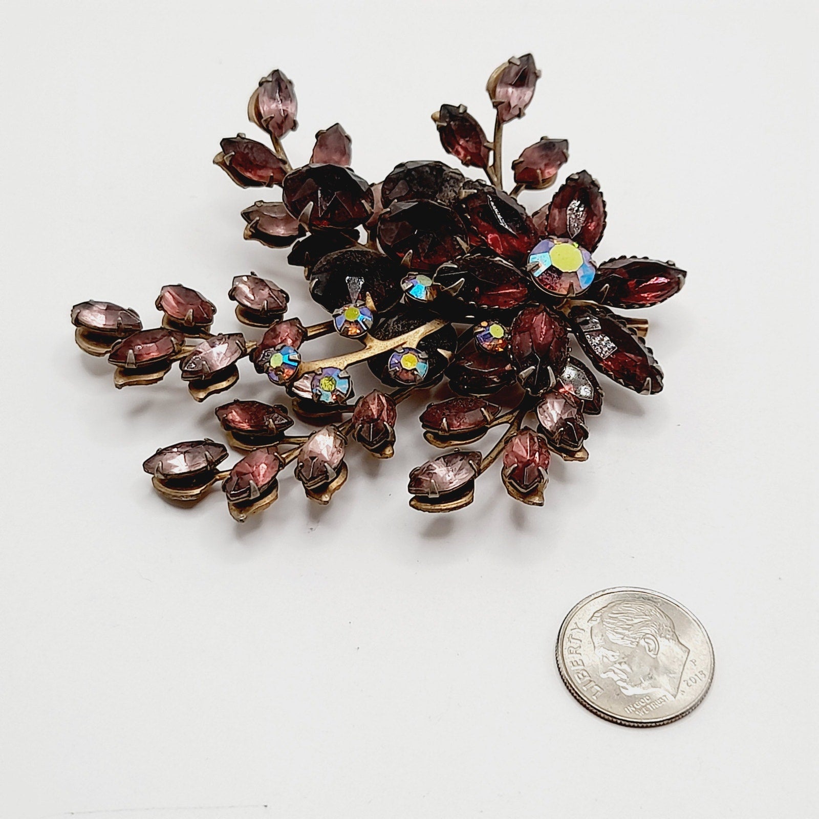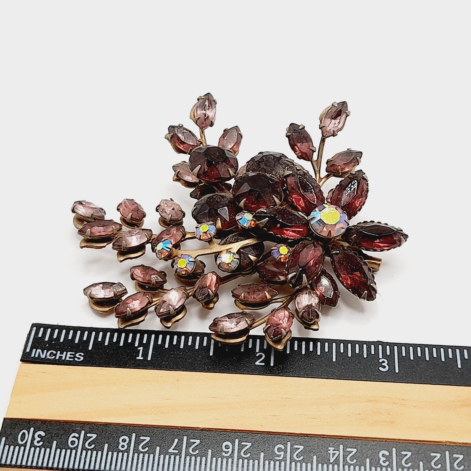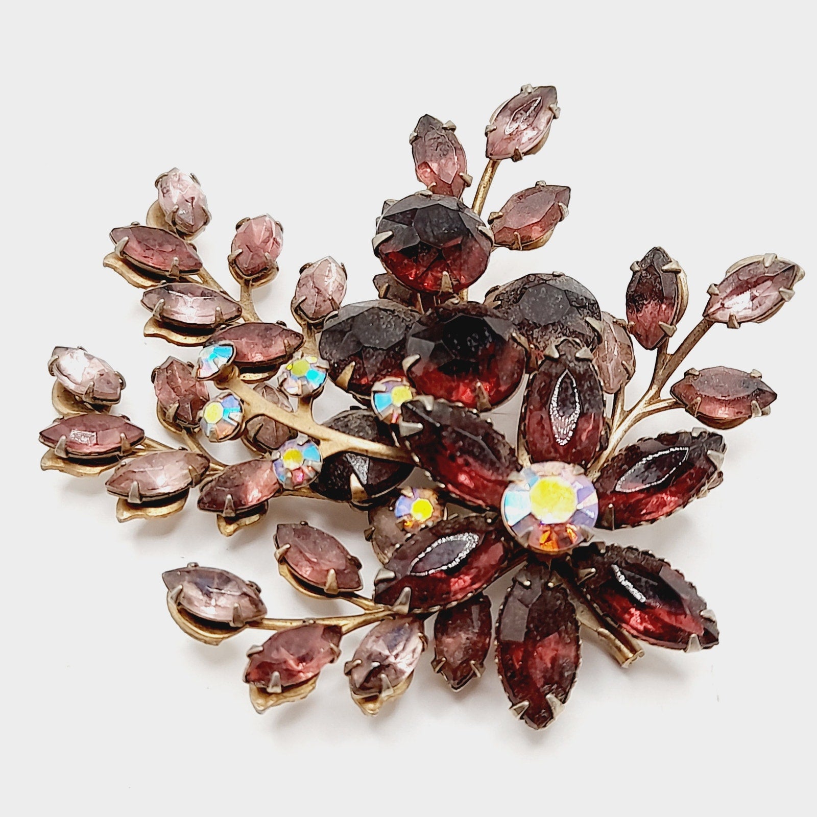 This vintage 1950s floral spray brooch showcases sparkling purple and lavender rhinestones arranged in a graceful bouquet design. Crafted in the style of Beau Jewels and Judy Lee, the brooch features layered petals and leaves, accented with brilliant faceted stones that shimmer beautifully in the light. Measuring a bold 3 inches, it’s an elegant statement piece that captures the romantic style of mid-century costume jewelry.