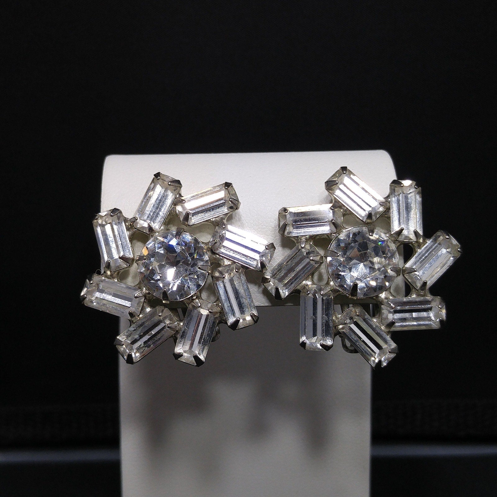 Vintage 1950s Weiss Clear Rhinestone Clip Earrings Baguette Floral Wedding