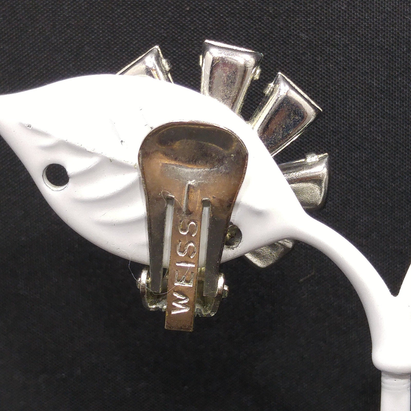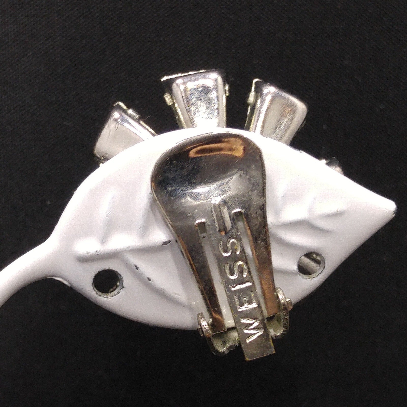 The setting is rhodium plated, a finish Weiss frequently used for its bright white luster and resistance to tarnish. Both clips are stamped WEISS on the back, confirming their authenticity.