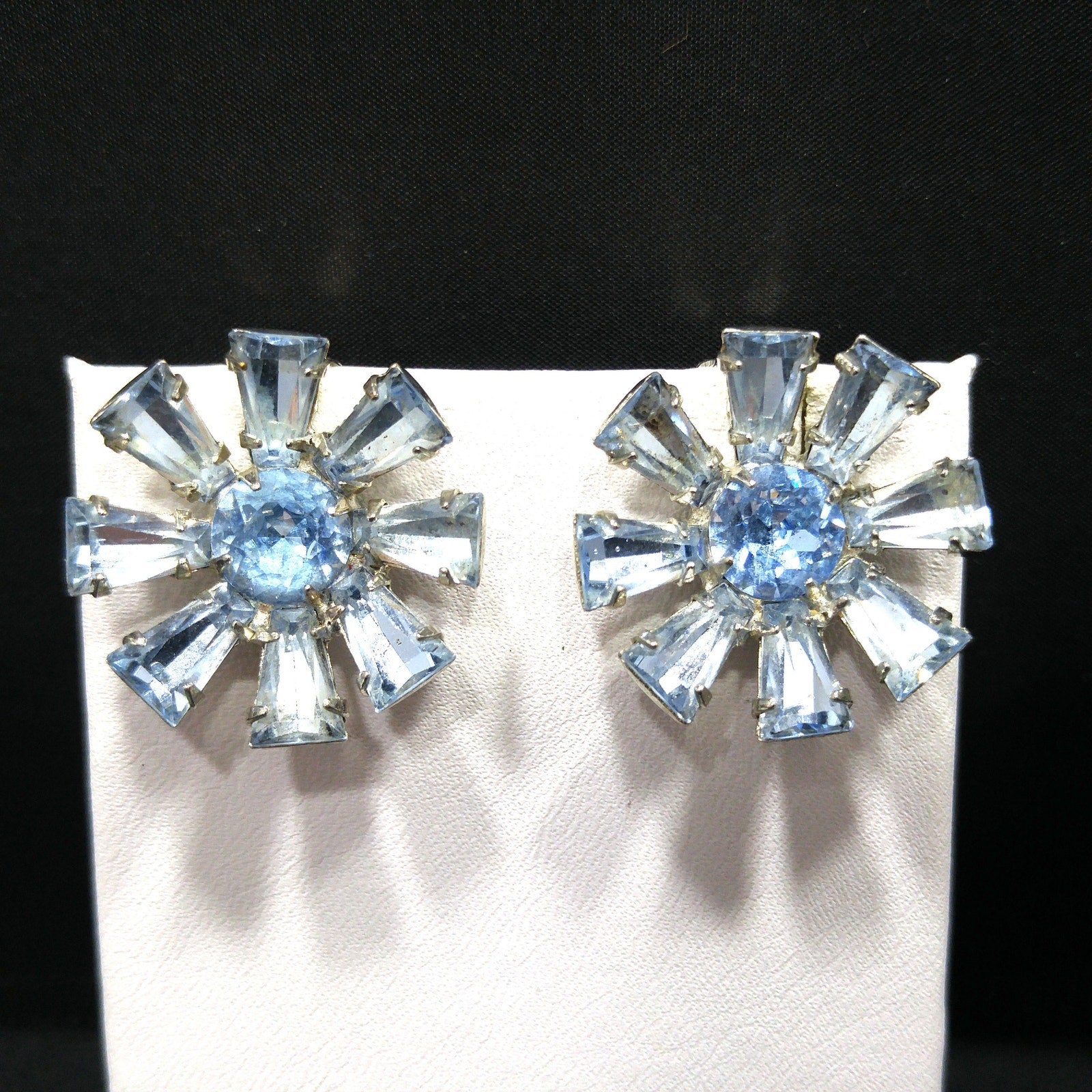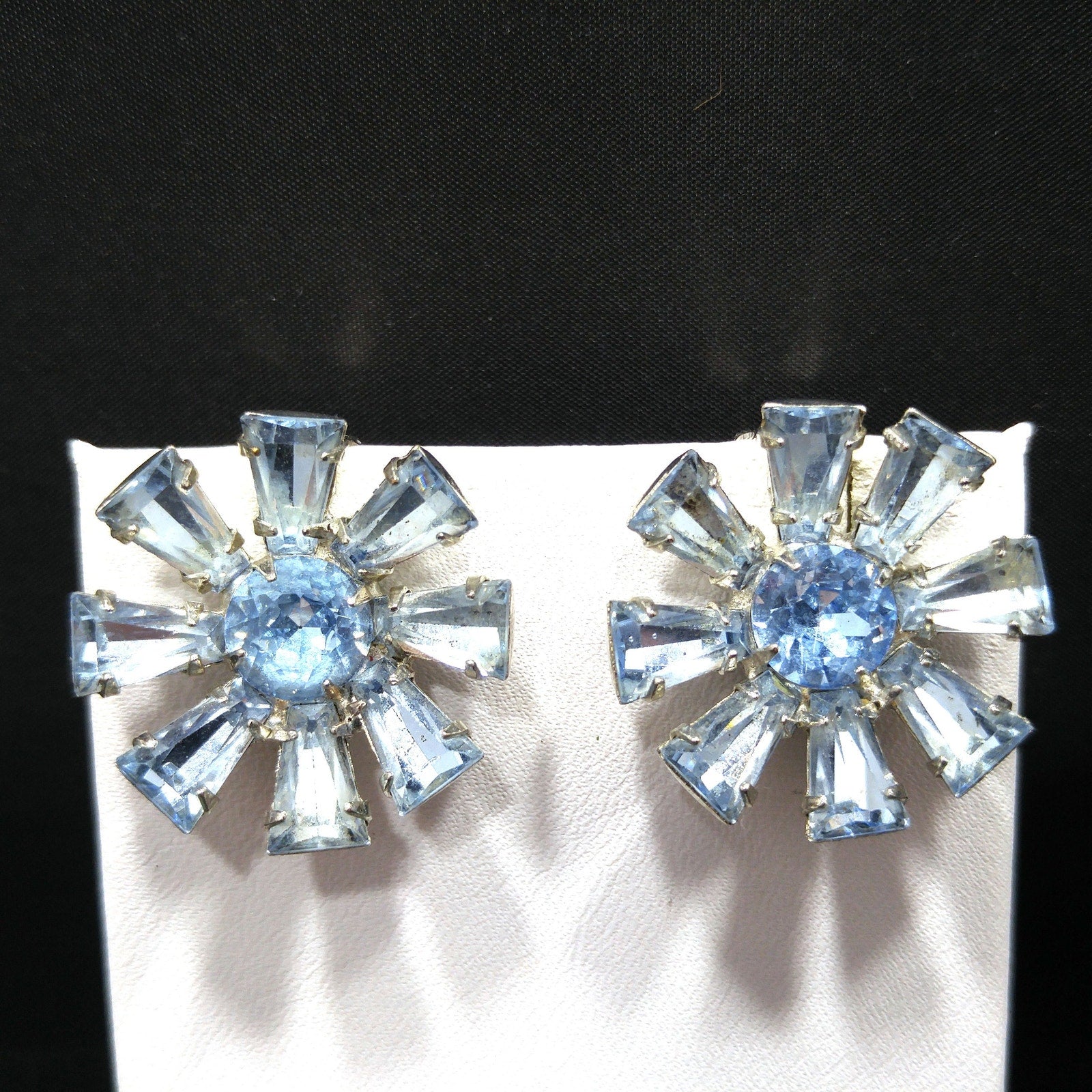 Vintage 1950s Weiss Light Blue Rhinestone Clip Earrings Rhodium Floral Design