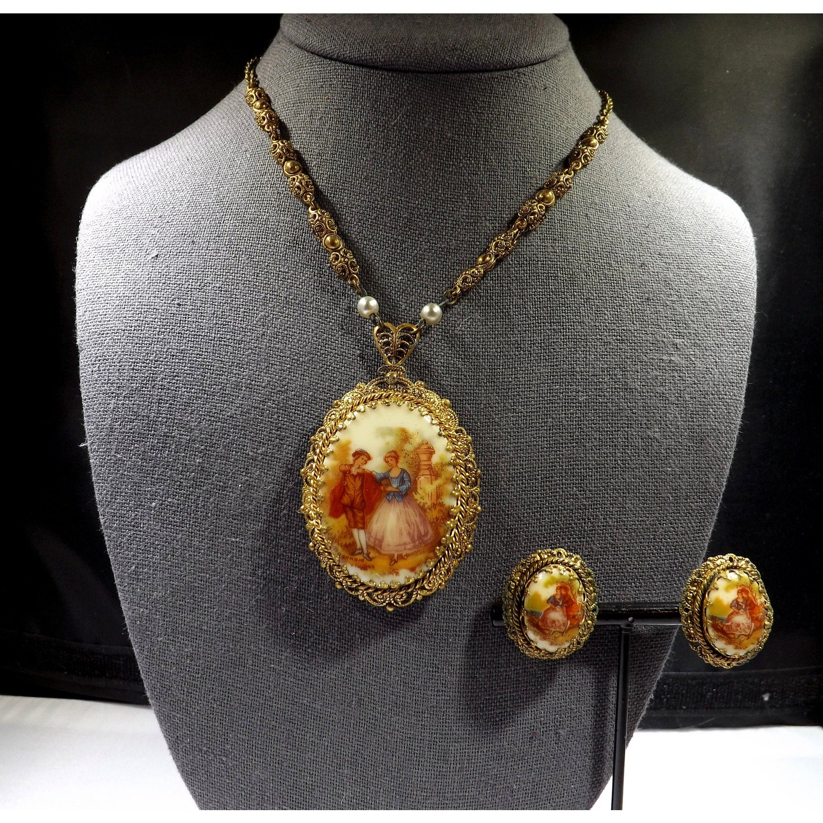 This is a beautiful vintage German cameo-style jewelry set from the 1940s to 1950s, featuring a dual-function pendant and brooch with matching clip-on earrings, each adorned with charming courting couple scenes inspired by 18th-century European romance paintings.