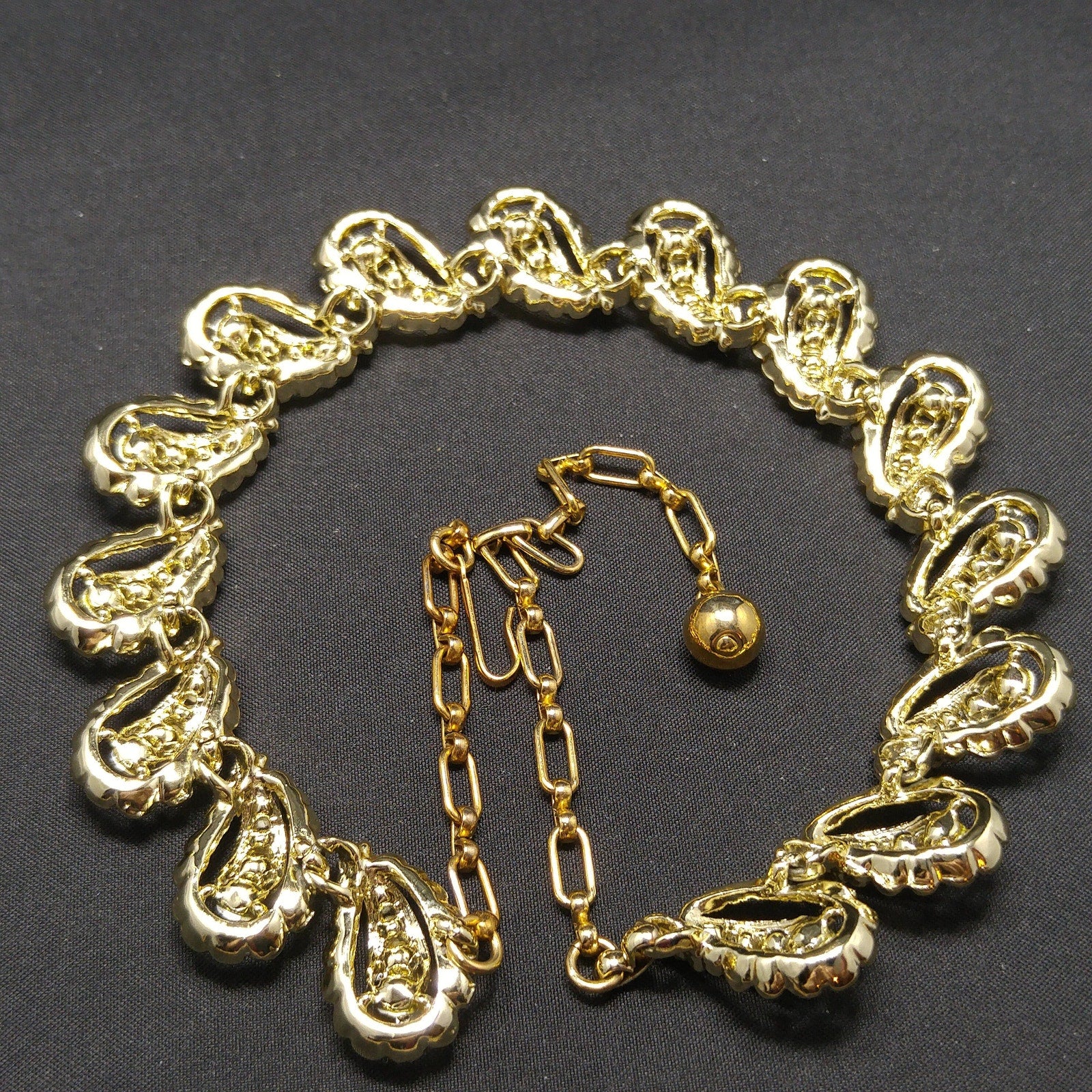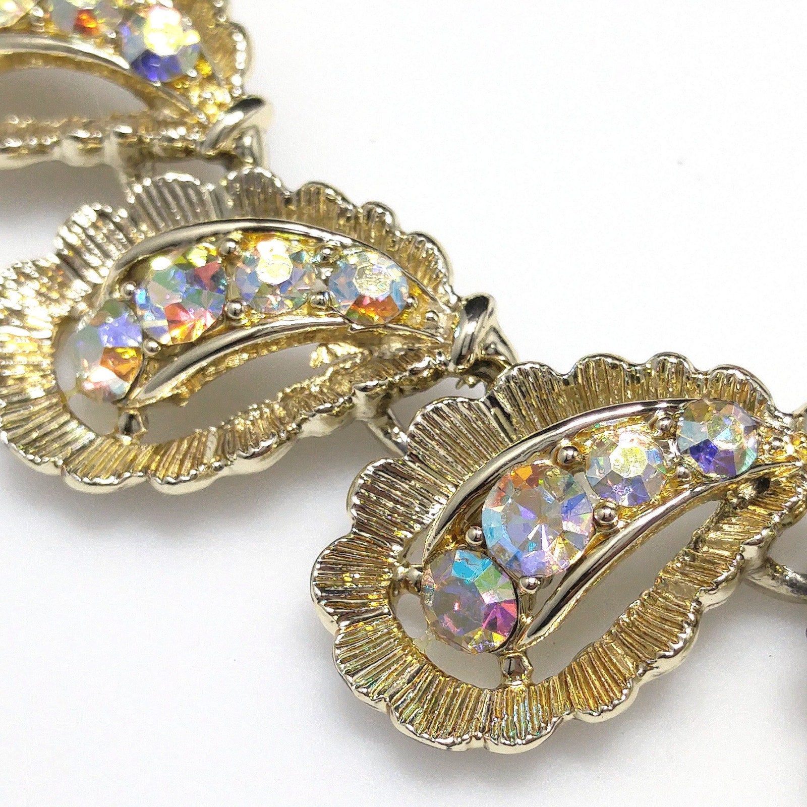 This is a stunning aurora borealis rhinestone choker necklace from the 1960s, featuring radiant clear AB rhinestones set in a gold-plated link design. Each section of the necklace is shaped like a stylized leaf or paisley, set with four graduated aurora borealis stones that catch the light in beautiful shades of pink, yellow, blue, and gold.