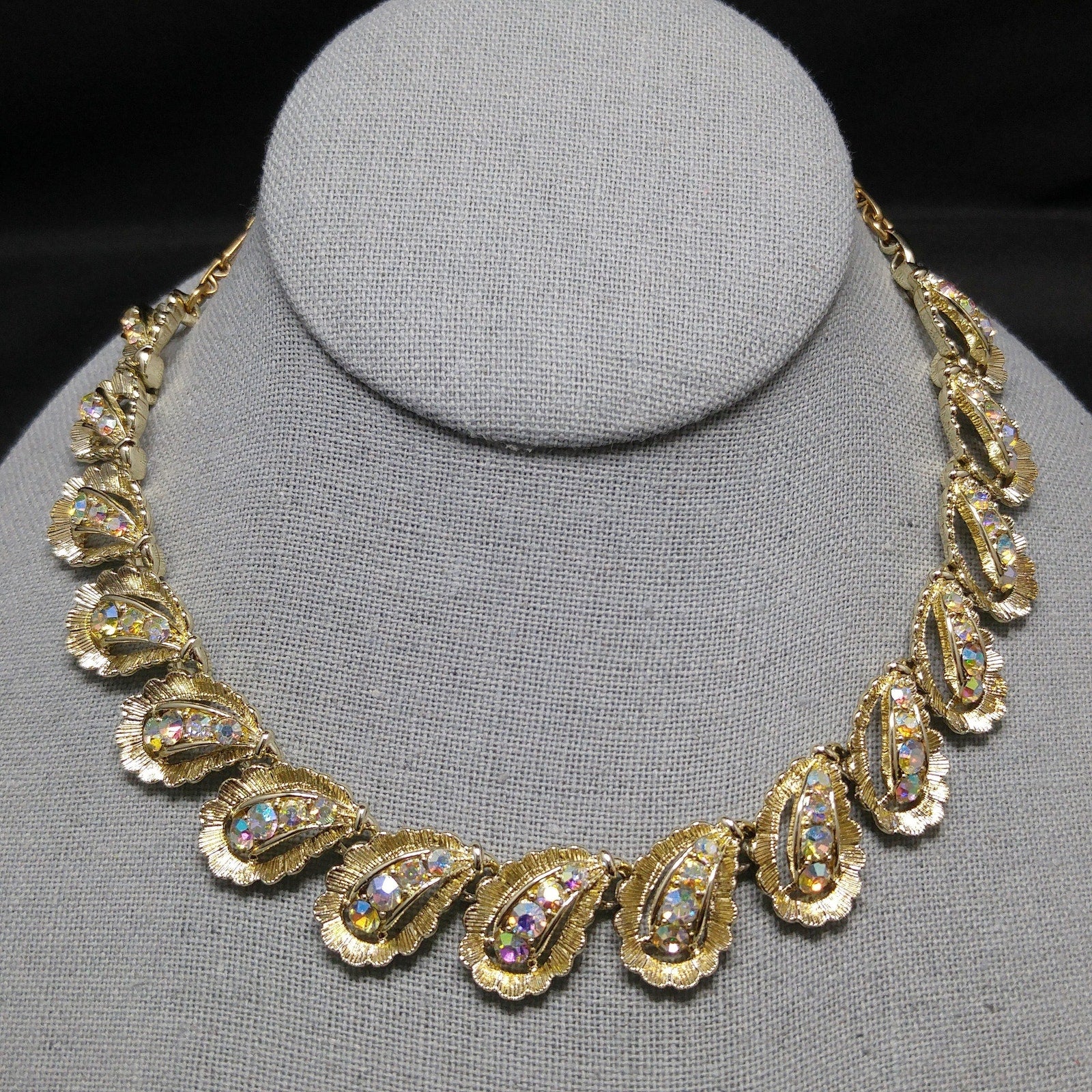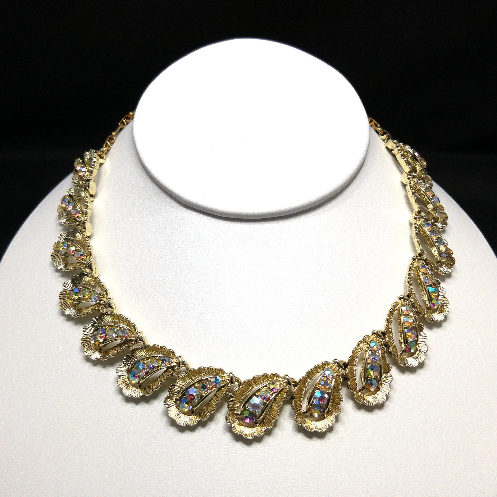 A beautiful 1960s rhinestone necklace that captures the glamour of vintage costume jewelry — ideal for formal wear or collectors of classic aurora borealis designs.