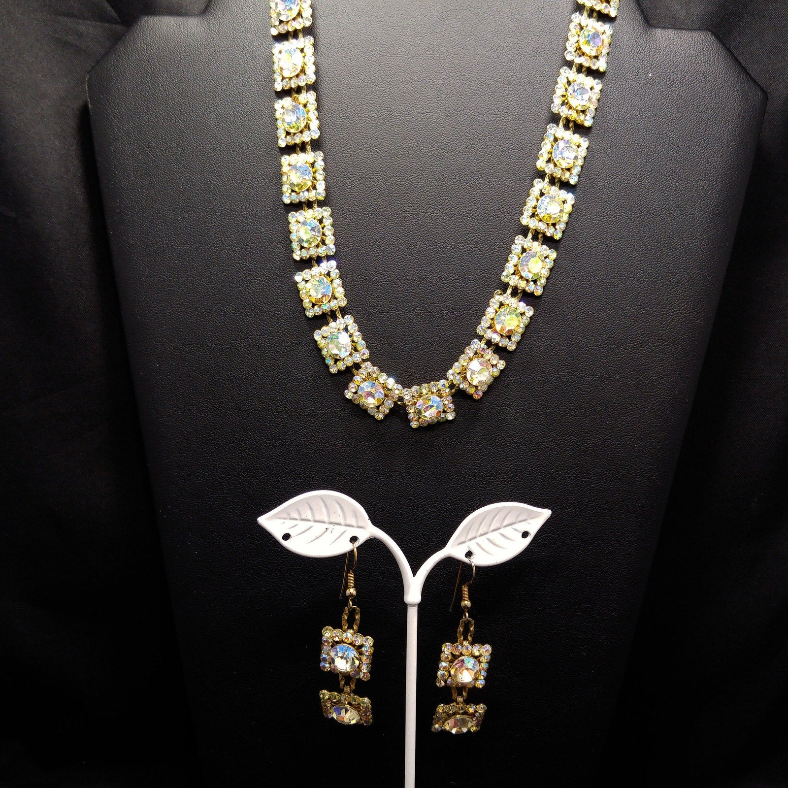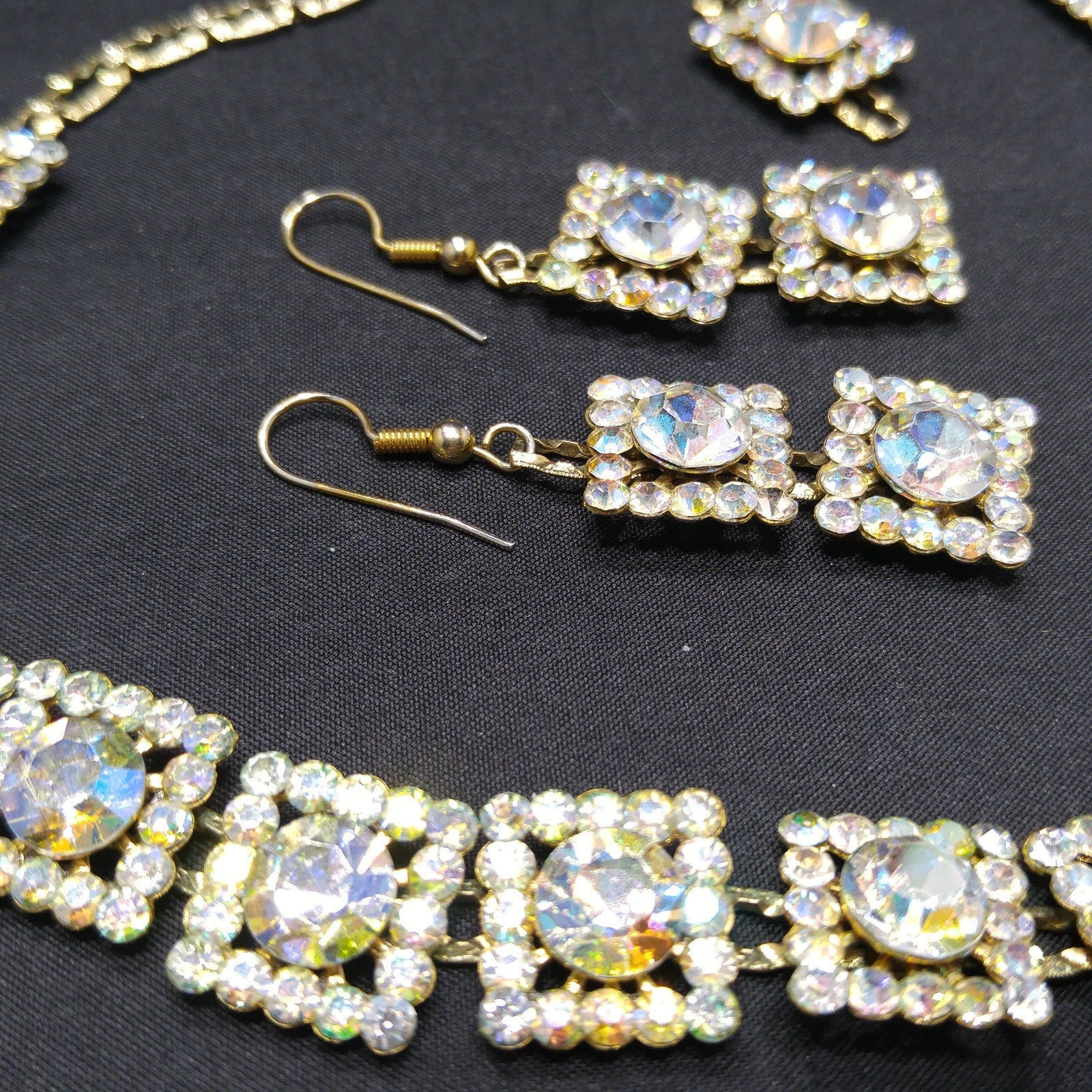 Vintage 1960s Aurora Borealis Rhinestone Necklace & Earrings Set – Square Links