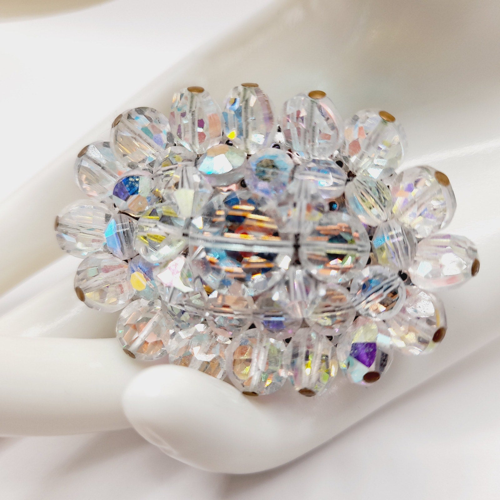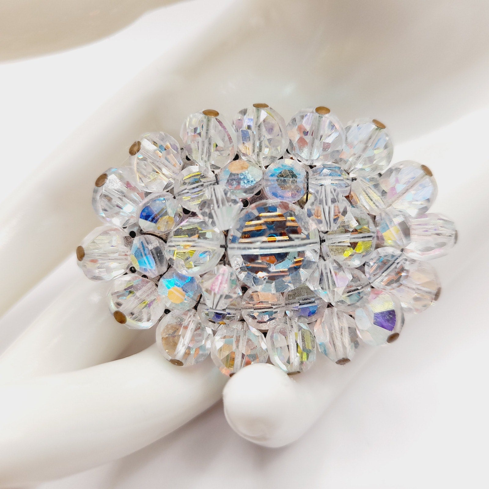 “Vintage 1960s oval brooch featuring faceted crystal Aurora Borealis beads that shimmer with timeless mid-century sparkle.”