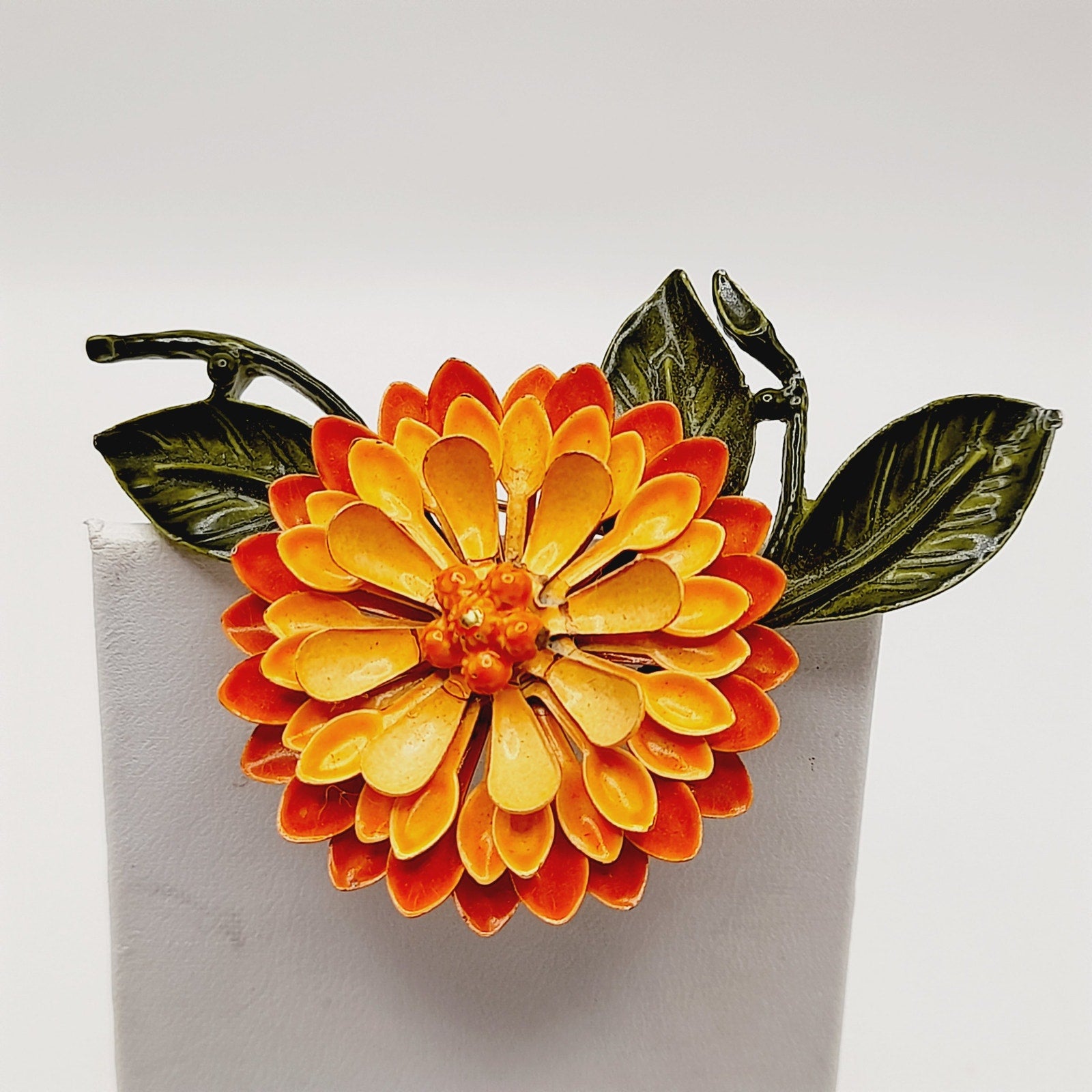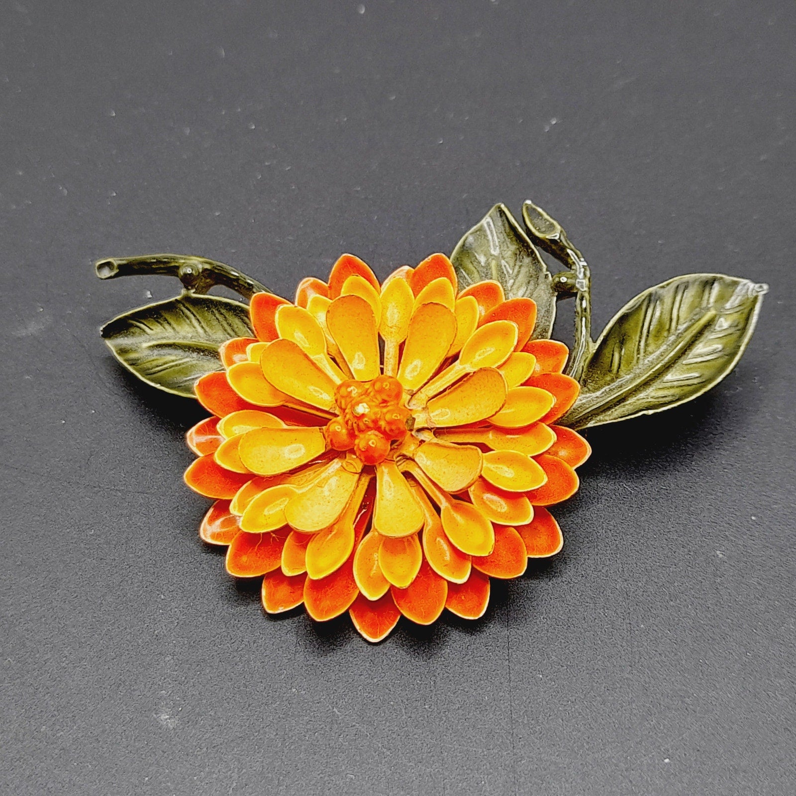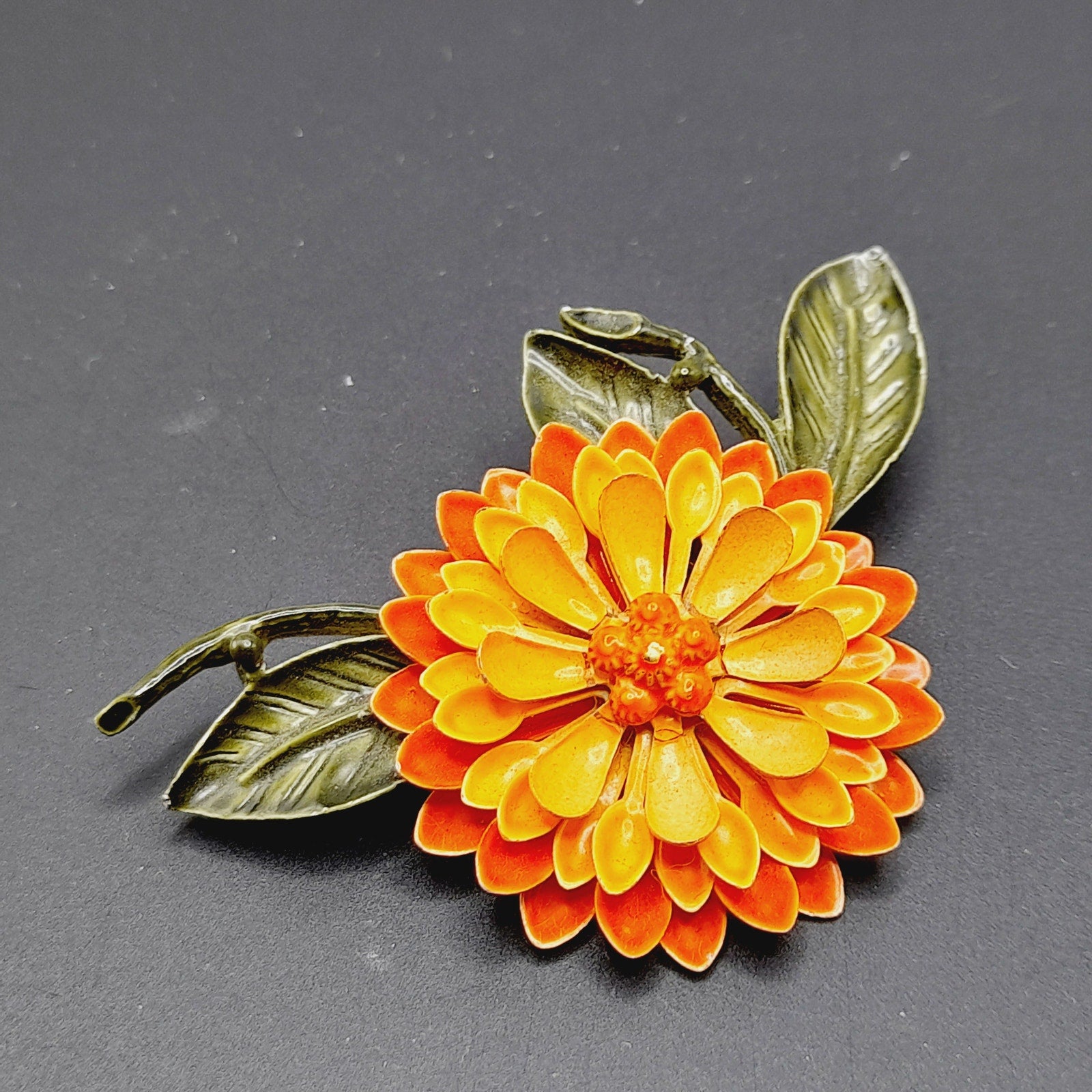 Add a touch of vintage charm to your outfit with this beautiful 1960s brooch! The vibrant orange and green enamel flower design is sure to catch the eye and brighten up any look.