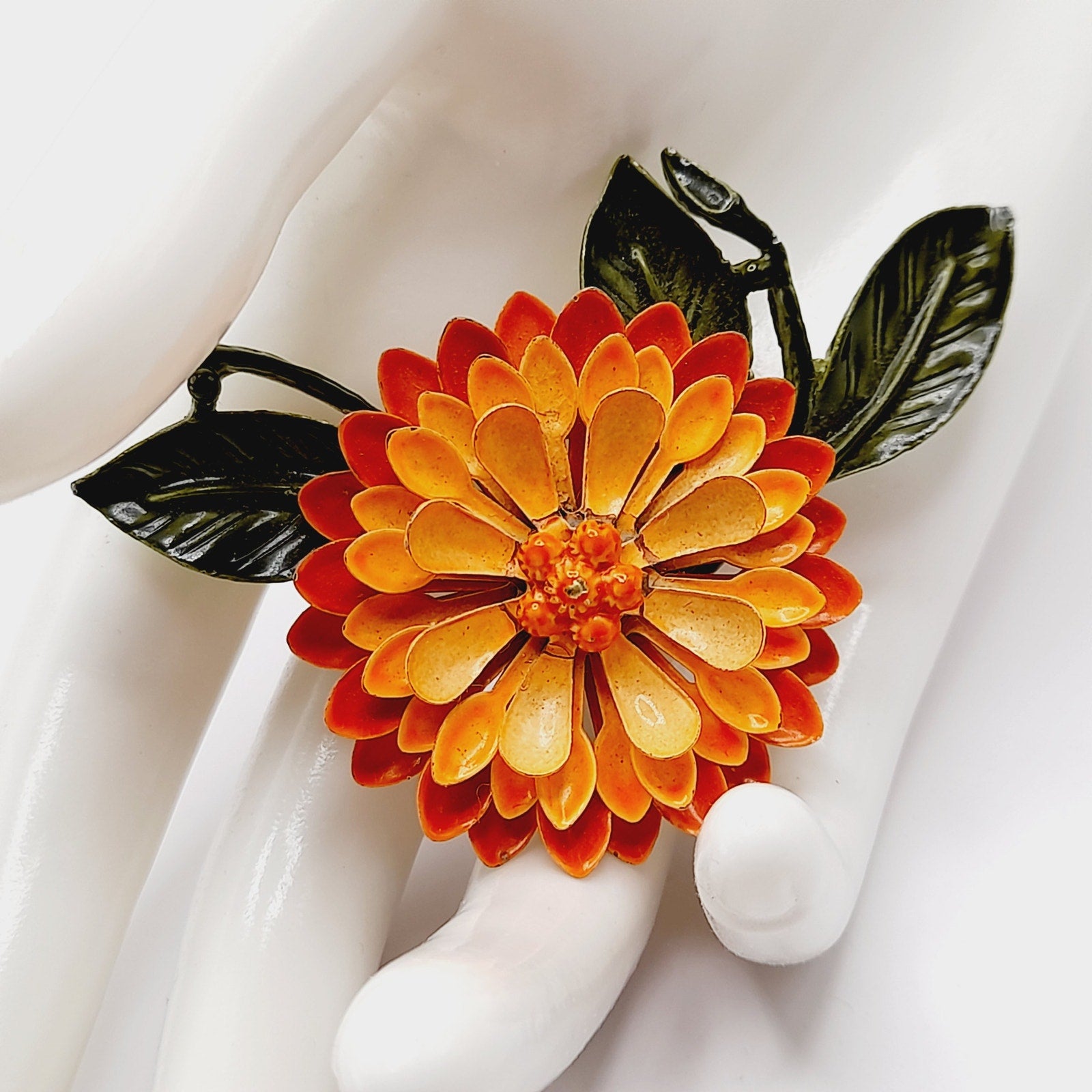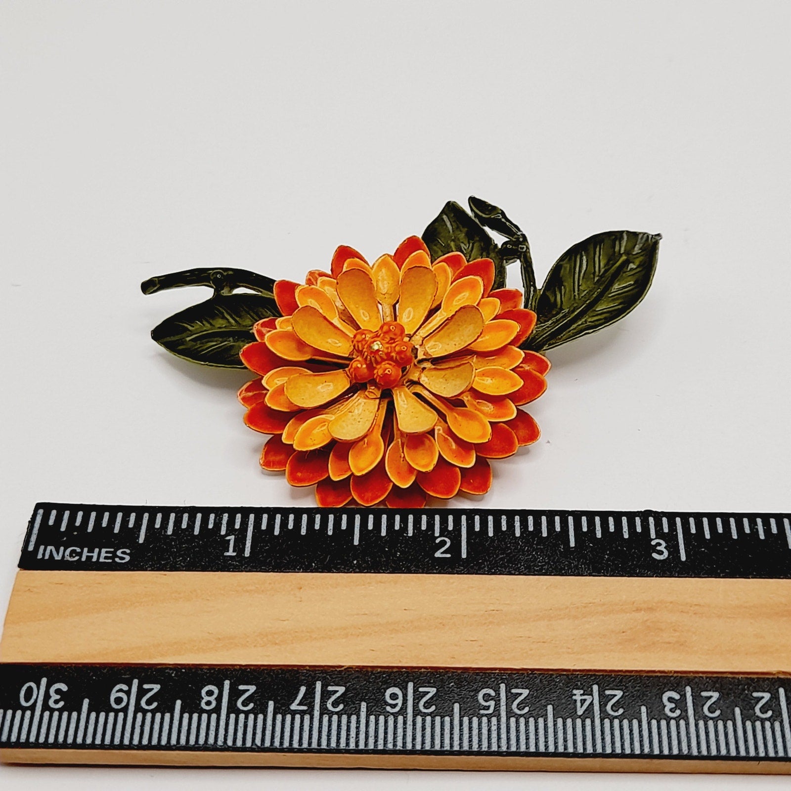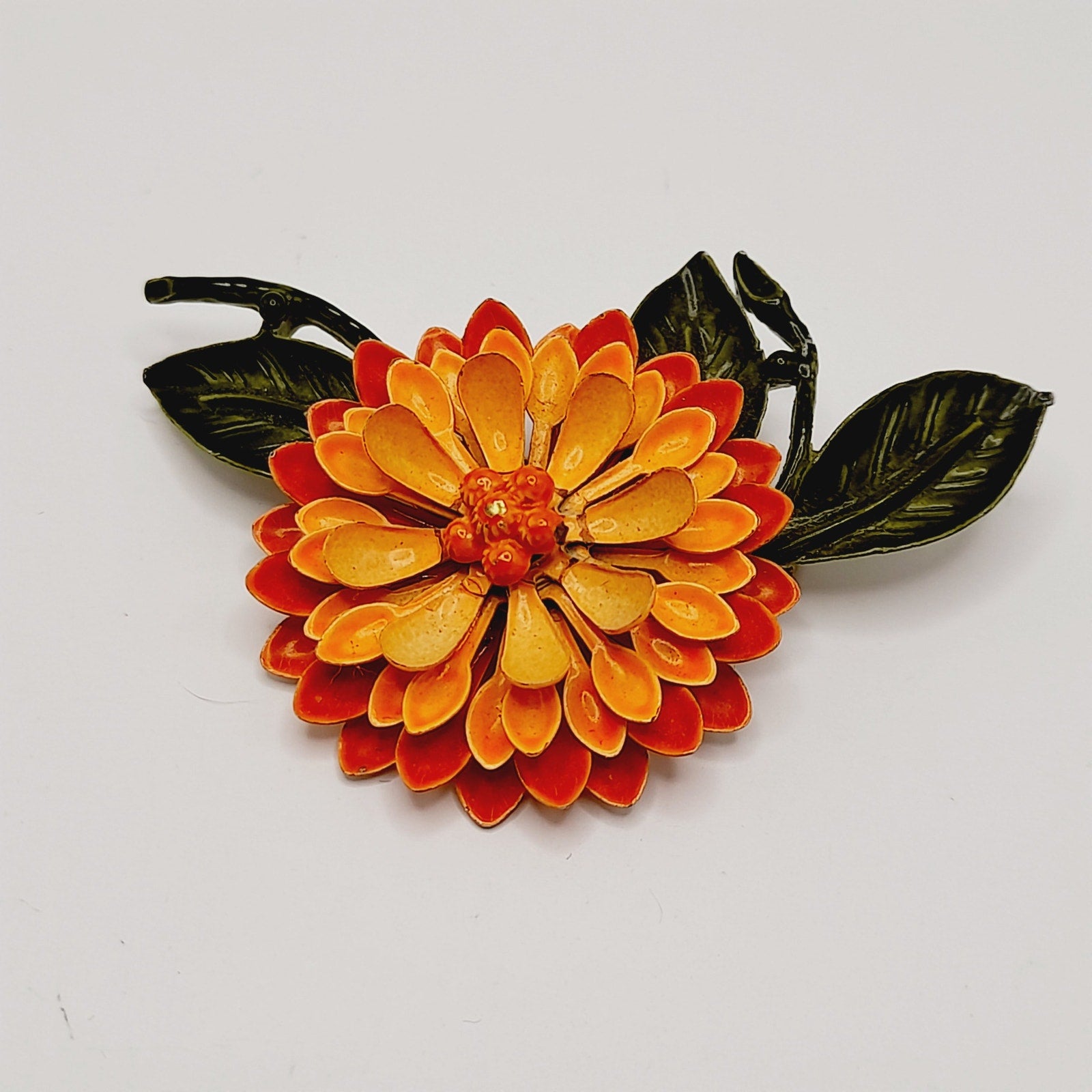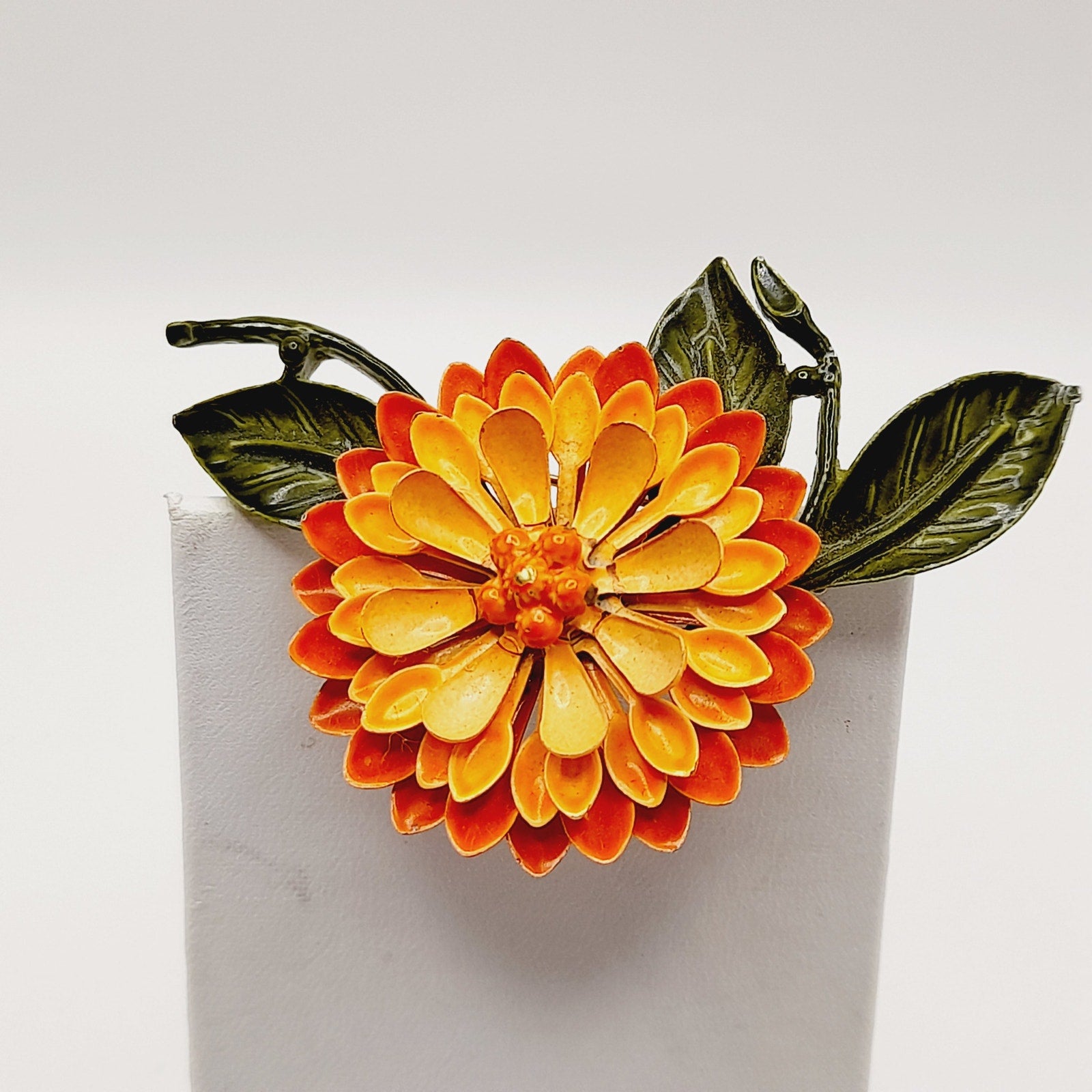Add a touch of vintage charm to your outfit with this beautiful 1960s brooch! The vibrant orange and green enamel flower design is sure to catch the eye and brighten up any look.