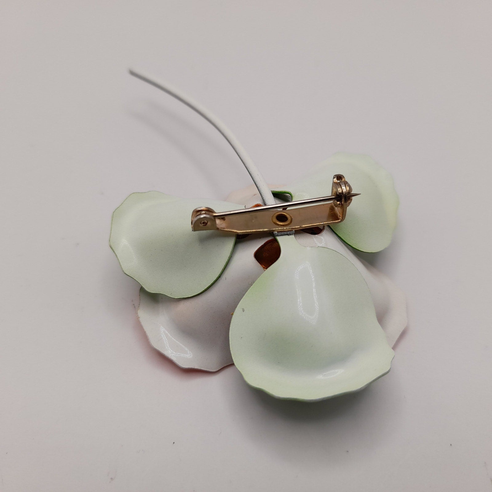 Vintage 1960s Orange Green White Enamel Flower Brooch with Stem, 4 Inches