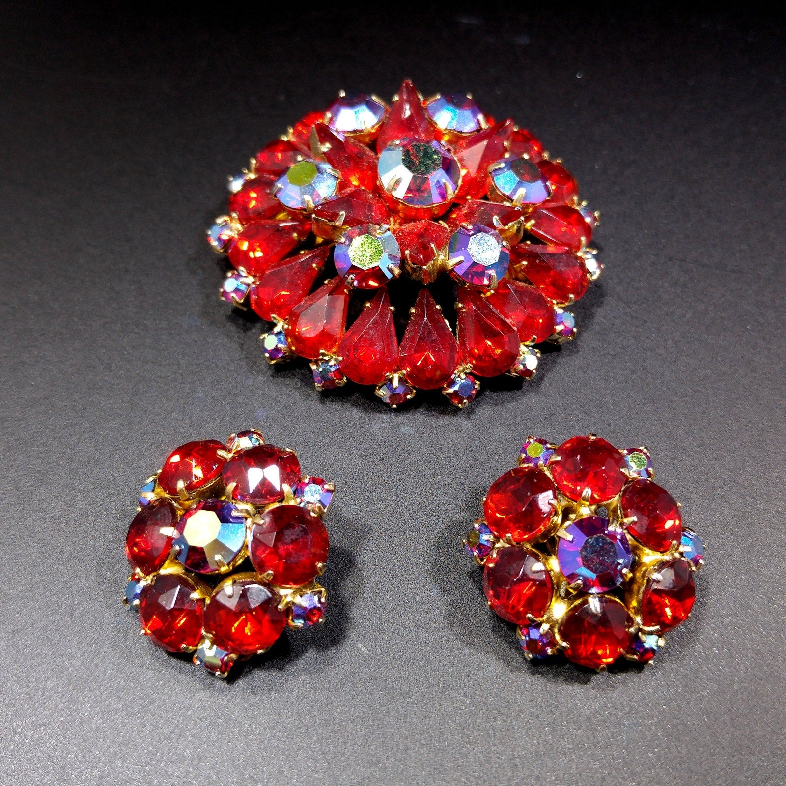 This is a vintage mid-century rhinestone jewelry set from the 1960s, featuring a dazzling ruby red and red aurora borealis brooch with matching clip-on earrings. The stones are brilliant and beautifully reflect hues of red, blue, and violet, depending on the light — a classic hallmark of aurora borealis (AB) coated rhinestones.
