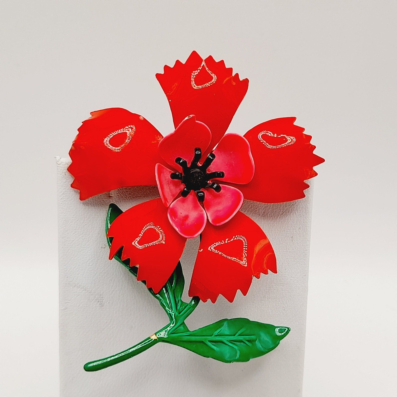 Add a touch of vintage charm to your outfit with this stunning 1960s red and green enamel flower brooch! This eye-catching piece features a beautiful floral design with vibrant red and green enamel detailing. Perfect for pinning on a jacket, scarf, or bag, this brooch is sure to turn heads and add a pop of color to any ensemble. Don't miss out on this unique vintage treasure!