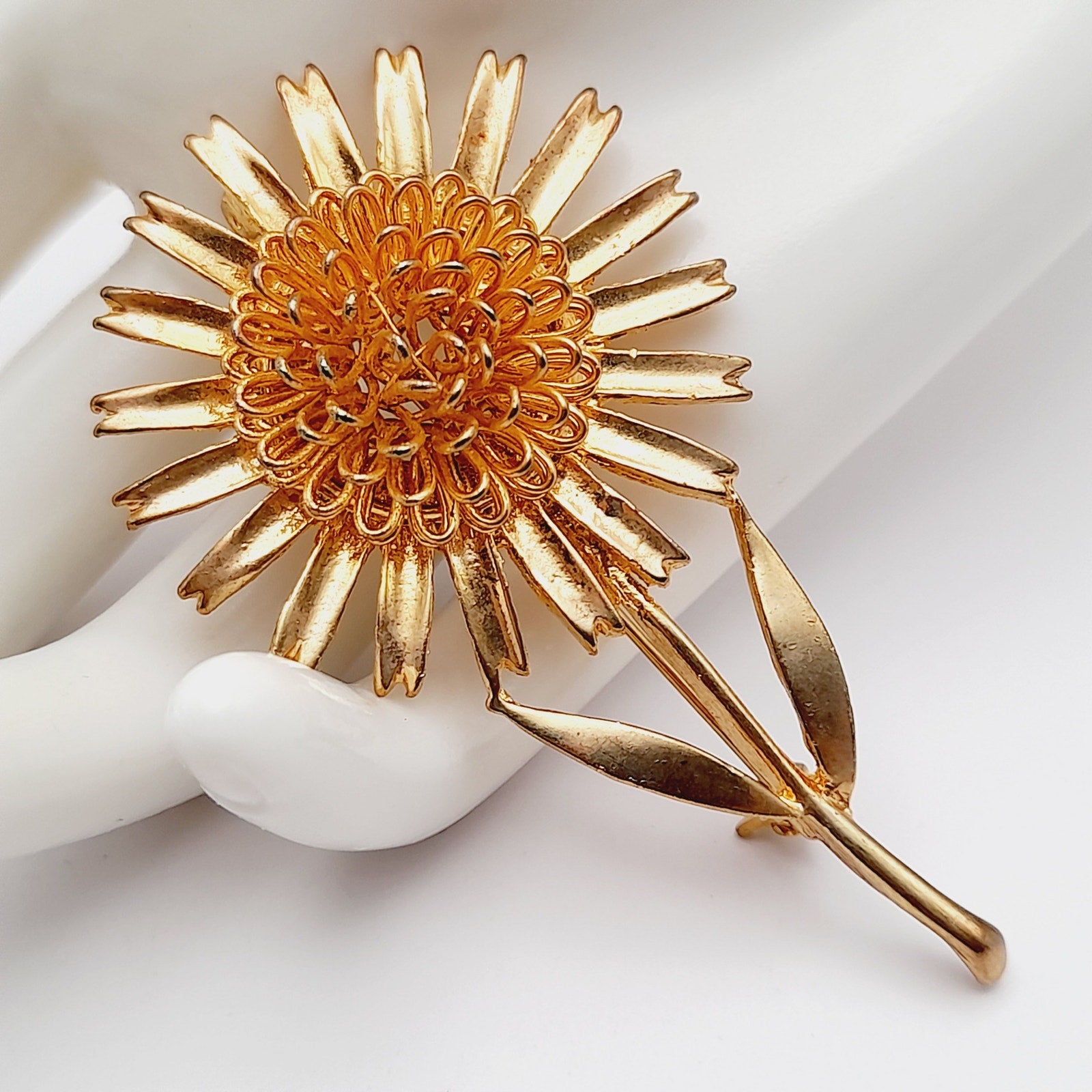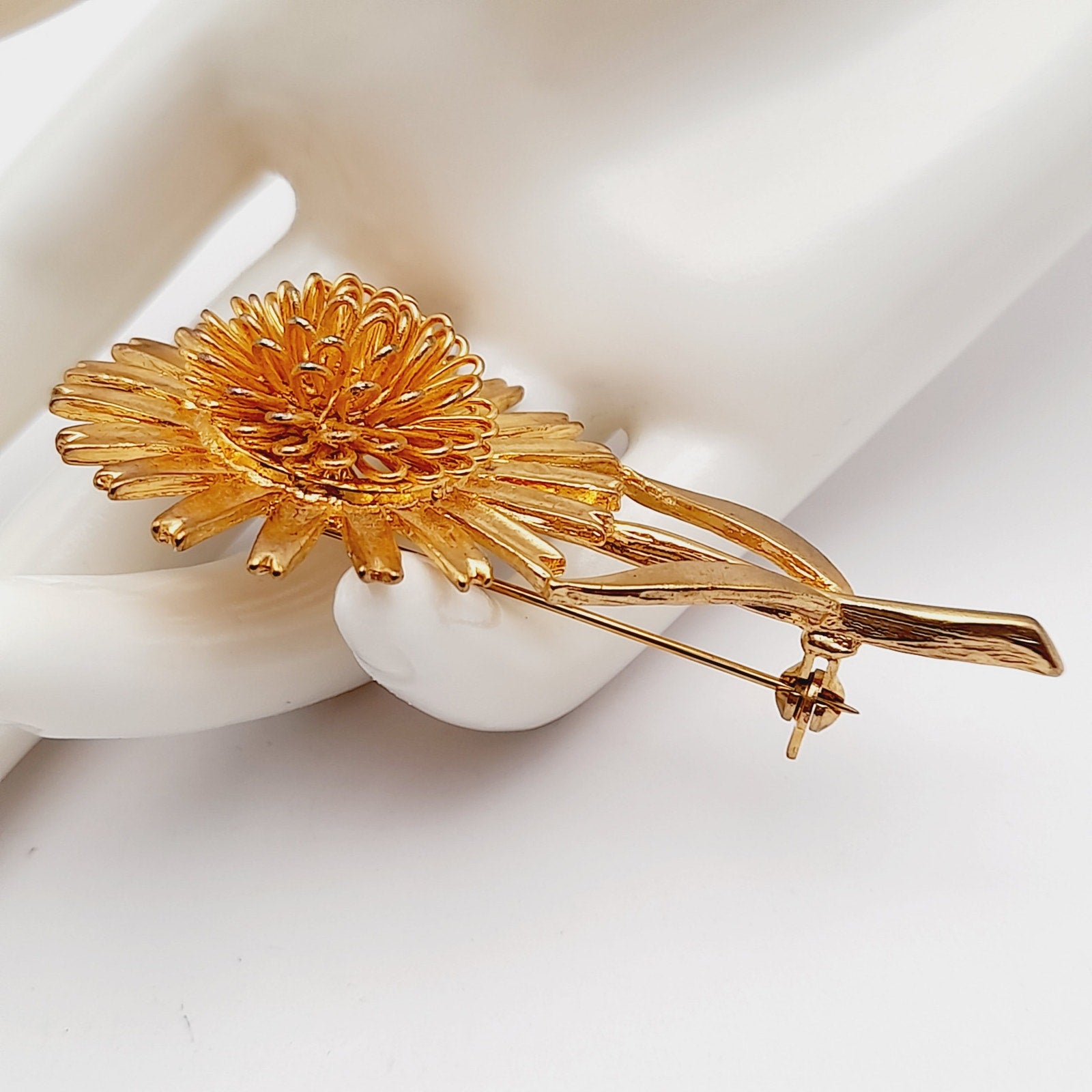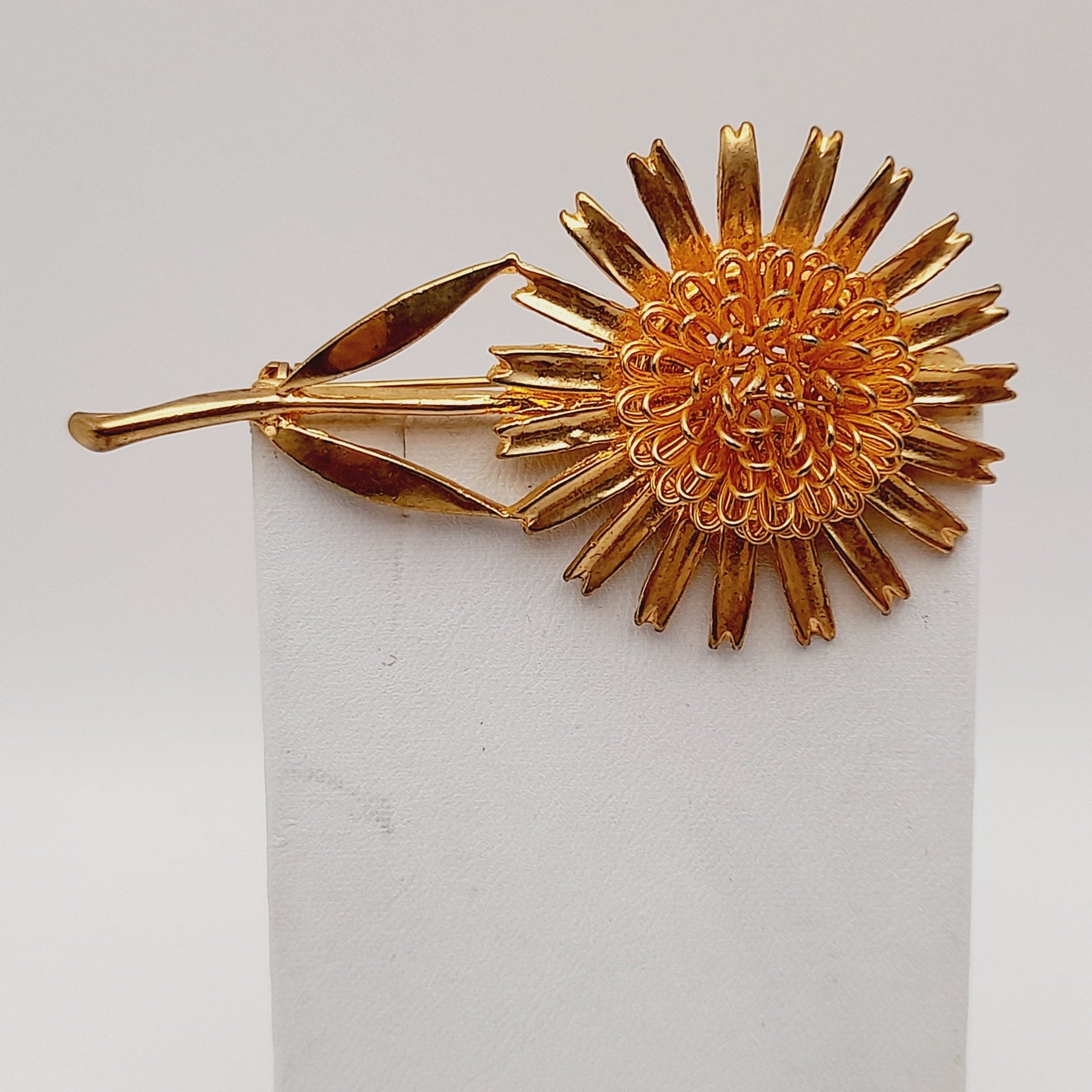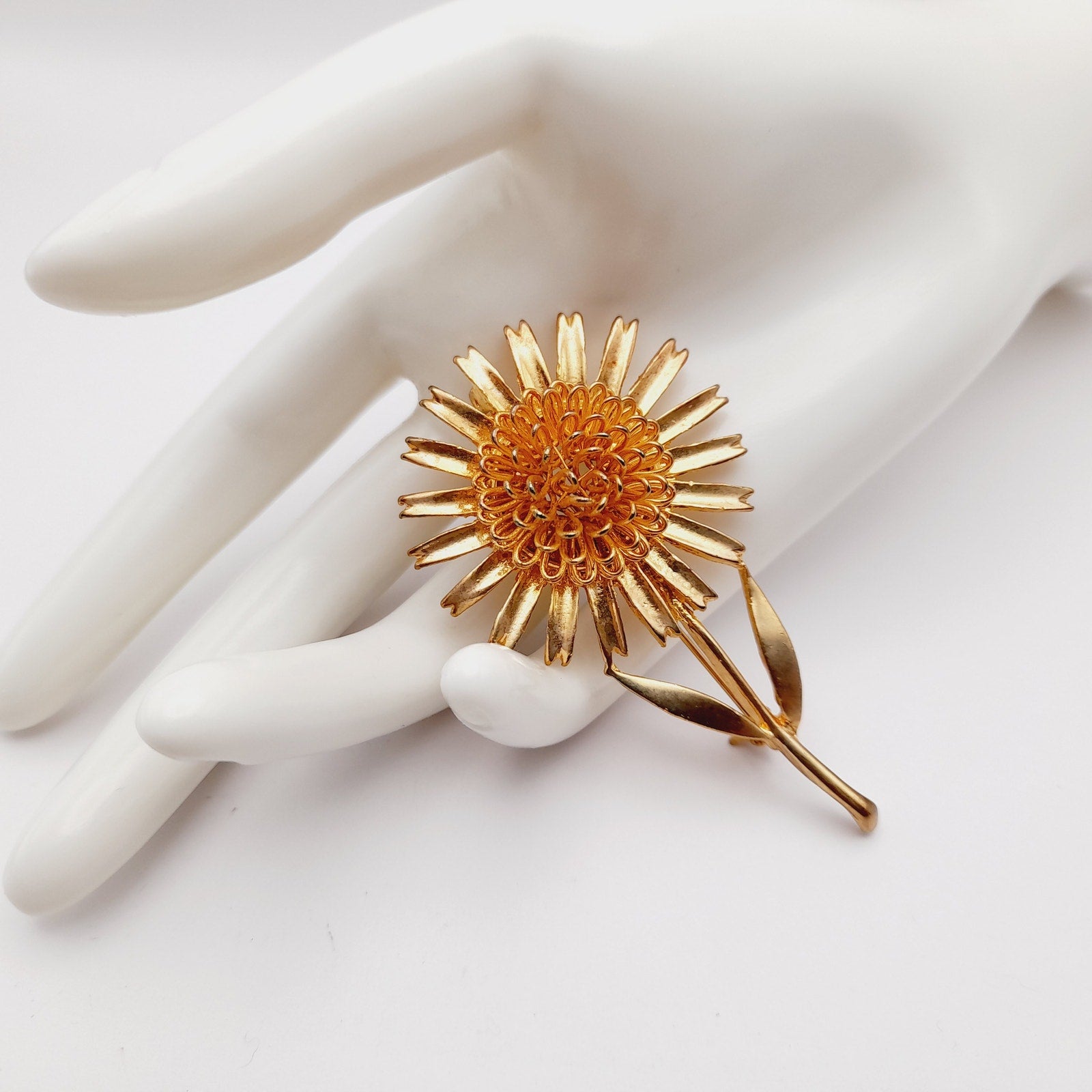 Brighten up any outfit with this cheerful vintage 1970s daisy brooch in a rich gold tone finish. The bold floral design features textured petals and a dimensional shape that captures the playful elegance of the 1970s era. Measuring a substantial 3 inches, this piece makes a striking statement on jackets, scarves, or hats. A lovely addition for vintage collectors or anyone who adores retro floral fashion. Excellent vintage condition with a secure pin clasp.