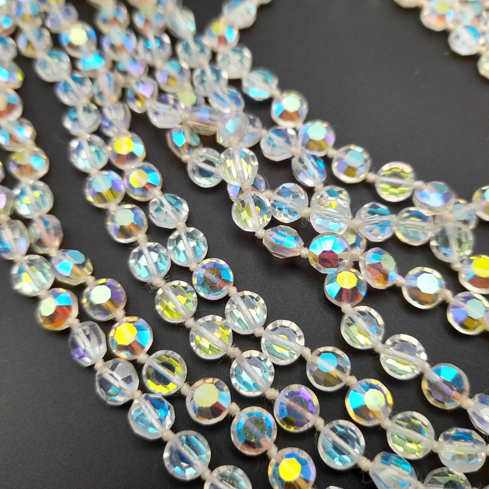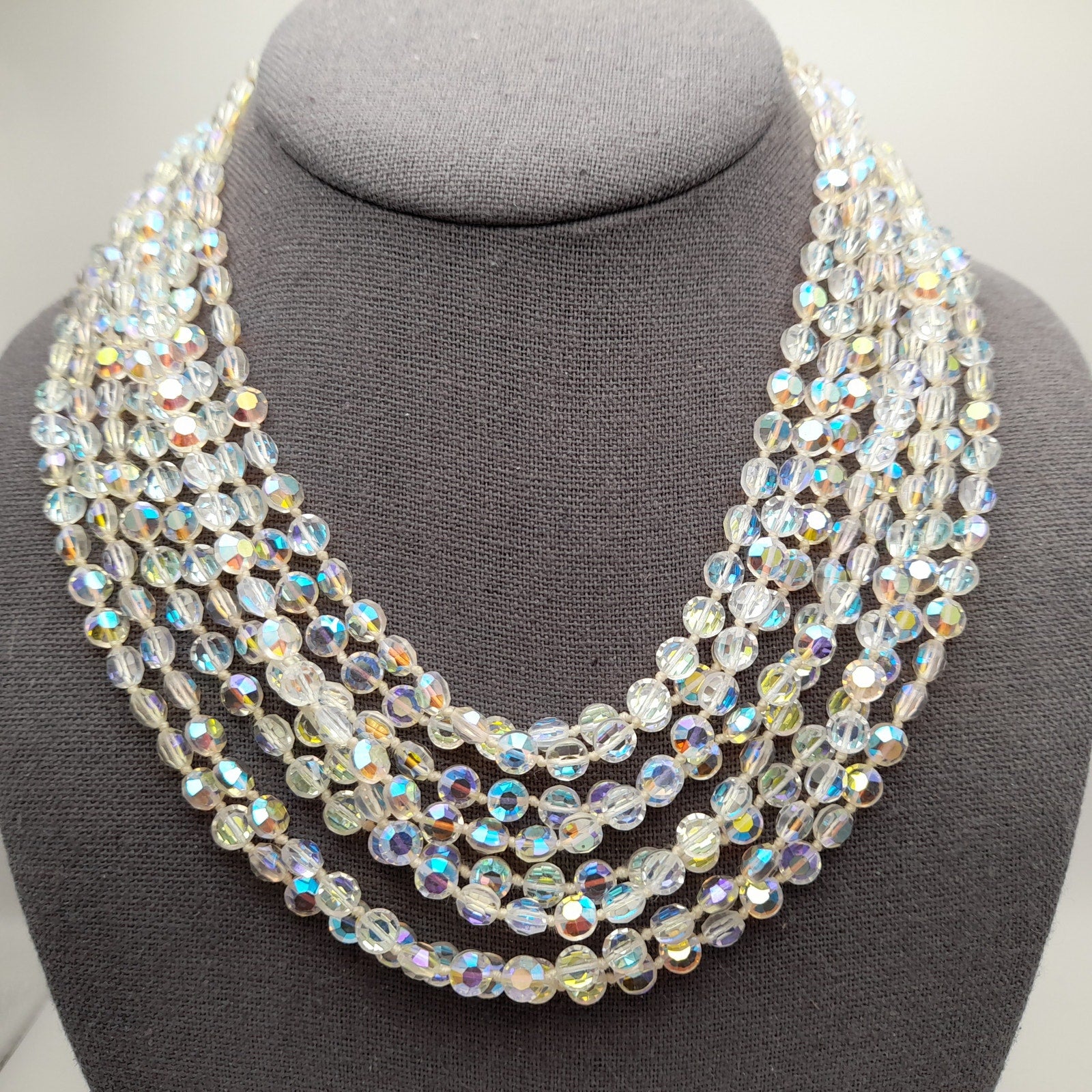 This exquisite vintage statement necklace features eight strands of sparkling Aurora Borealis crystals, beautifully hand-knotted and designed to catch and reflect light with every movement. The shimmering AB coating gives off dreamy pastel flashes of blue, pink, gold, and lavender — a hallmark of mid-century elegance.