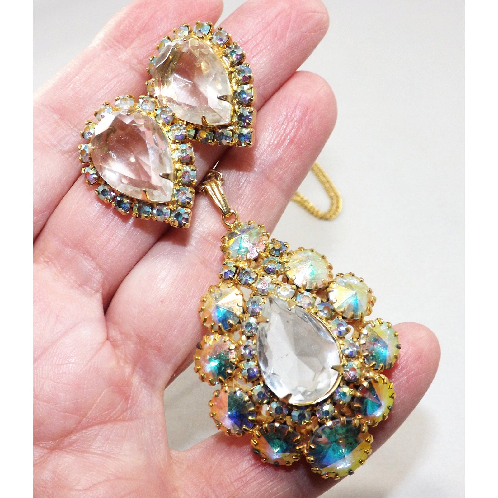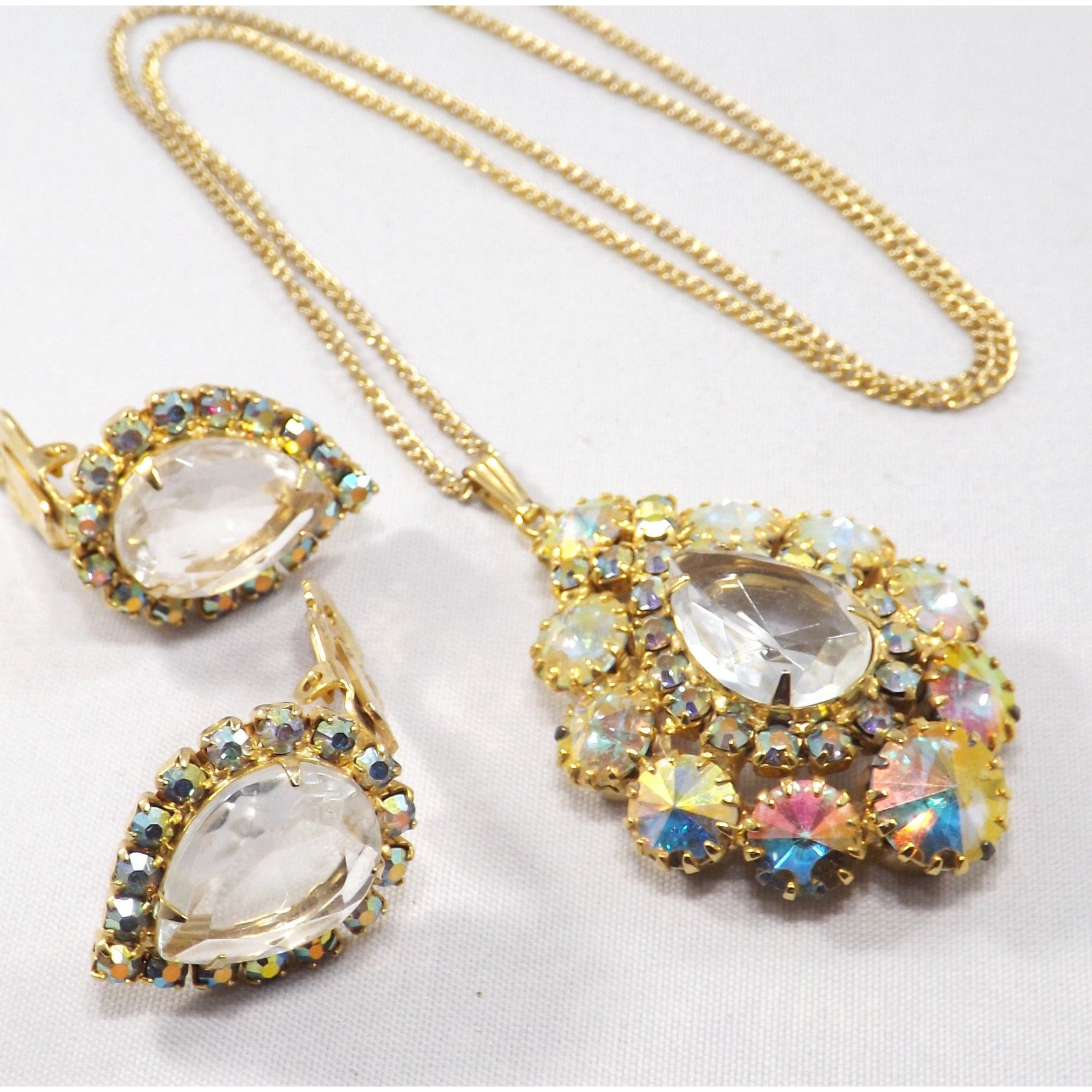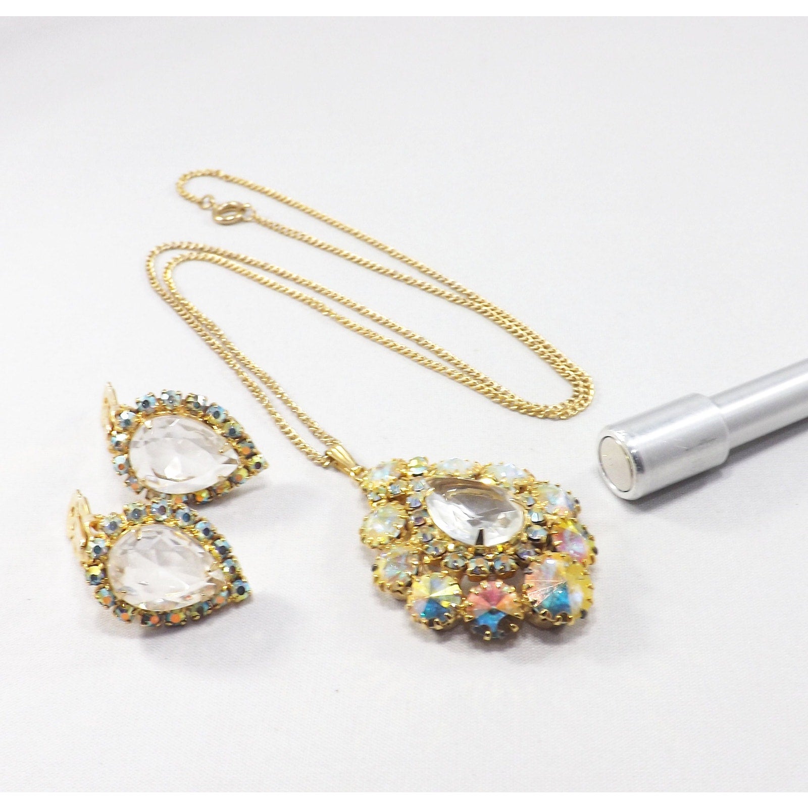 Vintage AB Pendant Necklace & Earrings, Rivoli Rhinestones, Gold Plated
