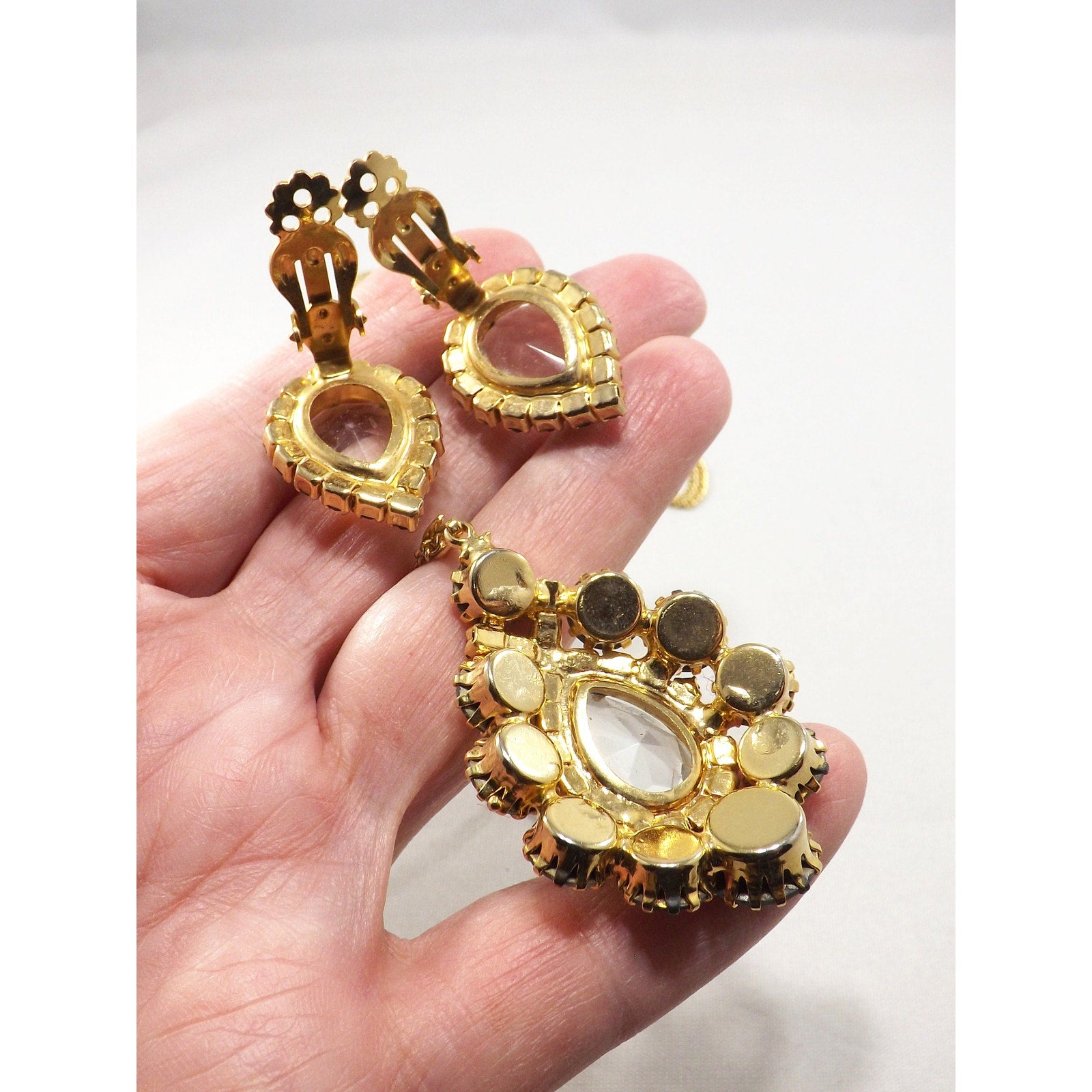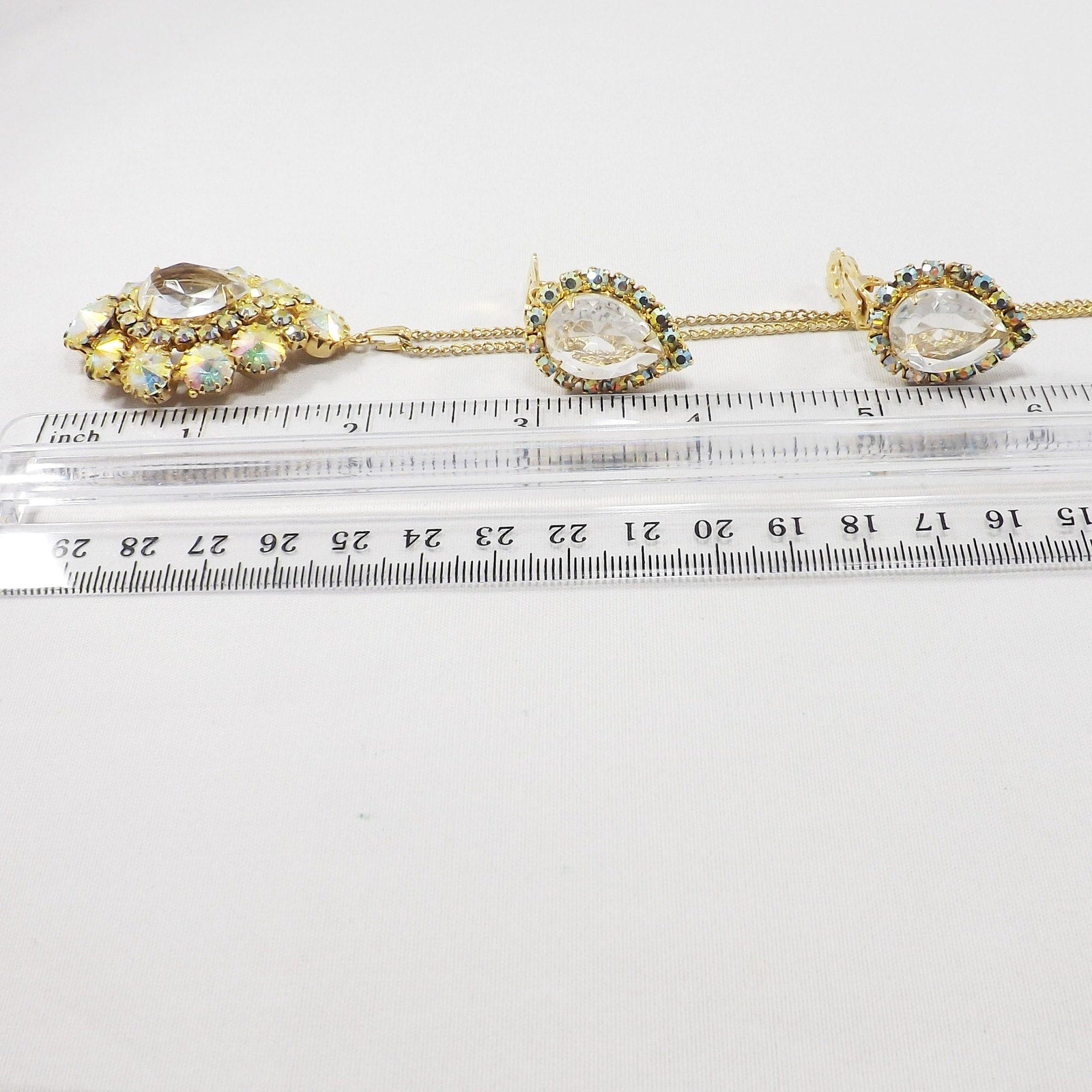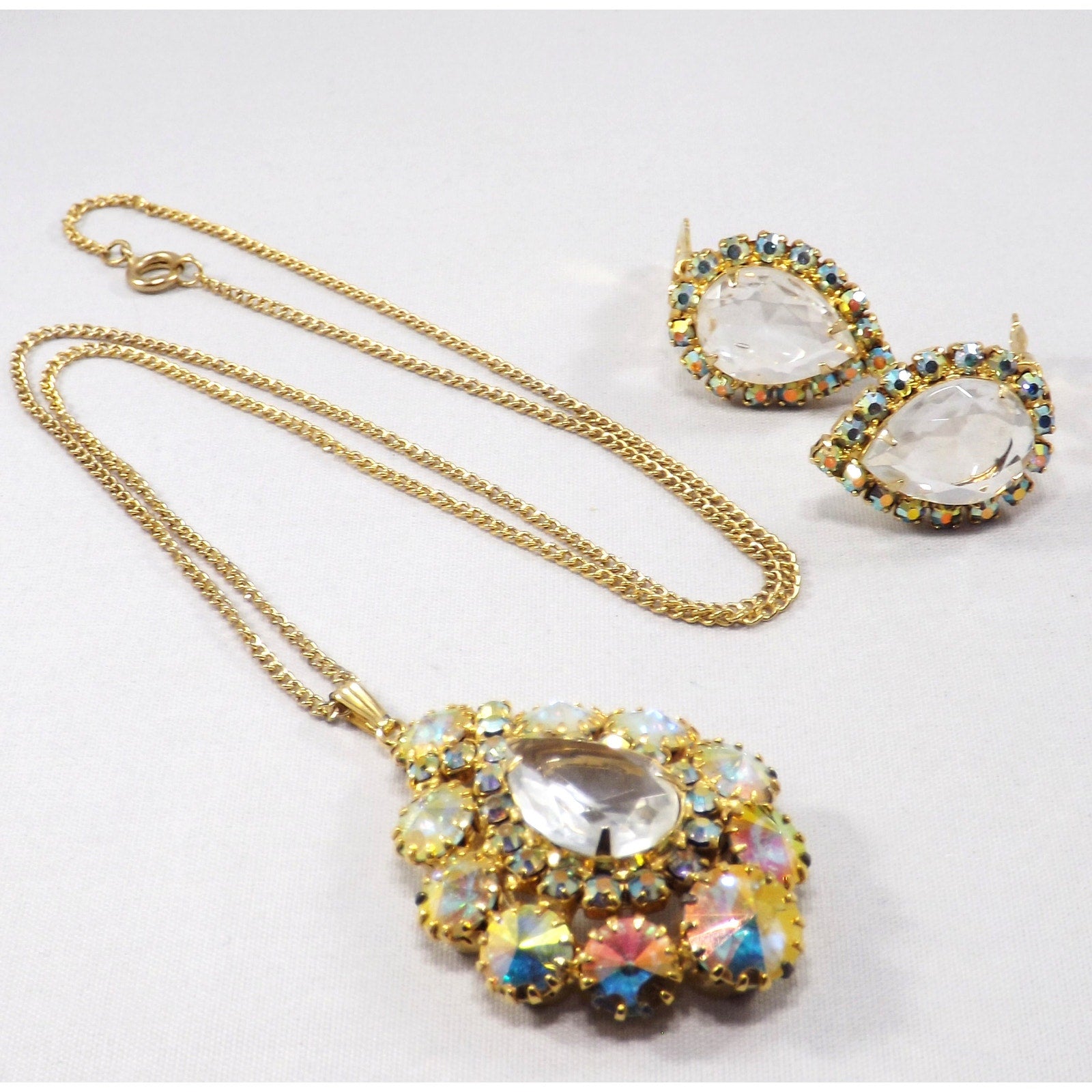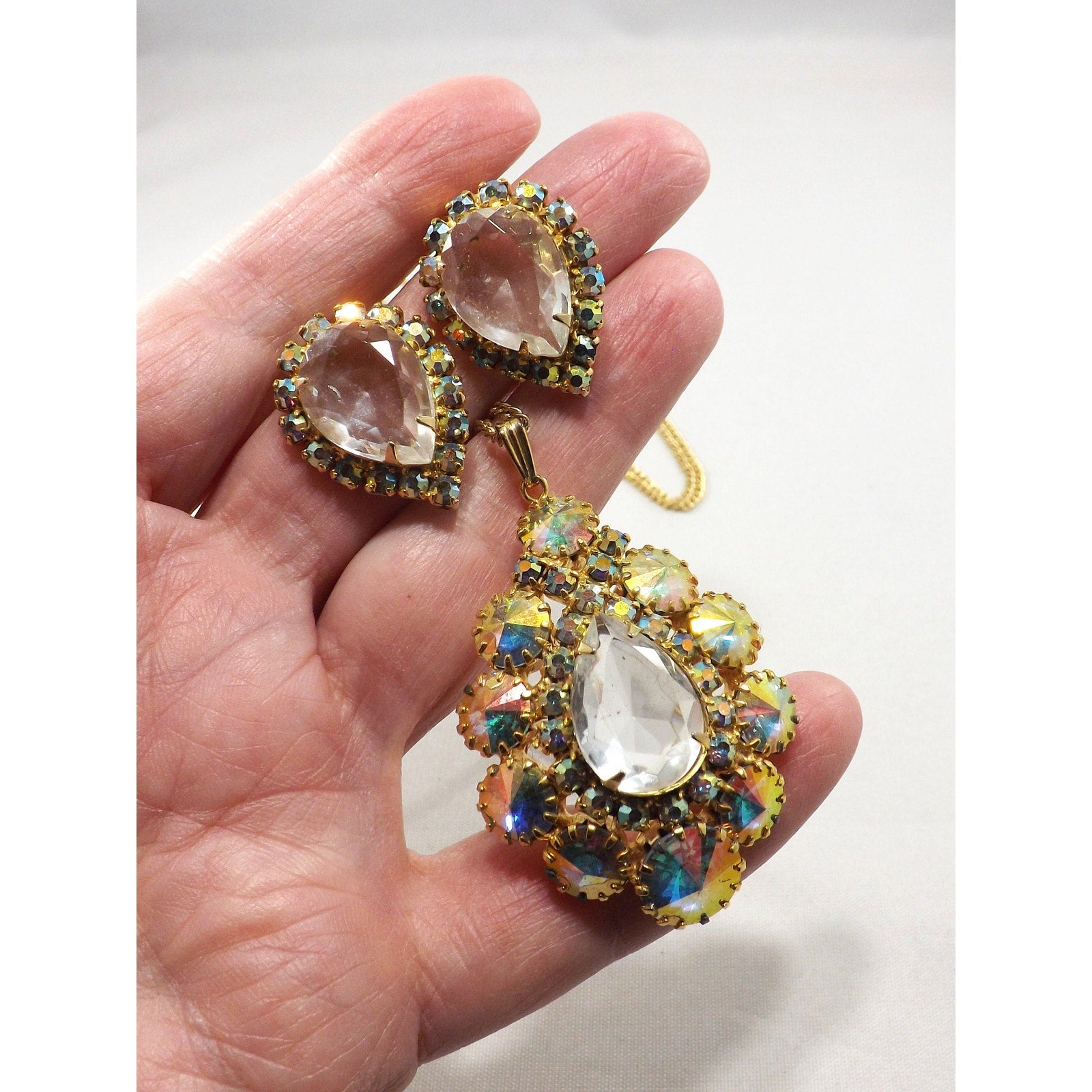 Vintage AB Pendant Necklace & Earrings, Rivoli Rhinestones, Gold Plated