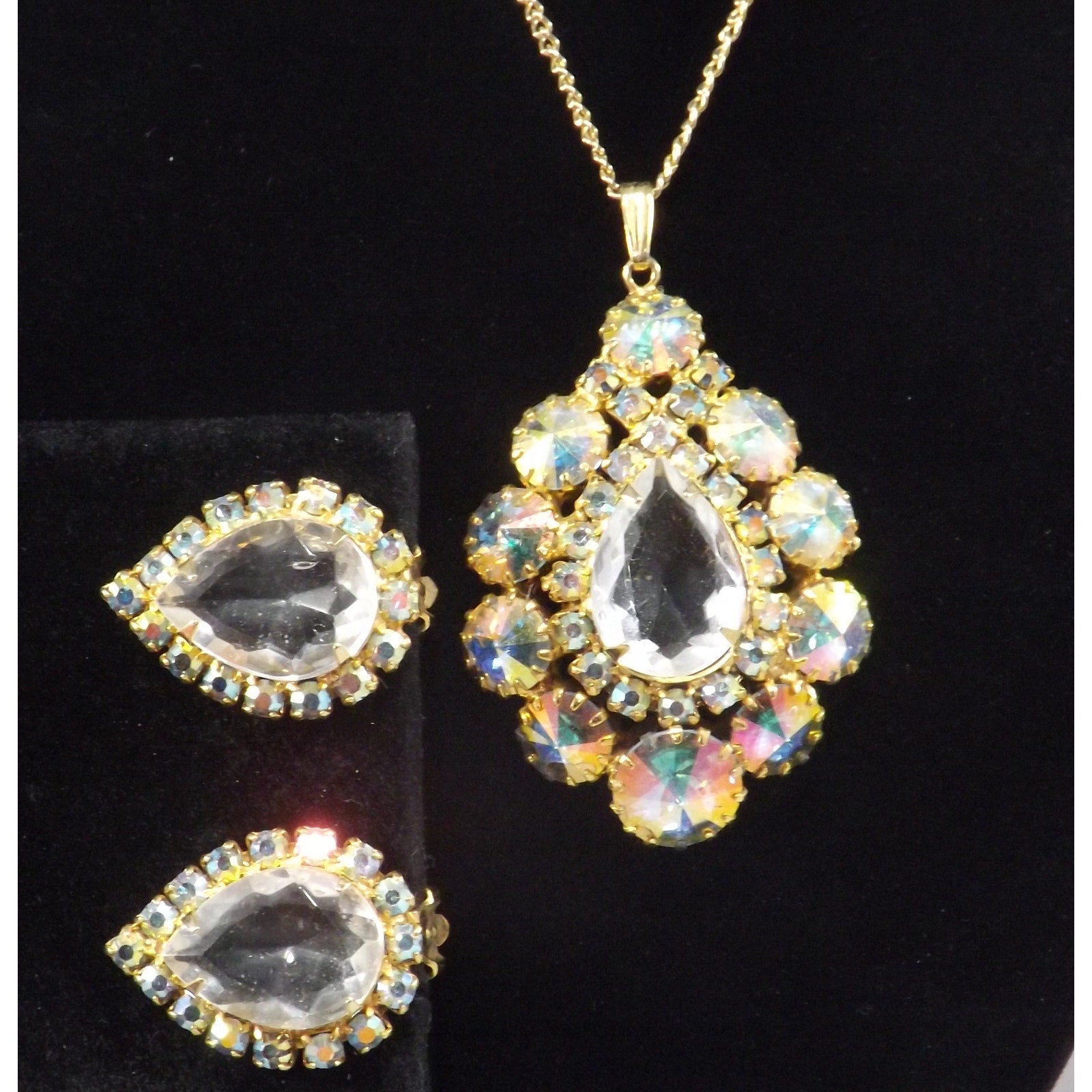 *Description: This is a gorgeous vintage set, Juliana style, gold plated pendant necklace and matching earrings with beautiful rivoli aurora borealis Swarovski rhinestones around the edges of the pendant, dog-toothed, and prong set. The matching earrings have the clear faceted teardrop rhinestone open-back center surrounded by aurora borealis chatons. The pendant has a 24 inch chain with a spring ring clasp. The earrings are clip and all are unsigned. It is a gorgeous set and would make an excellent gift or wonderful addition to your vintage jewelry collection.