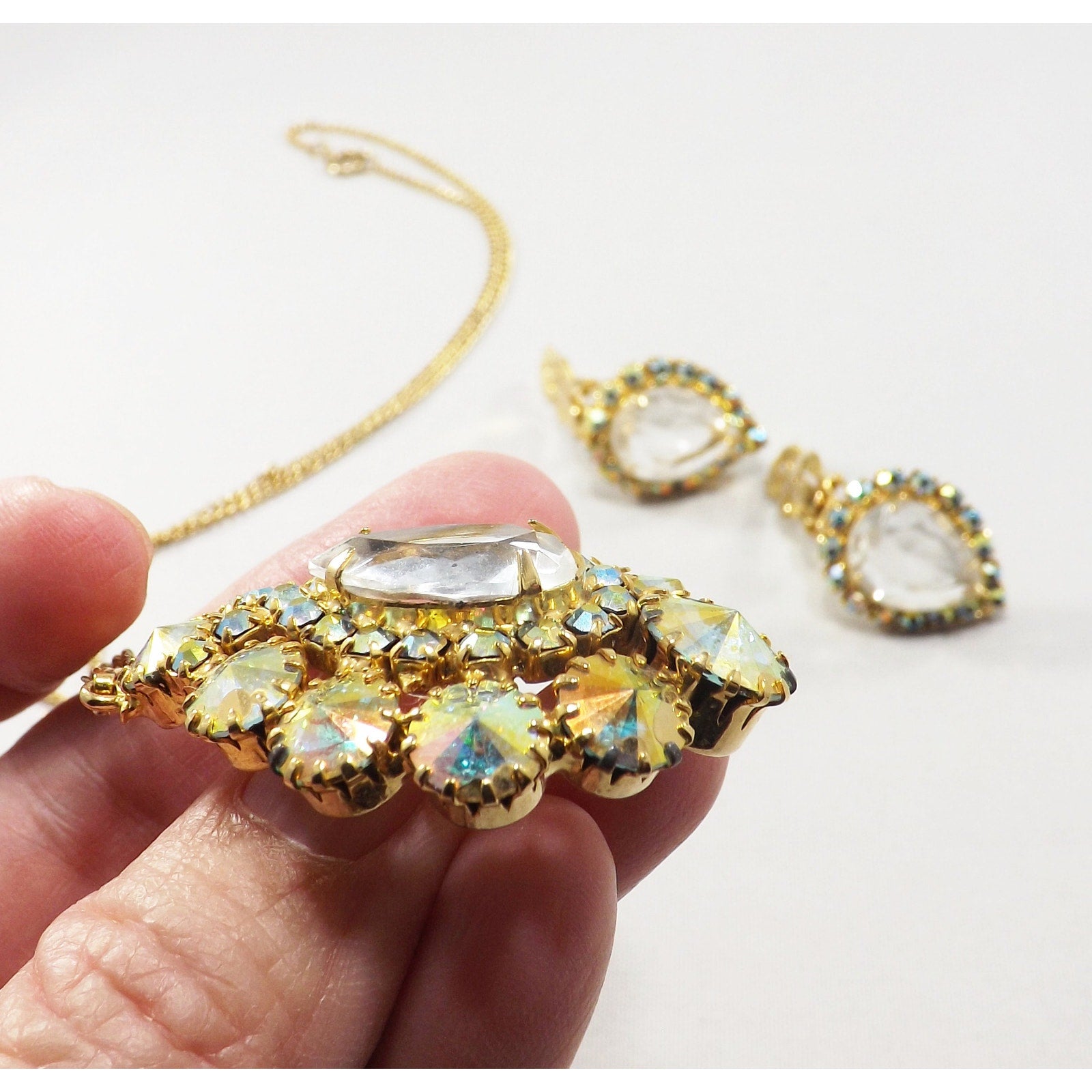 Vintage Aurora Borealis Pendant Necklace & Earrings Rivoli Rhinestones Pendant Gold Plated Clear Faceted Centers 1960s Vintage Jewelry Gift