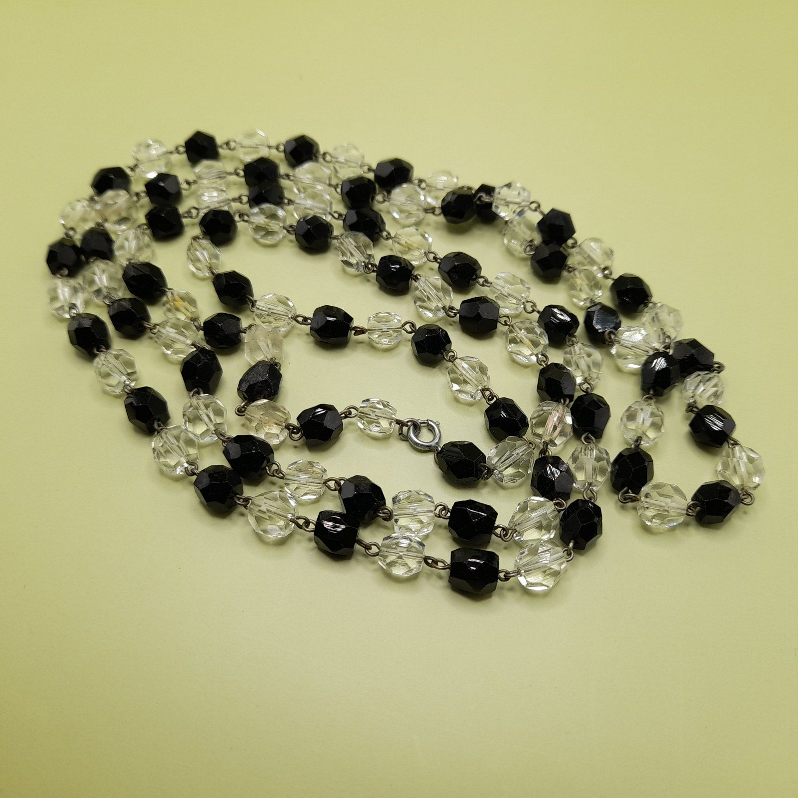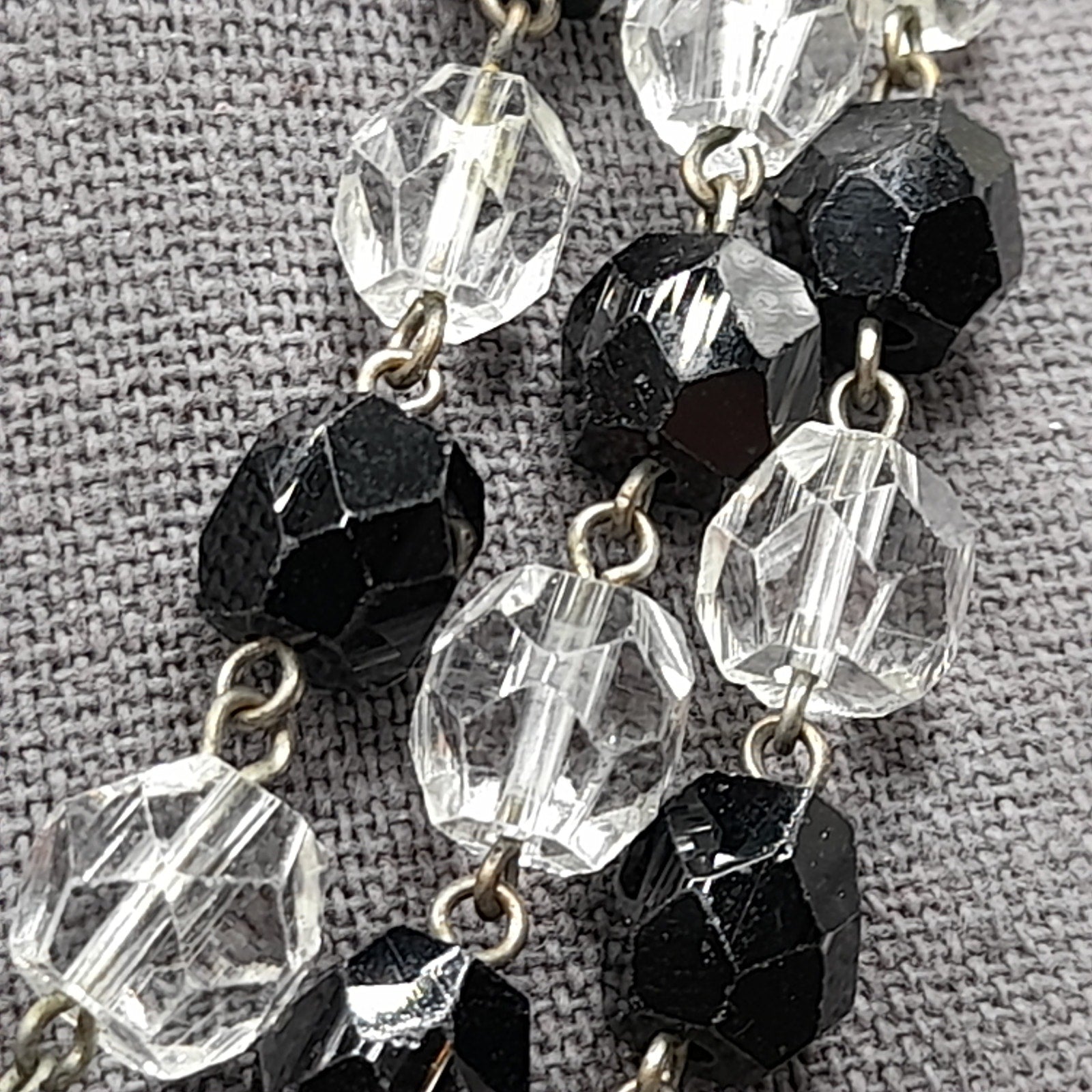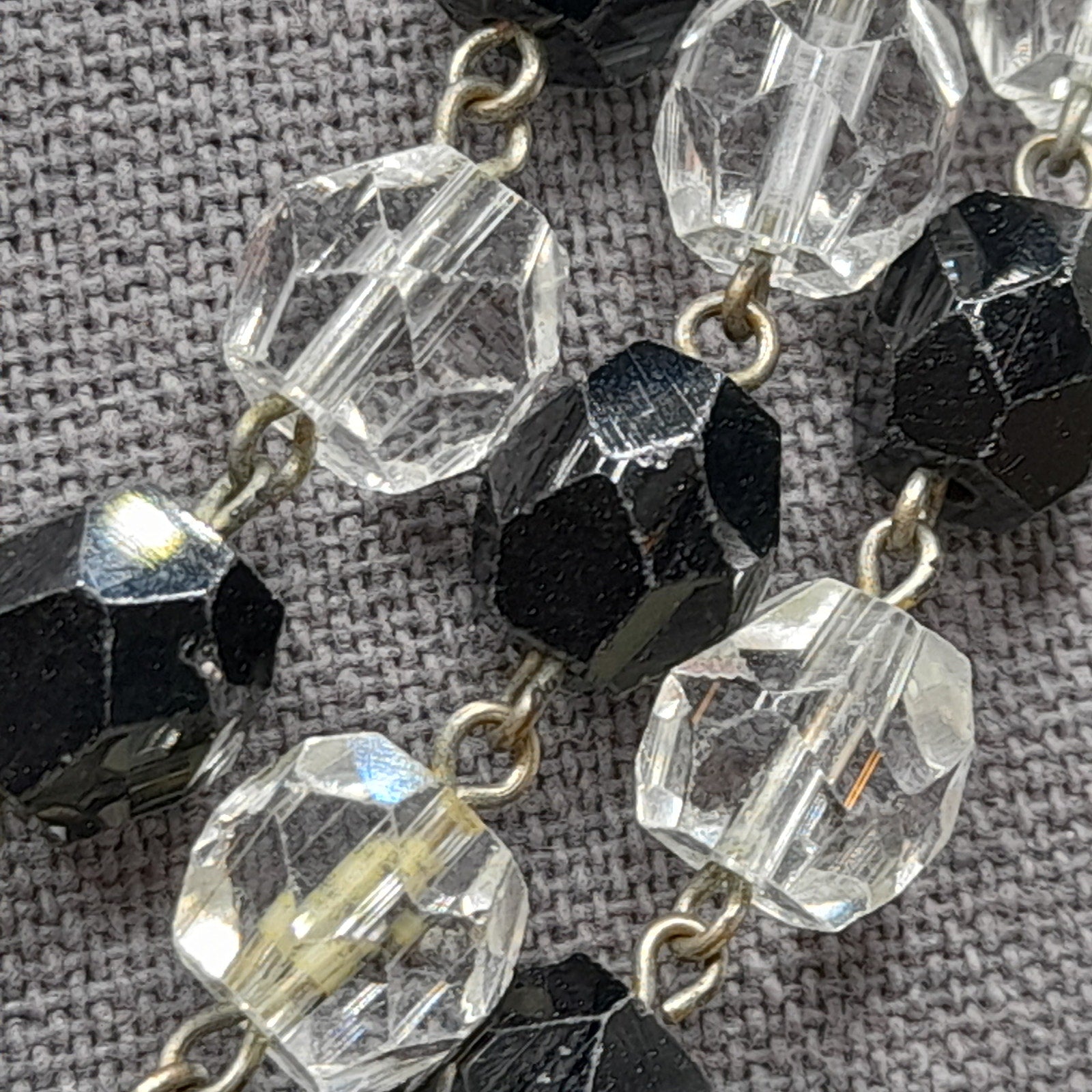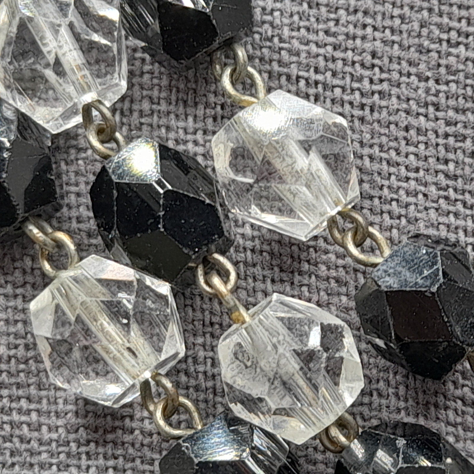 This elegant Art Deco-style black and clear faceted crystal necklace dates to the 1920s–1930s and features a striking design of alternating glass beads wire-wrapped together. Its extra-long 53-inch length allows for versatile styling — wear it single, doubled, or layered for a true vintage flapper look.