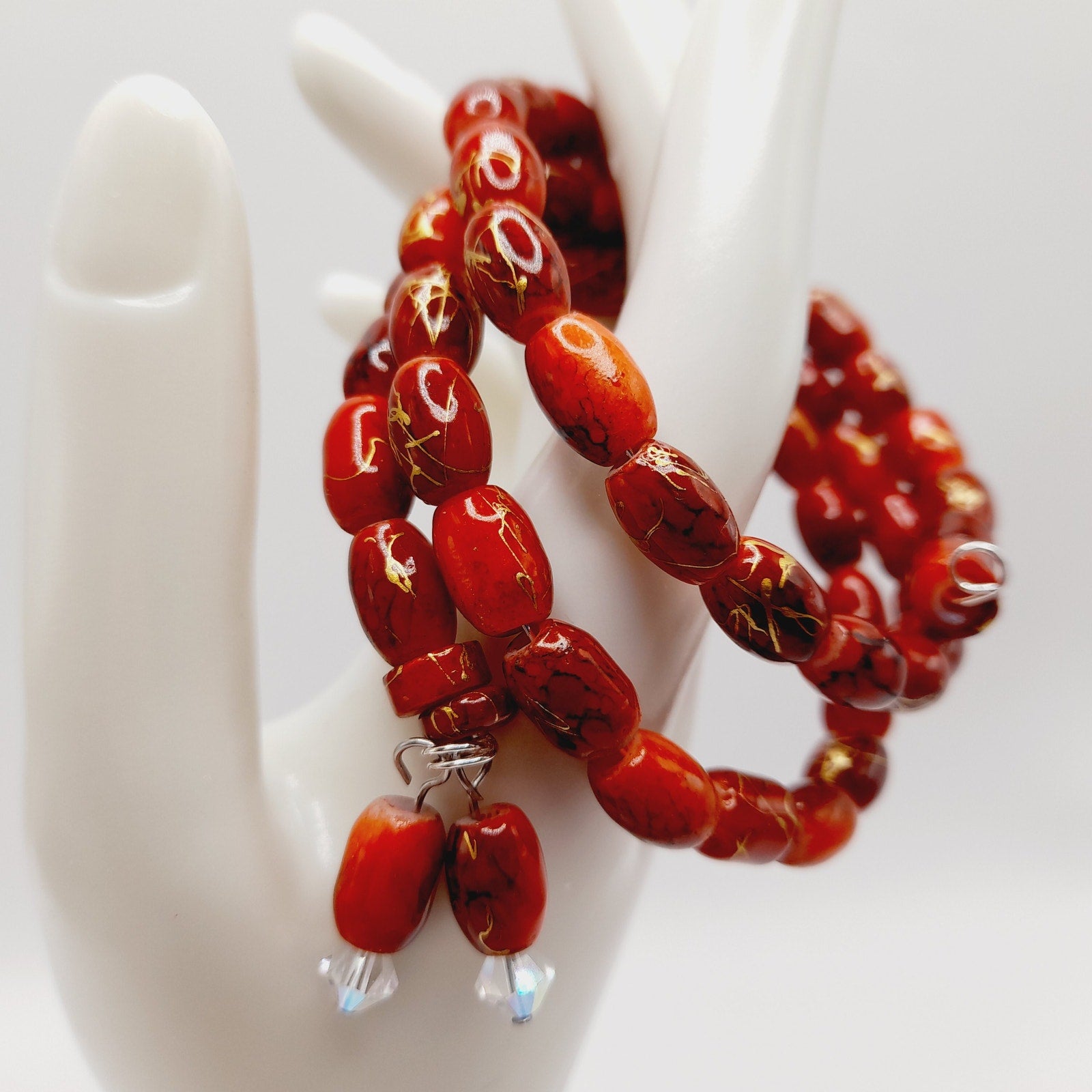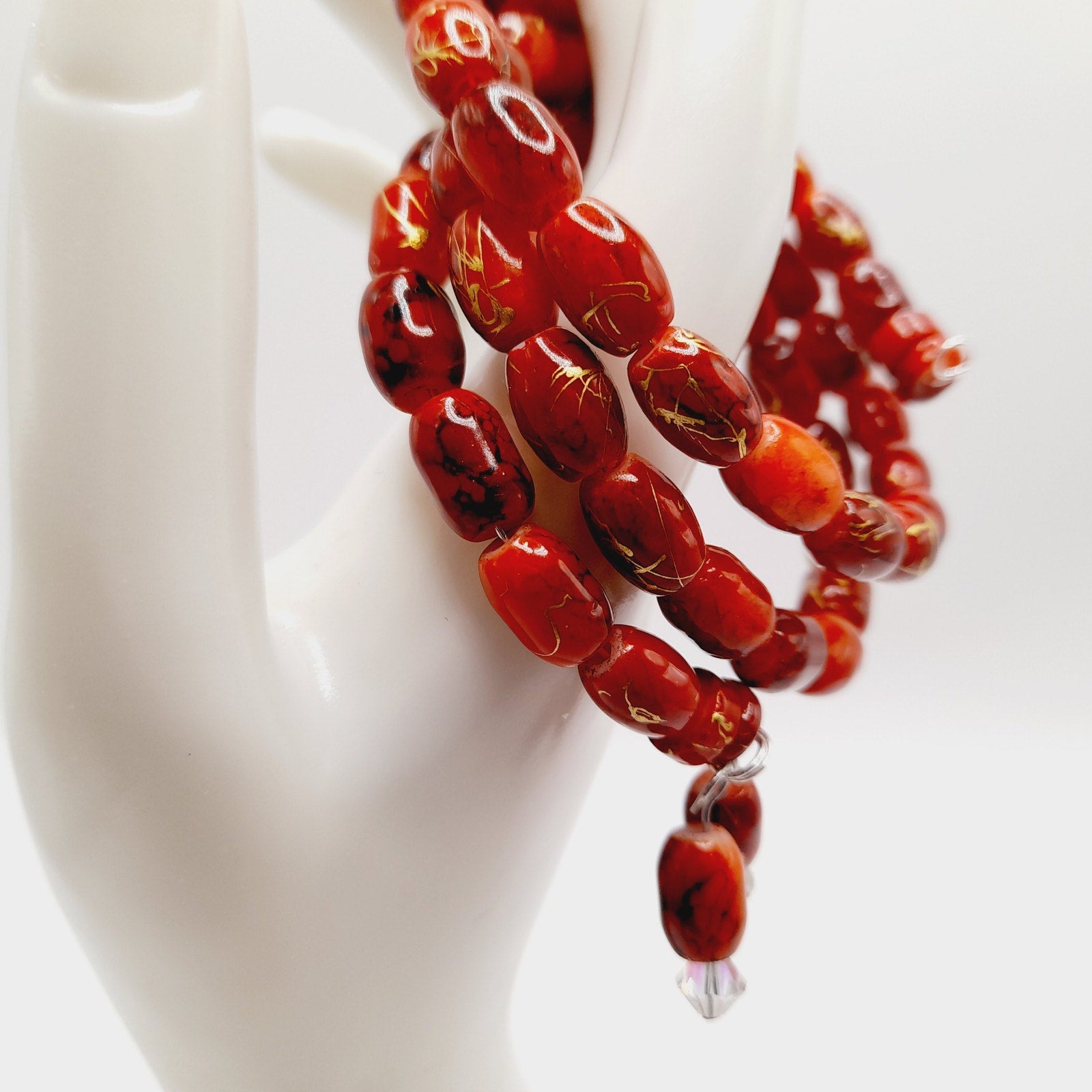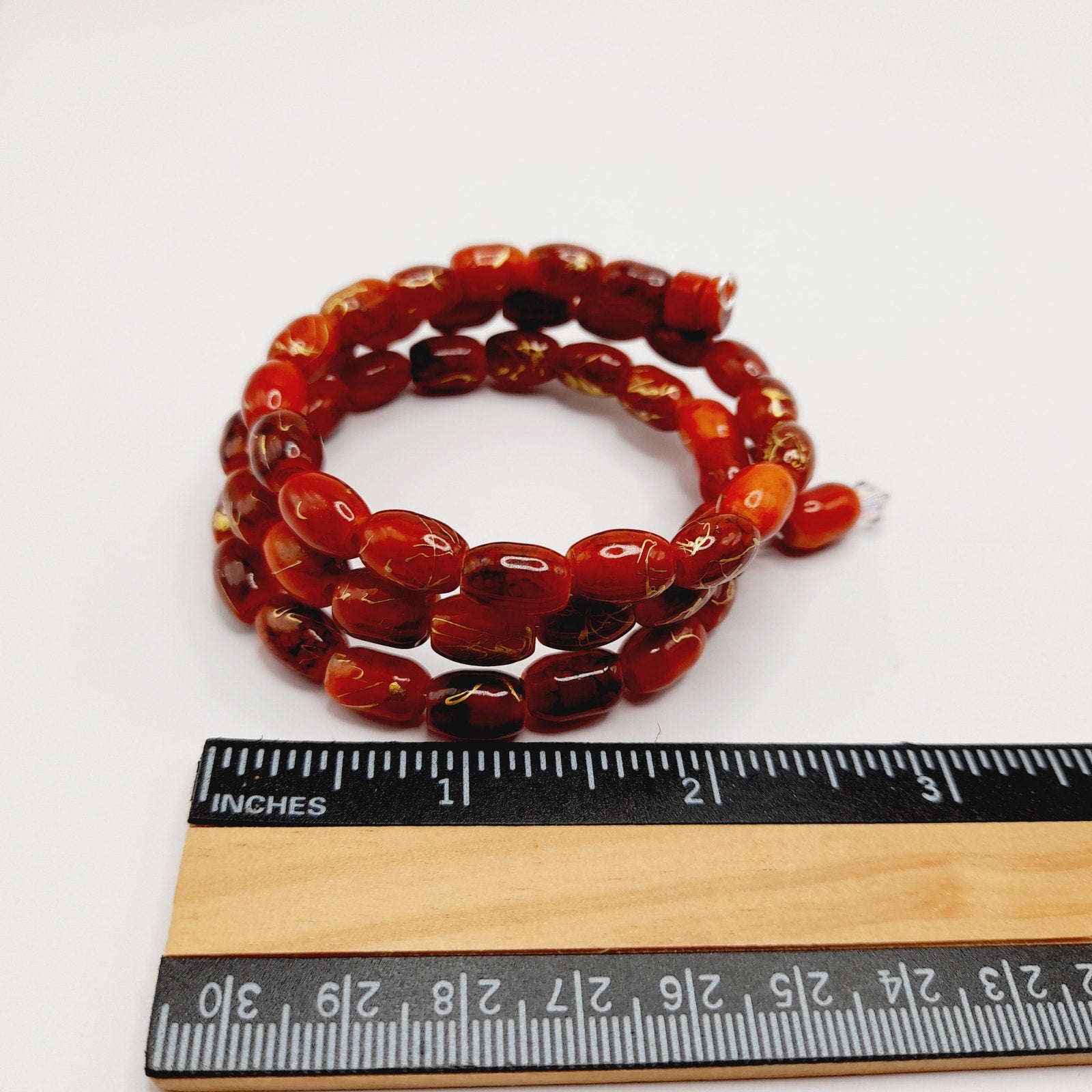 Add a bold statement to your jewelry collection with this handmade vintage-inspired memory wire bracelet featuring Asian-themed red glass beads accented with delicate gold detailing. The vibrant oval beads are carefully strung on flexible memory wire, allowing the bracelet to wrap comfortably around most wrist sizes without the need for a clasp.