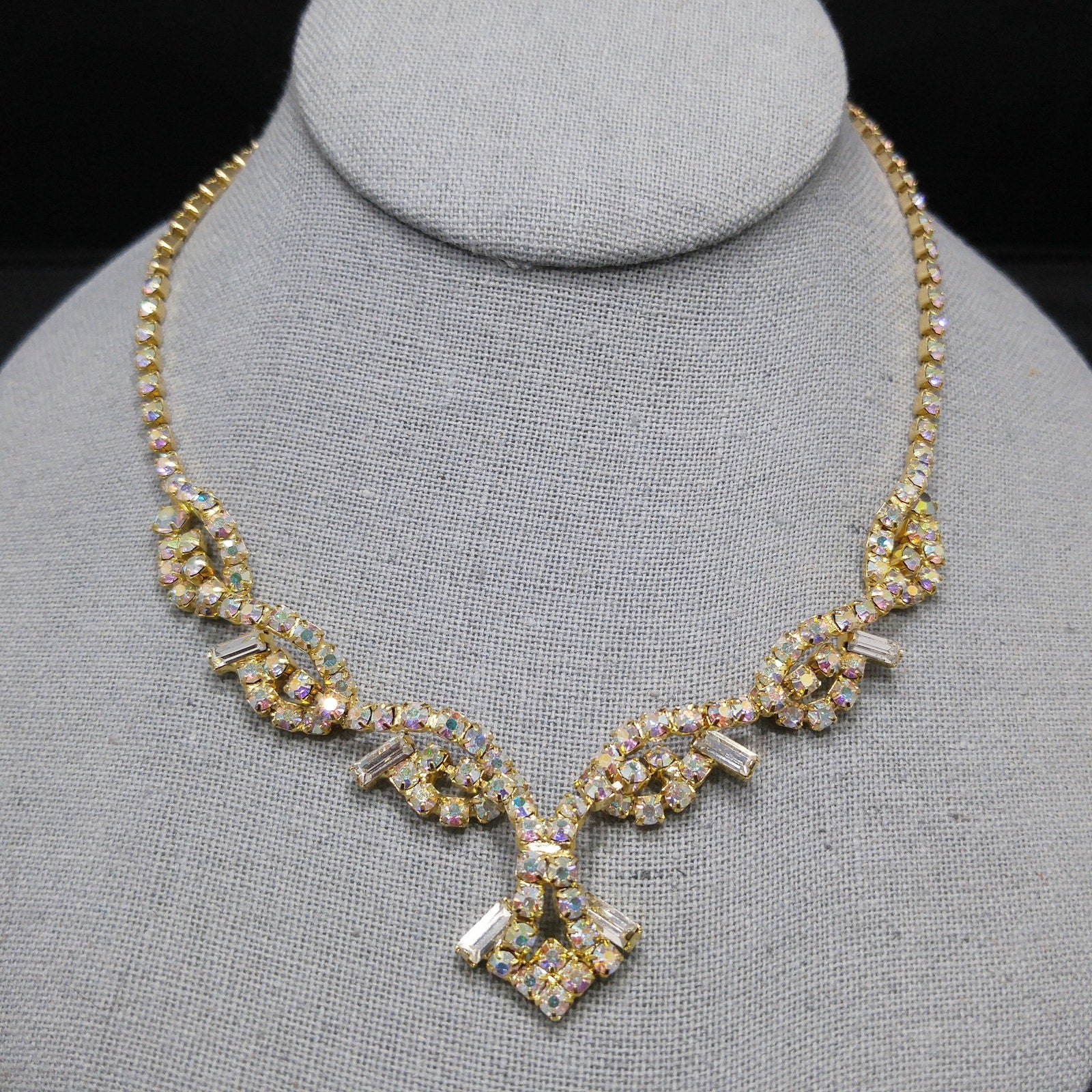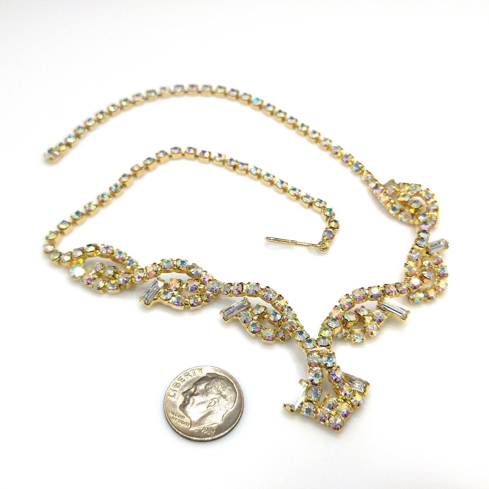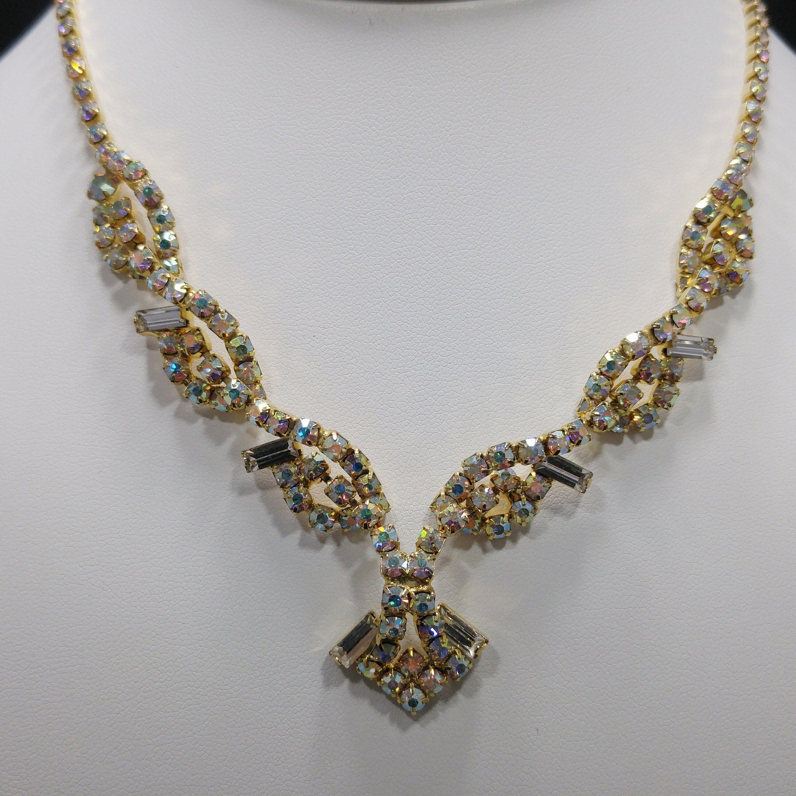 *Description: This is a beautiful vintage aurora borealis choker necklace with a combination of clear baguette rhinestones and aurora borealis chaton cut rhinestones which give the front of the necklace a three dimensional look from the 1960s. The necklace is gold plated and has a hook to allow you to adjust the length up to 15 1/2 Inches. It is a beautiful necklace and would be lovely for any special occasion. This would be a great addition to your vintage jewelry collection or make a great vintage gift!
