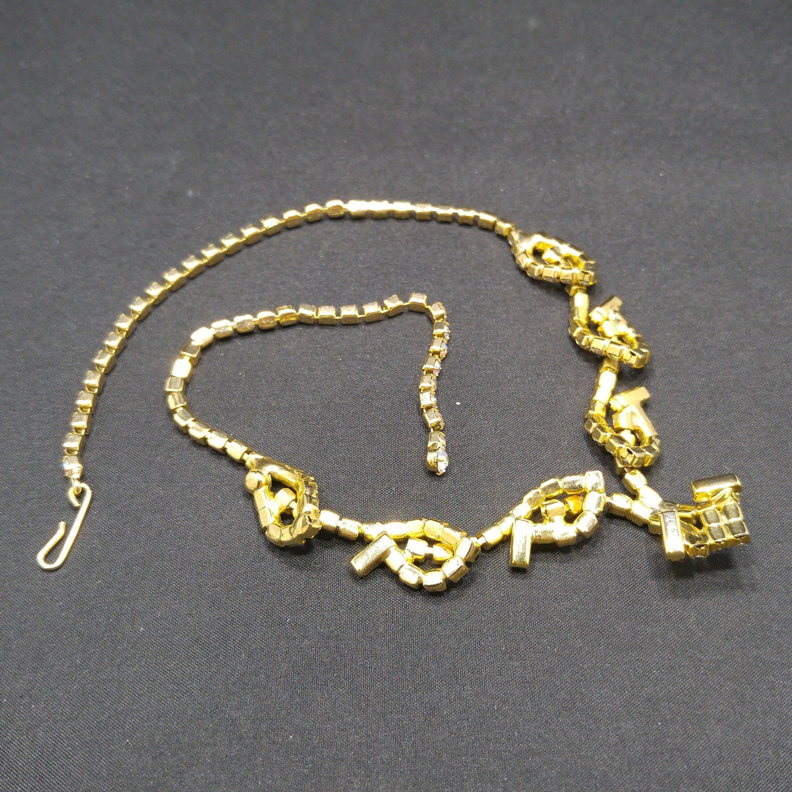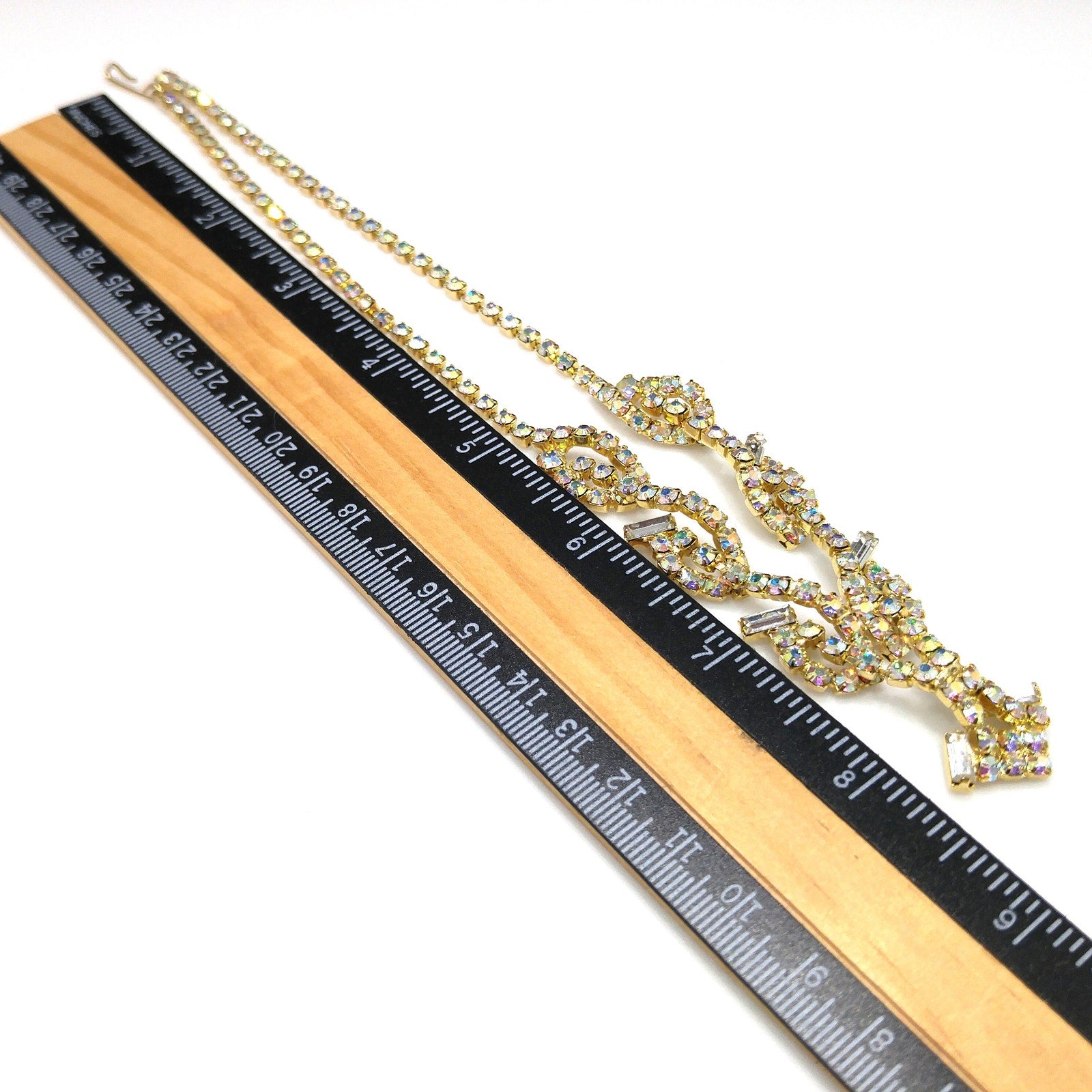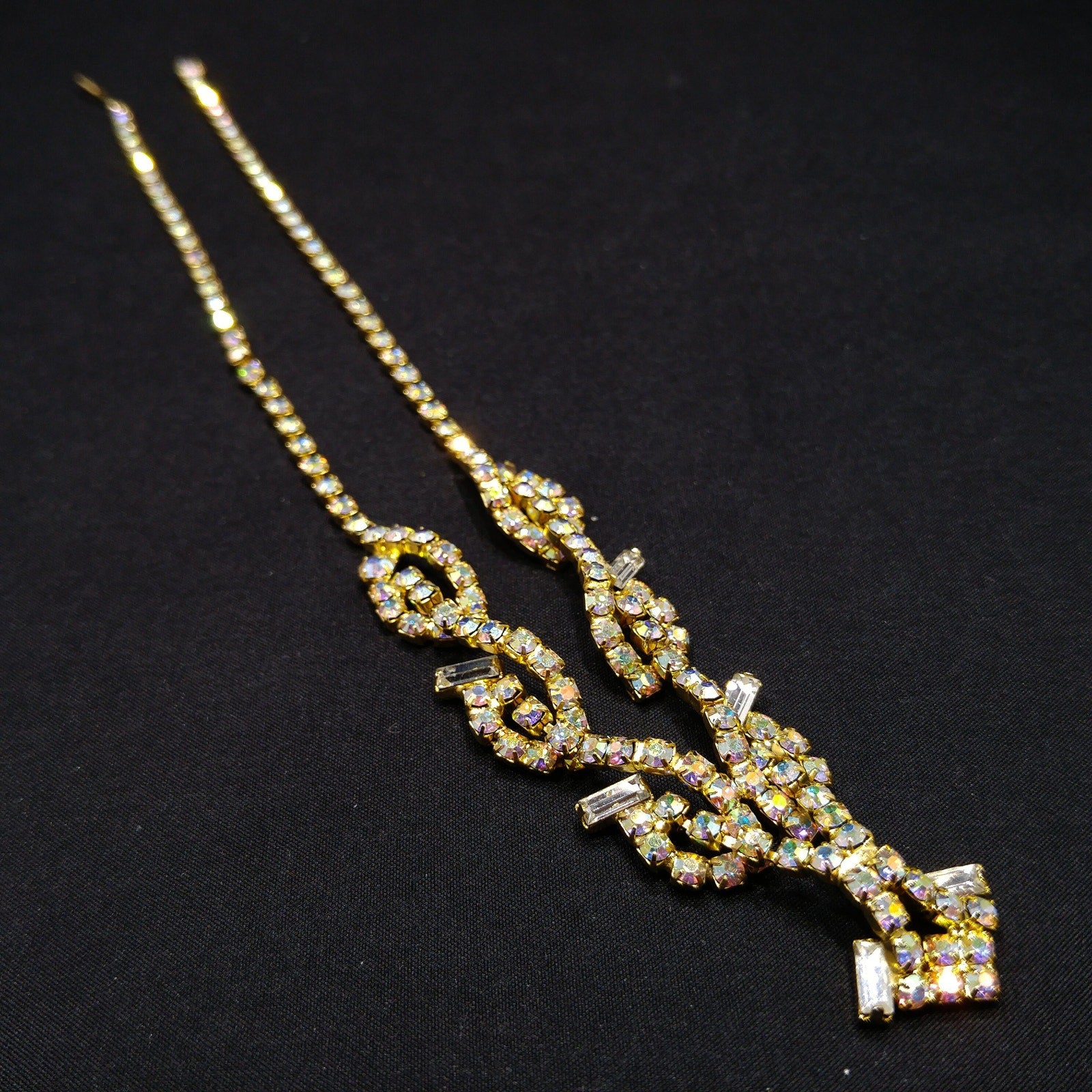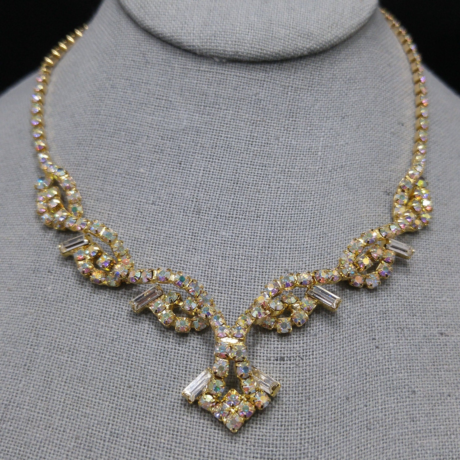 *Description: This is a beautiful vintage aurora borealis choker necklace with a combination of clear baguette rhinestones and aurora borealis chaton cut rhinestones which give the front of the necklace a three dimensional look from the 1960s. The necklace is gold plated and has a hook to allow you to adjust the length up to 15 1/2 Inches. It is a beautiful necklace and would be lovely for any special occasion. This would be a great addition to your vintage jewelry collection or make a great vintage gift!