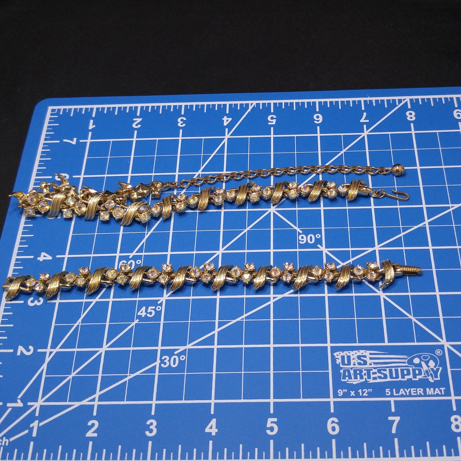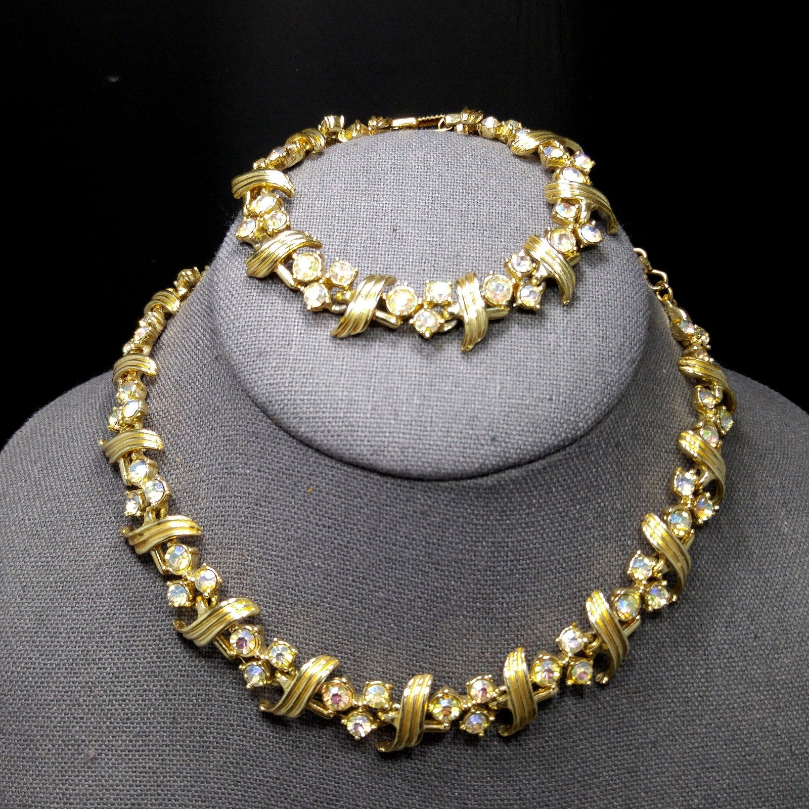 *Description: This is a beautiful gold plated necklace and matching bracelet with aurora borealis rhinestones from the 1960s. The necklace is choker length with a hook and extension chain and has a length up to 15 inches and the bracelet, which is the same pattern as the necklace, is 7 1/2 Inches with a fold over clasp. This would be a great addition to your vintage jewelry collection or make a great vintage gift!