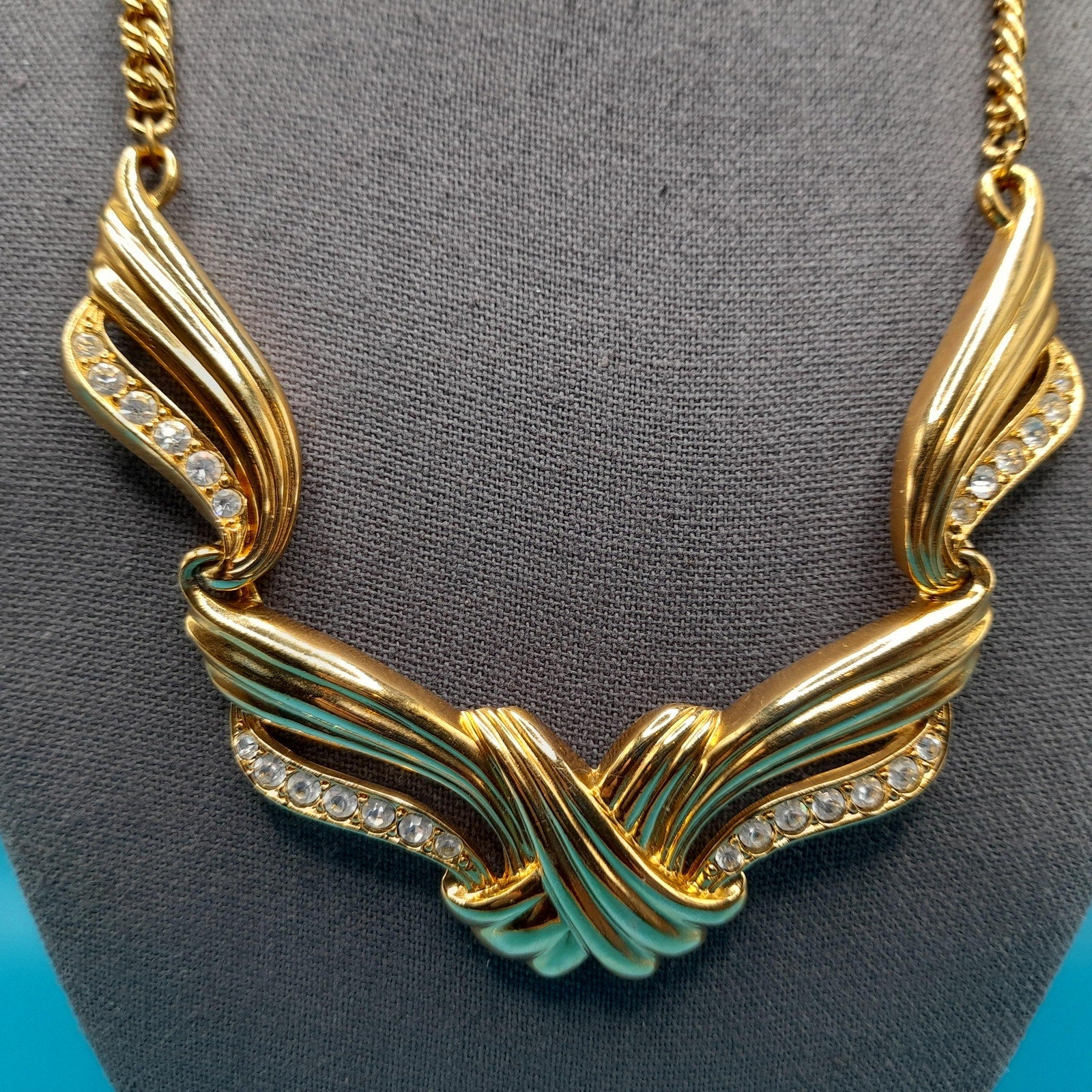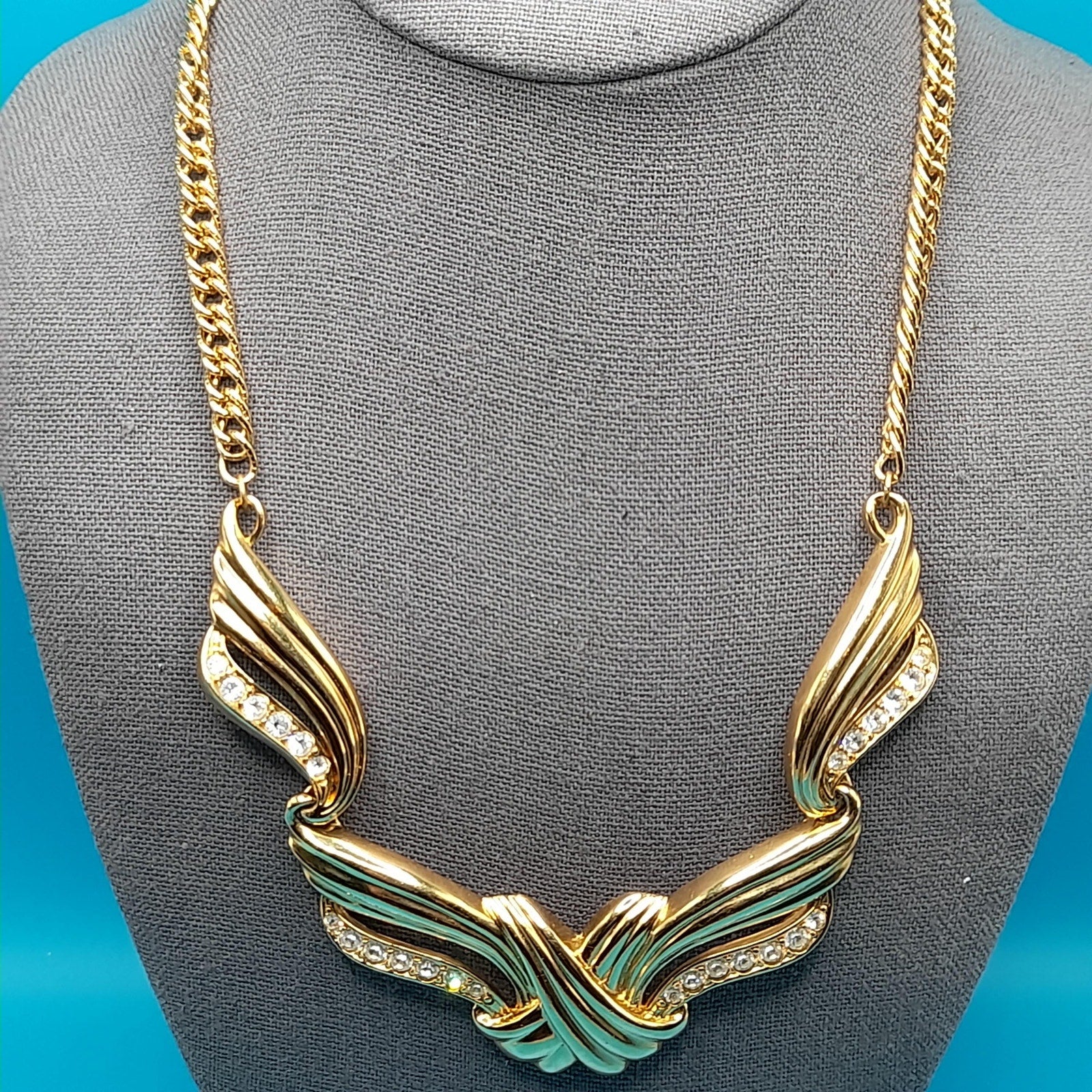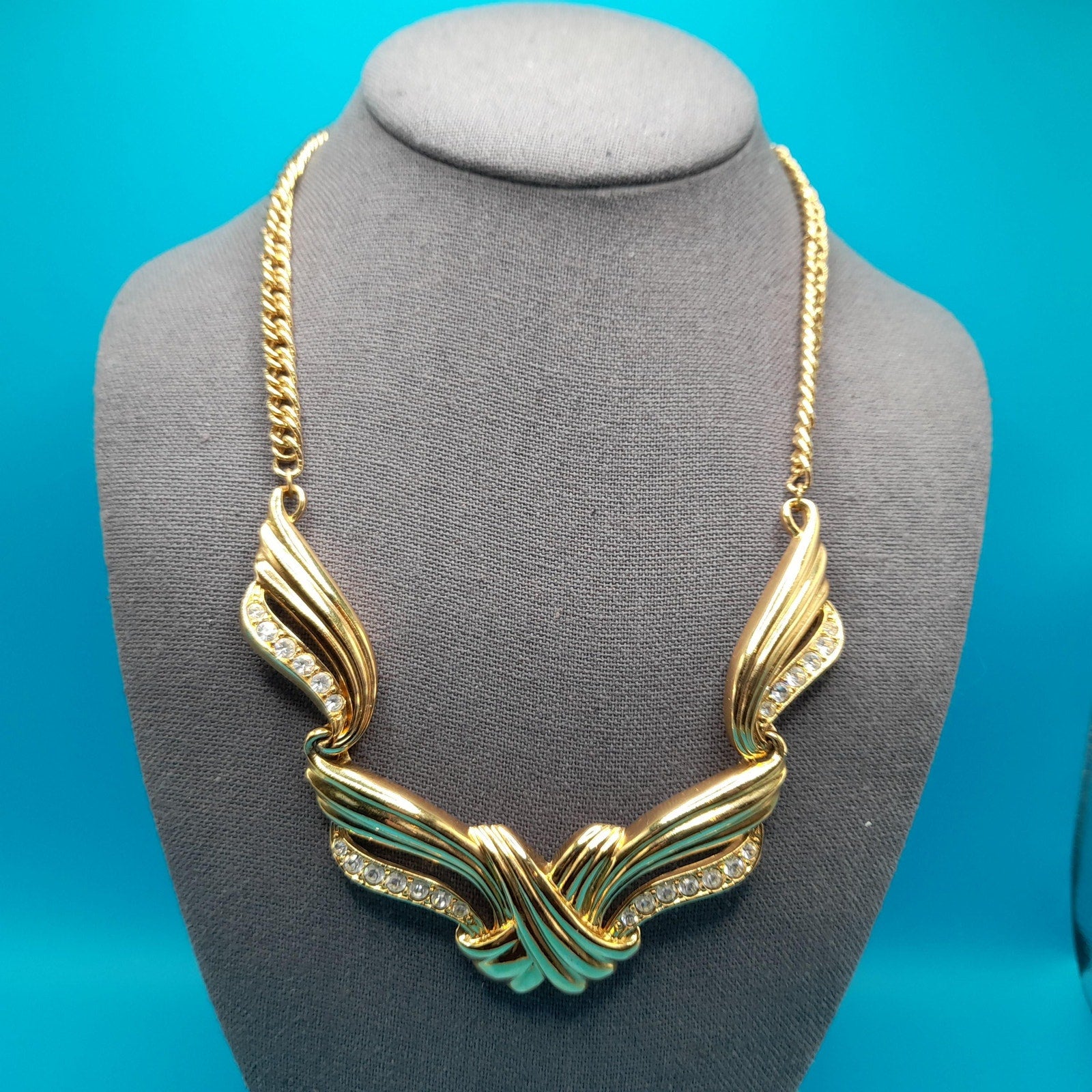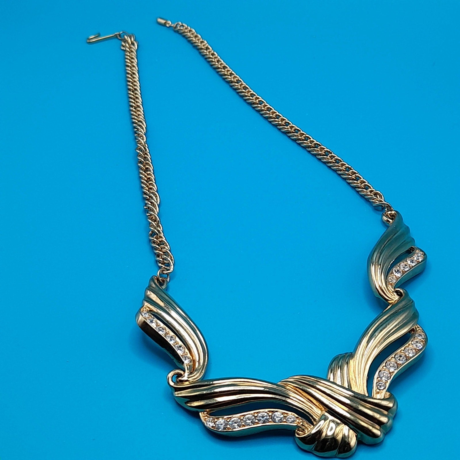 *Description: This is a vintage AVON gold tone necklace from 1991 which was an inspiration by Billy D. Williams fragrance, Undeniable. This necklace may be found on page 98 in "Identifying Avon Jewelry" by Sandra Sturdivant. The necklace has clear rhinestones on each of the sections. The gold tone metal may be gold plated. It has a hook clasp. This would be a great addition to your vintage jewelry collection or make a great vintage gift!