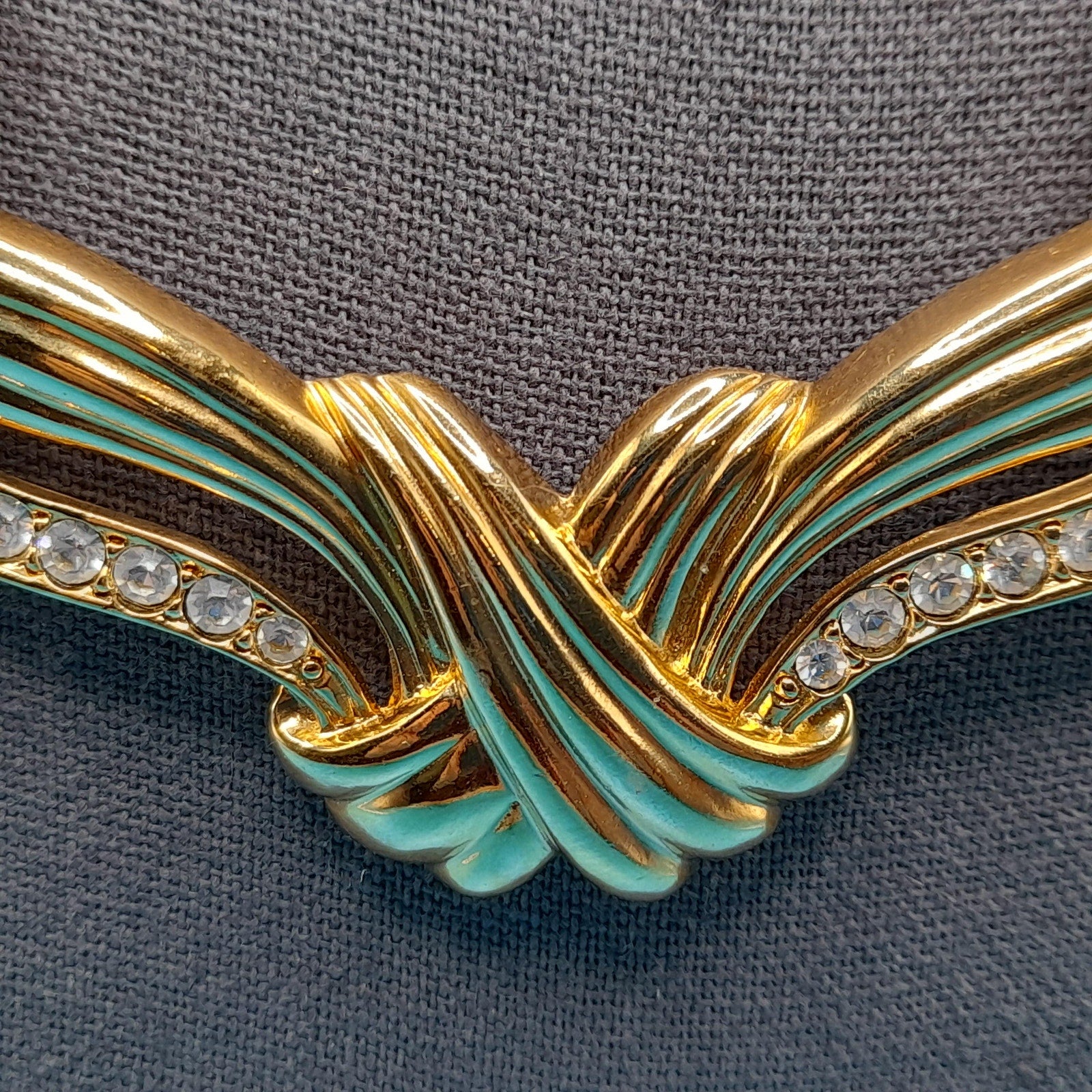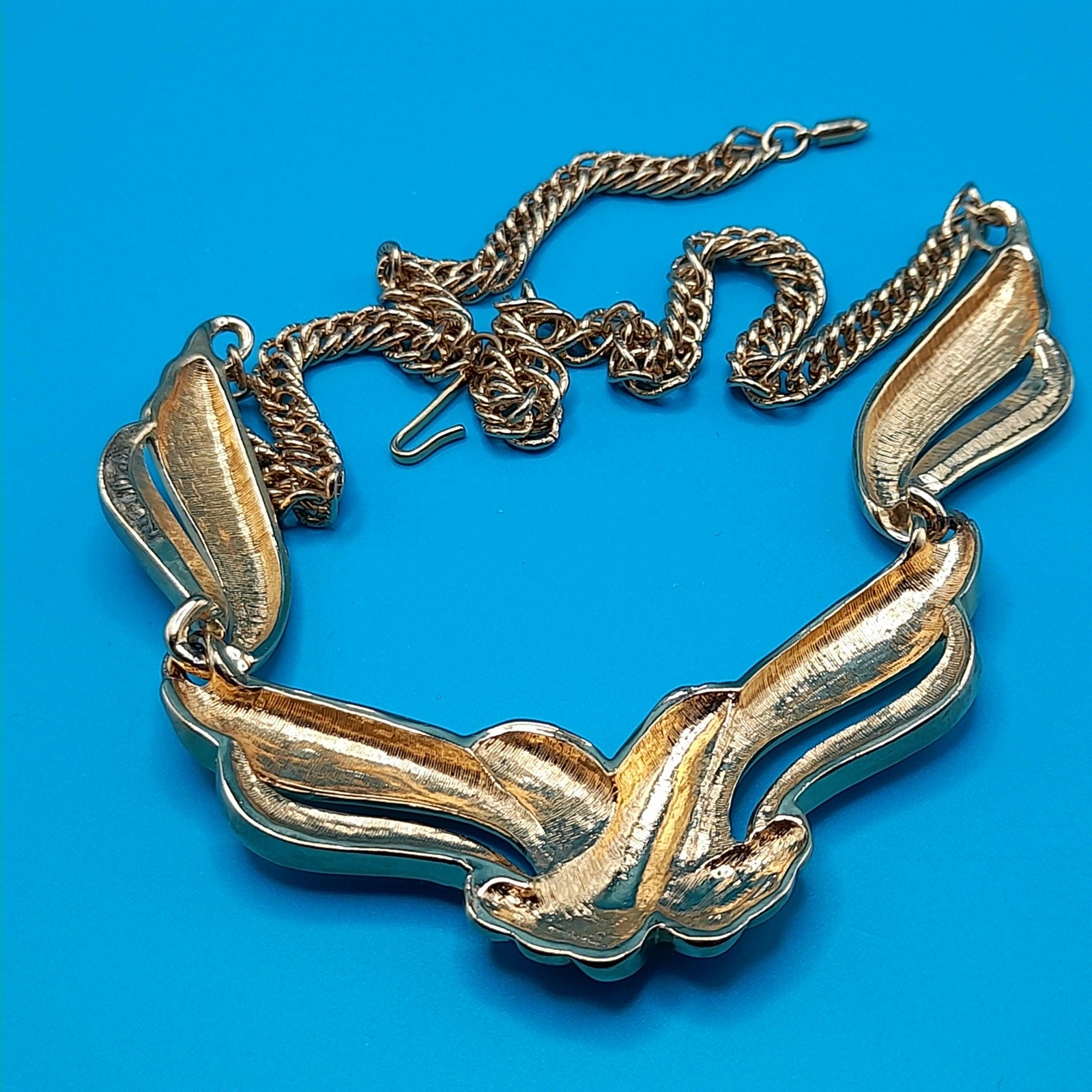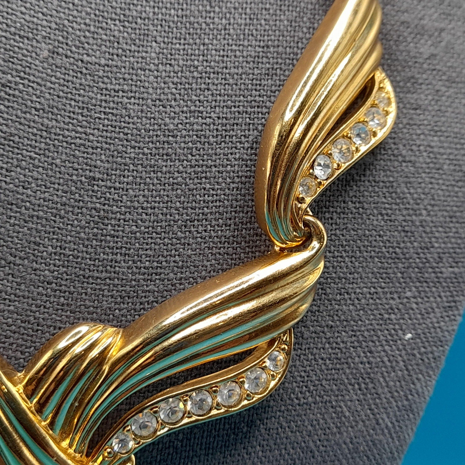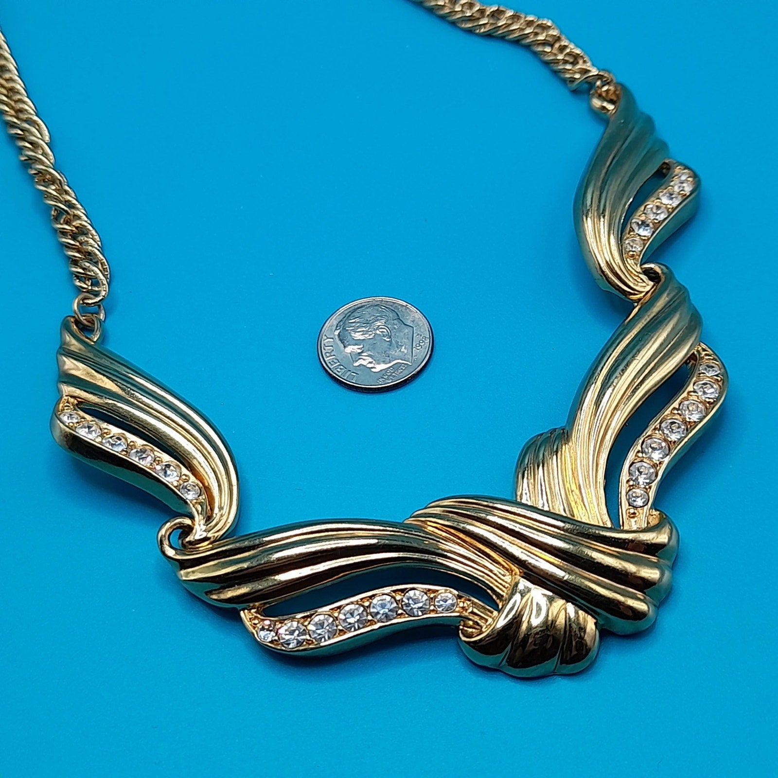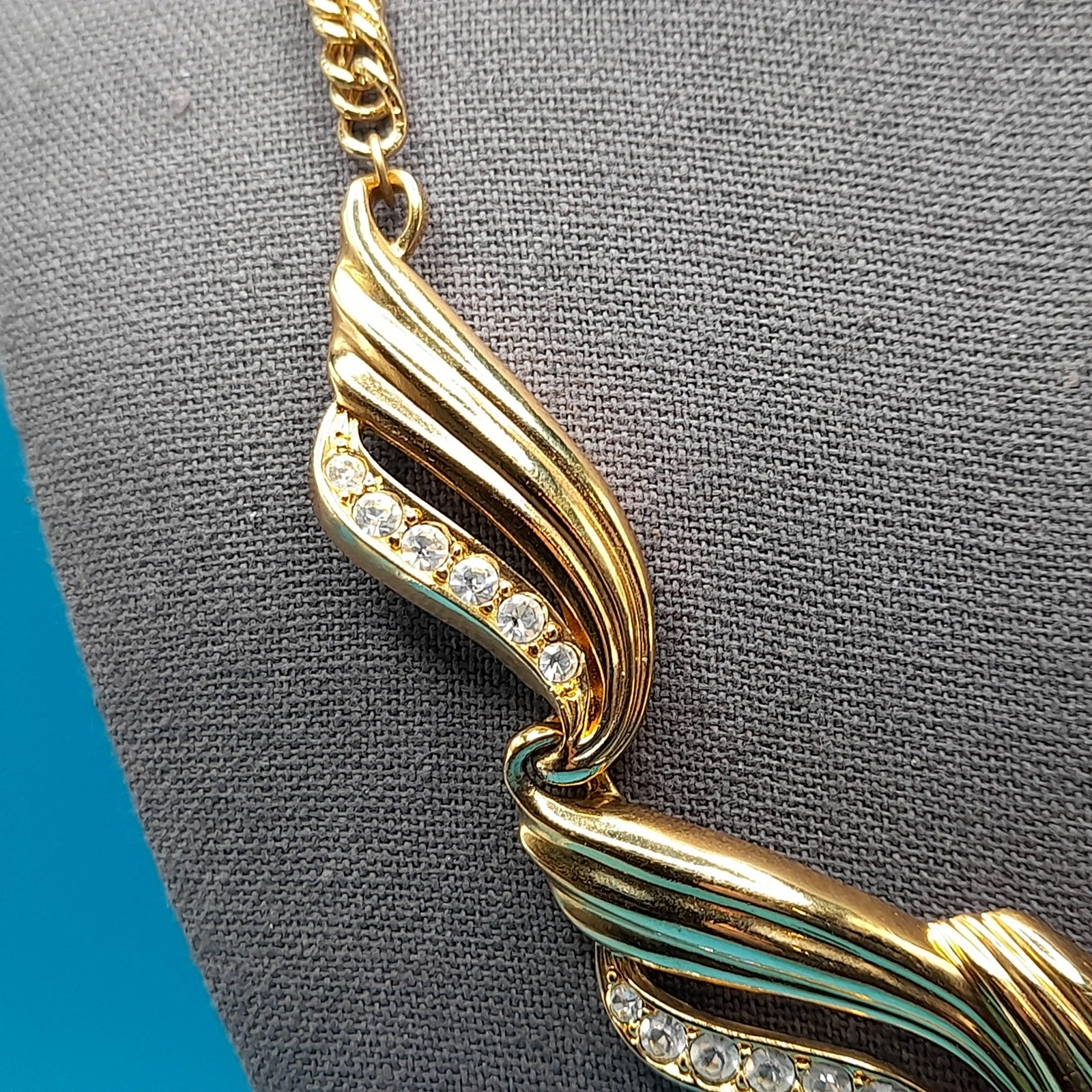 *Description: This is a vintage AVON gold tone necklace from 1991 which was an inspiration by Billy D. Williams fragrance, Undeniable. This necklace may be found on page 98 in "Identifying Avon Jewelry" by Sandra Sturdivant. The necklace has clear rhinestones on each of the sections. The gold tone metal may be gold plated. It has a hook clasp. This would be a great addition to your vintage jewelry collection or make a great vintage gift!