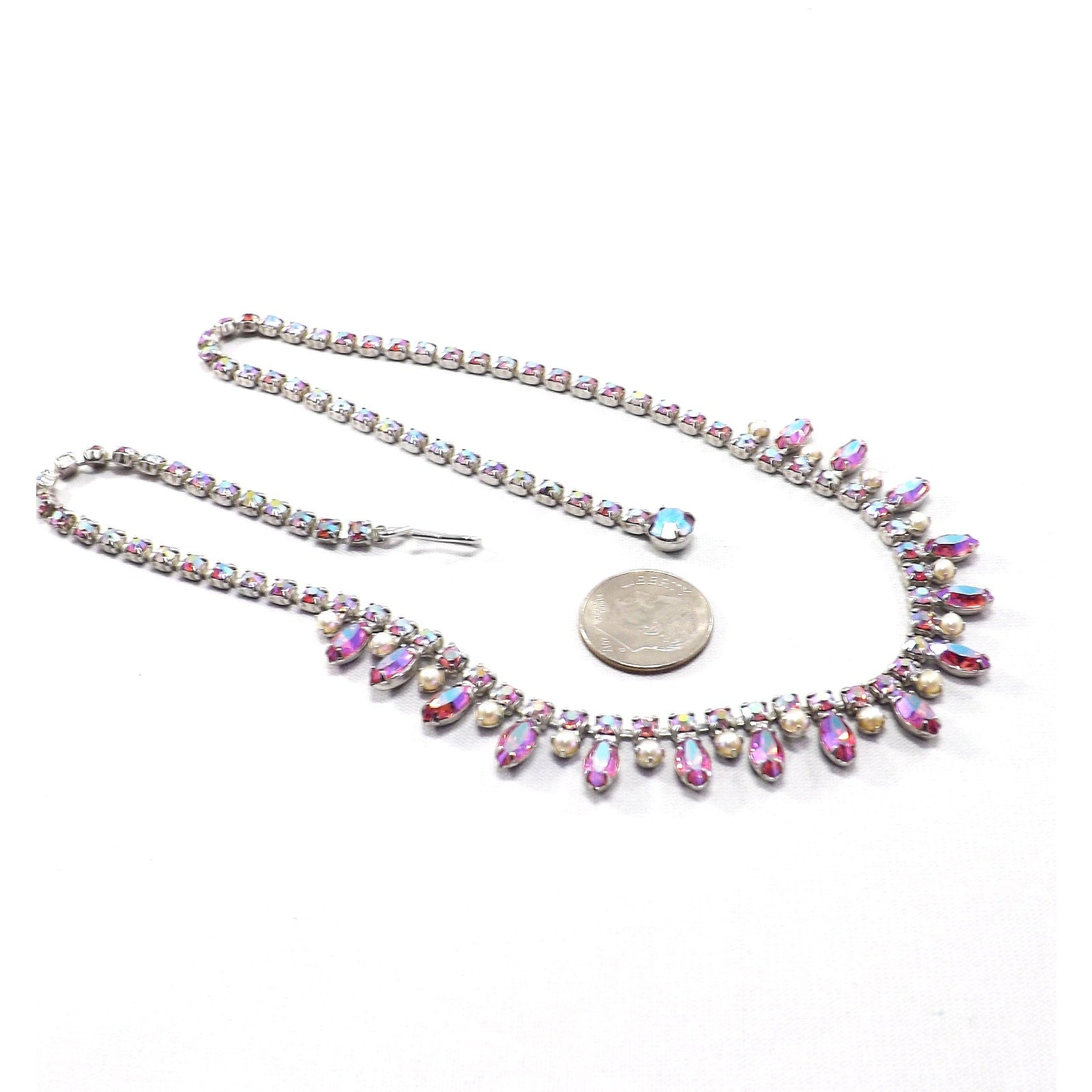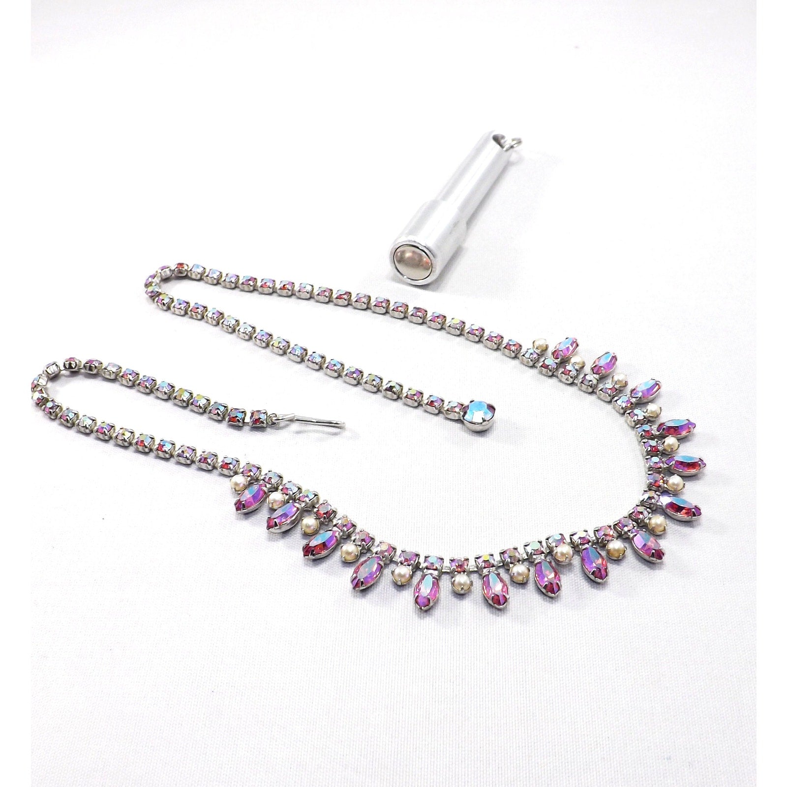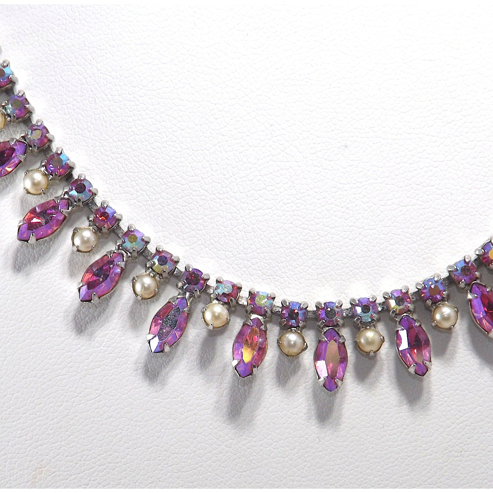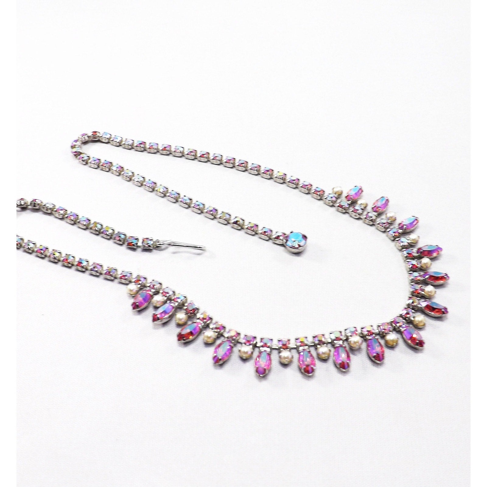 Vintage B. DAVID Pink Red Choker Necklace with Aurora Borealis Marquise Rhinestones Rhodium Plating Signed Faux Pearls 1960s Vintage Jewelry