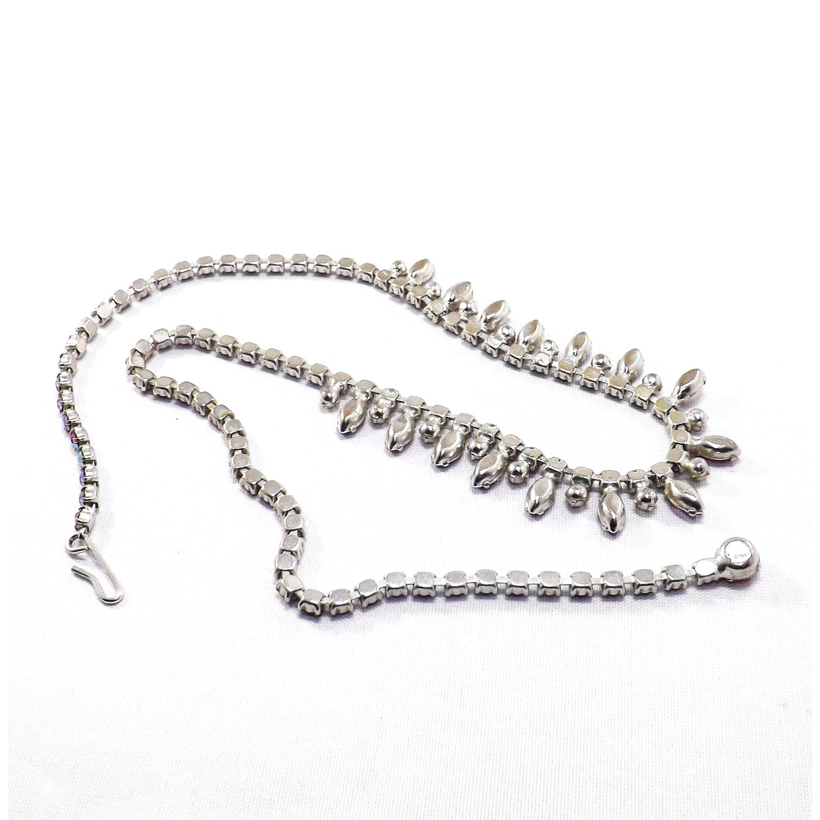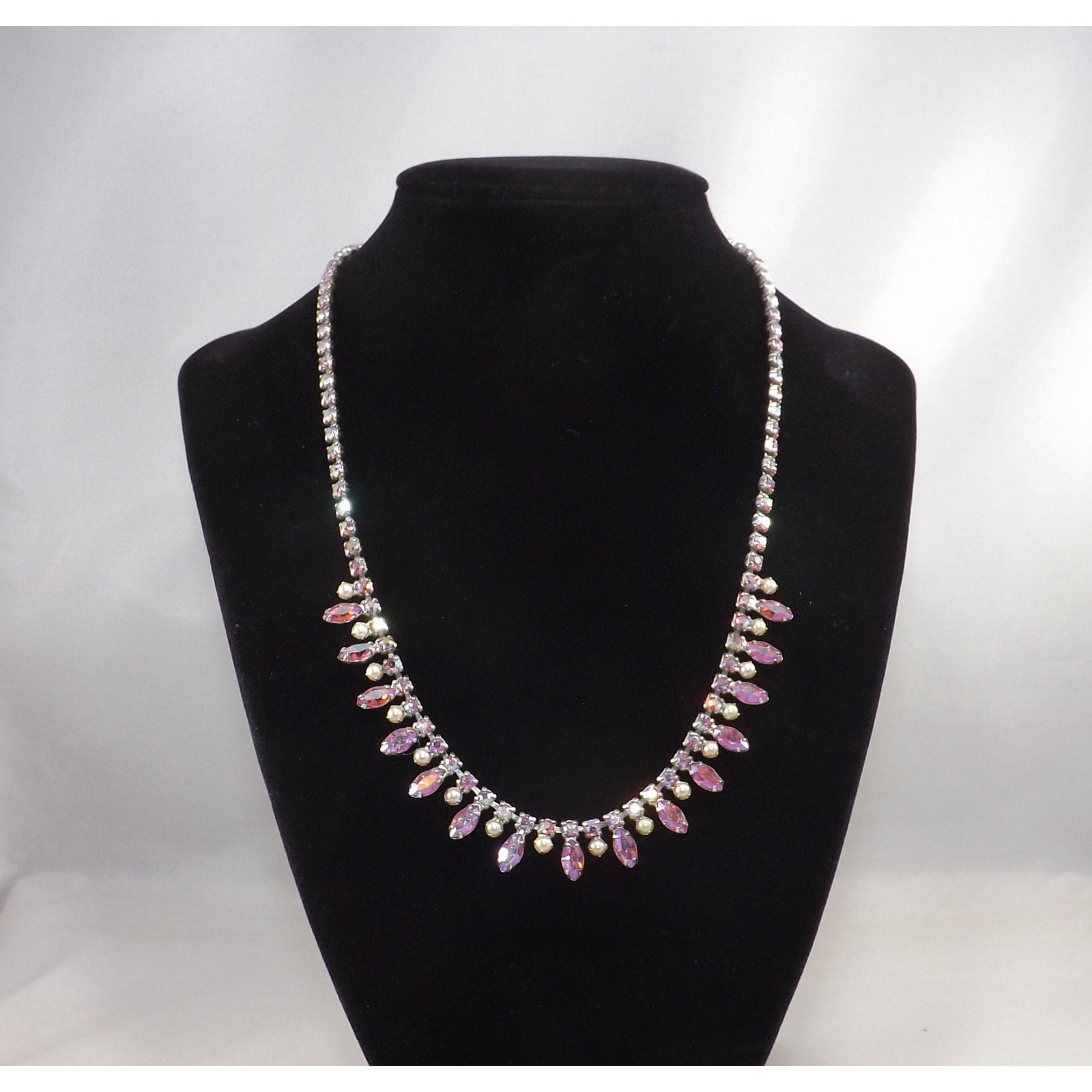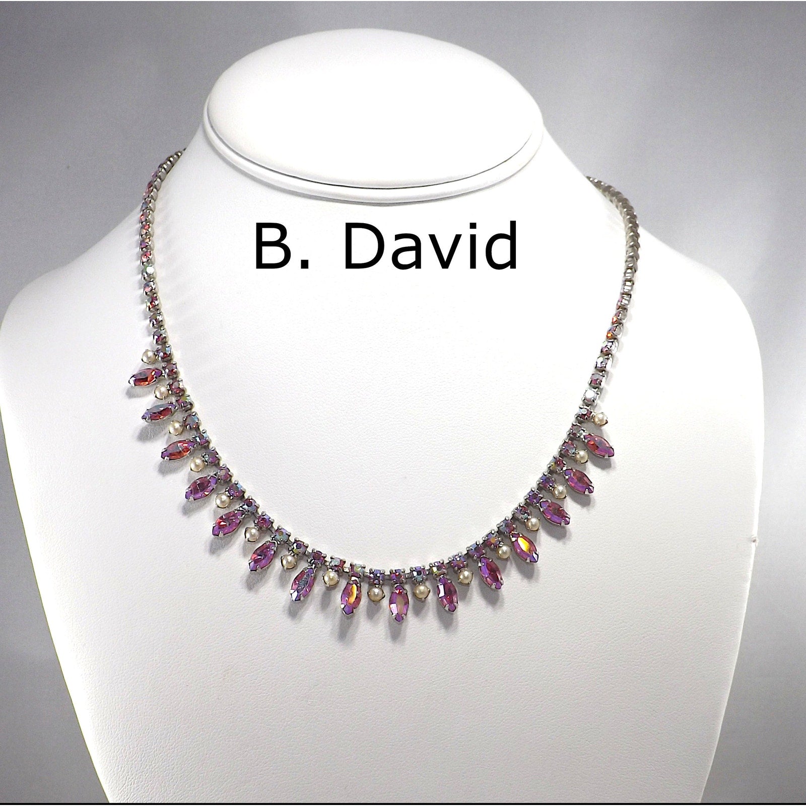 *Description: This is a beautiful pink and red aurora borealis rhinestone necklace designed by B. David in the 1960s. The prong set rhodium plated necklace also has tiny faux pearls in between each of the prong set marquise rhinestones. The marquise rhinestones and faux pearls are set under a rhinestone choker and would be beautiful with any formal outfit, make a wonderful gift, or be a wonderful addition to any vintage jewelry collection.