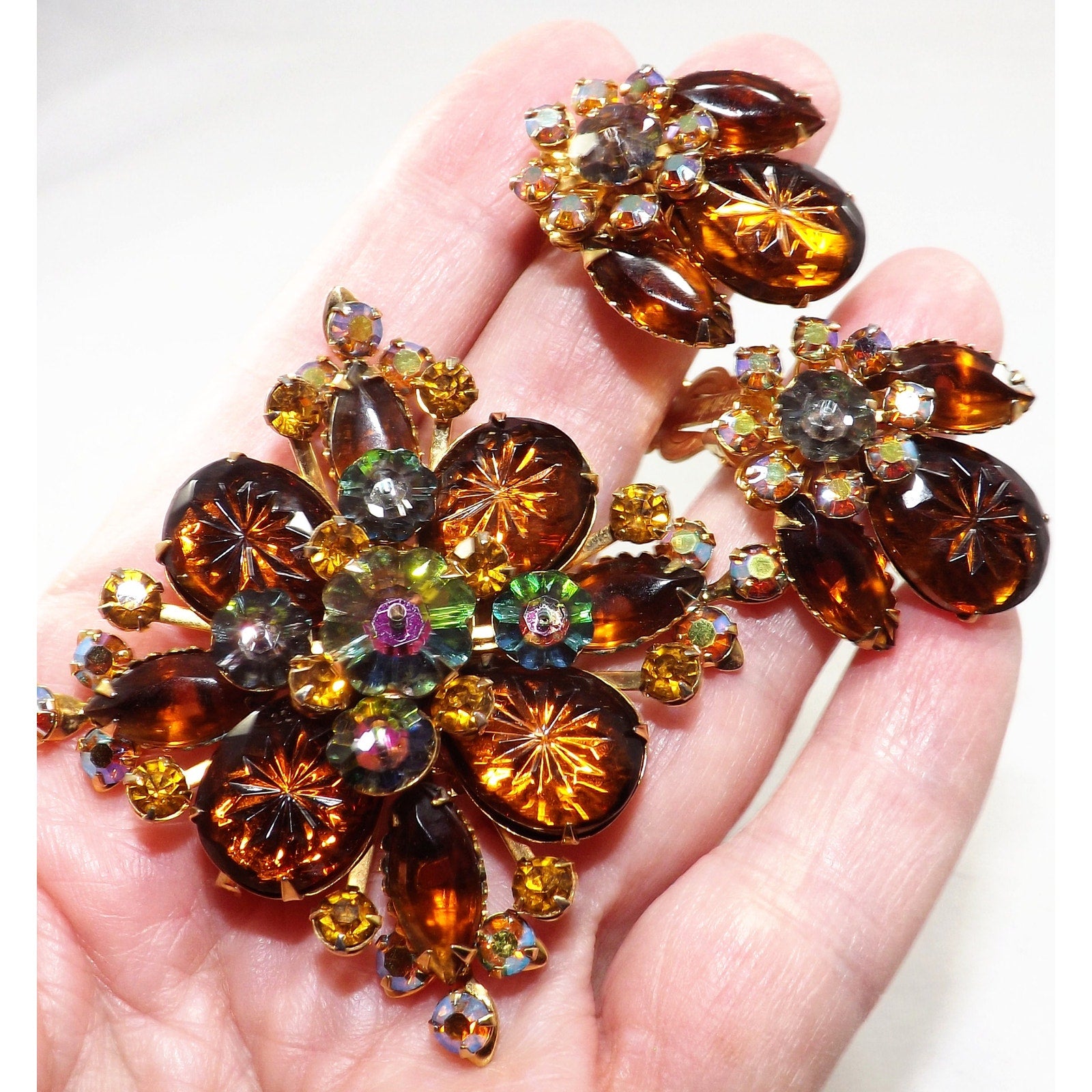 The brooch is designed in a diamond-shaped floral motif, accented with faceted topaz and aurora borealis rhinestones that shimmer beautifully in the light. The clip-on earrings echo the same warm tones, with a central topaz rhinestone surrounded by aurora borealis chatons and a molded glass petal drop.