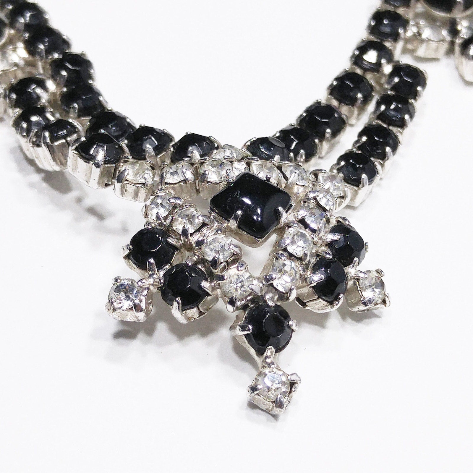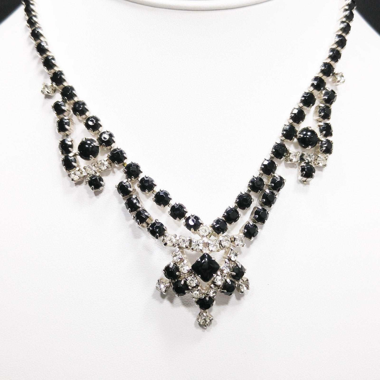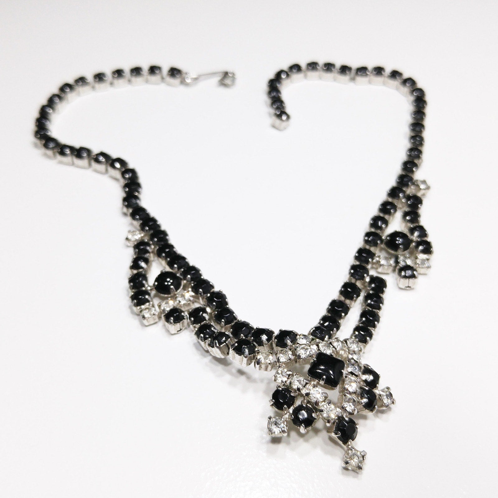 Vintage Black & Clear Rhinestone Festoon Necklace, Rhodium Plating, 1950s
