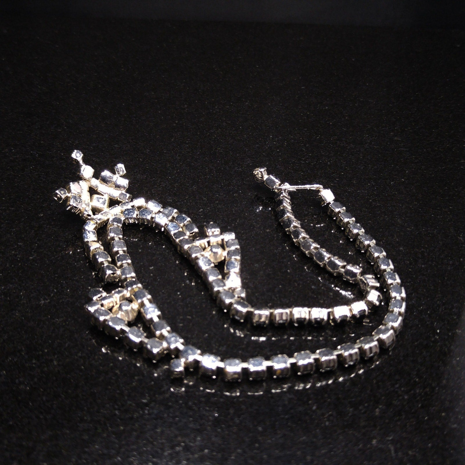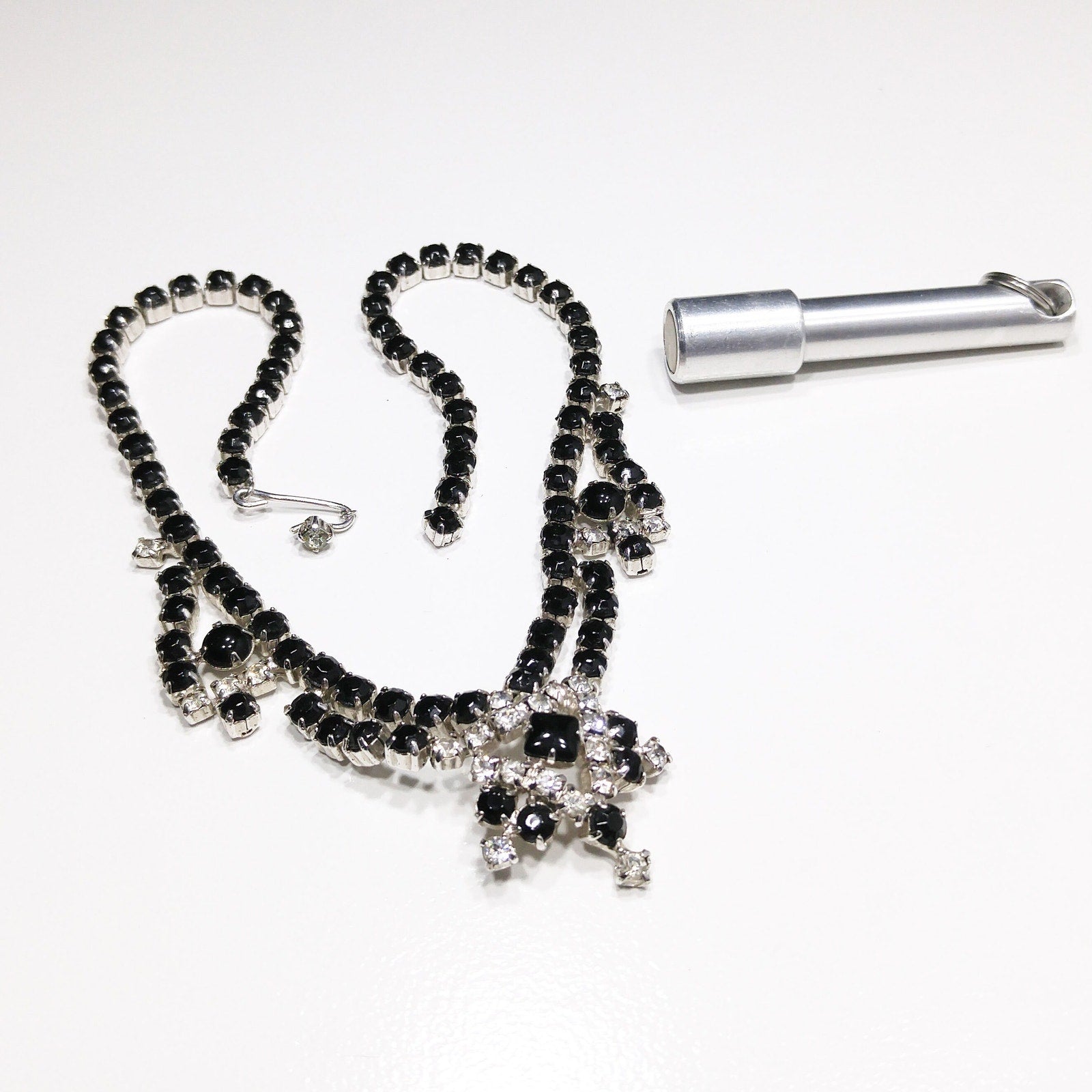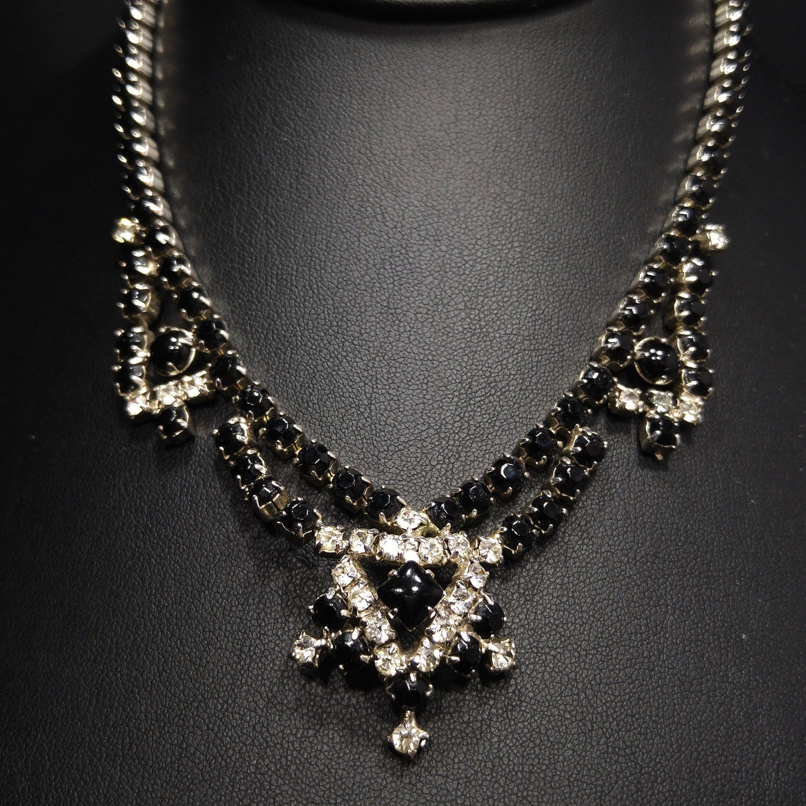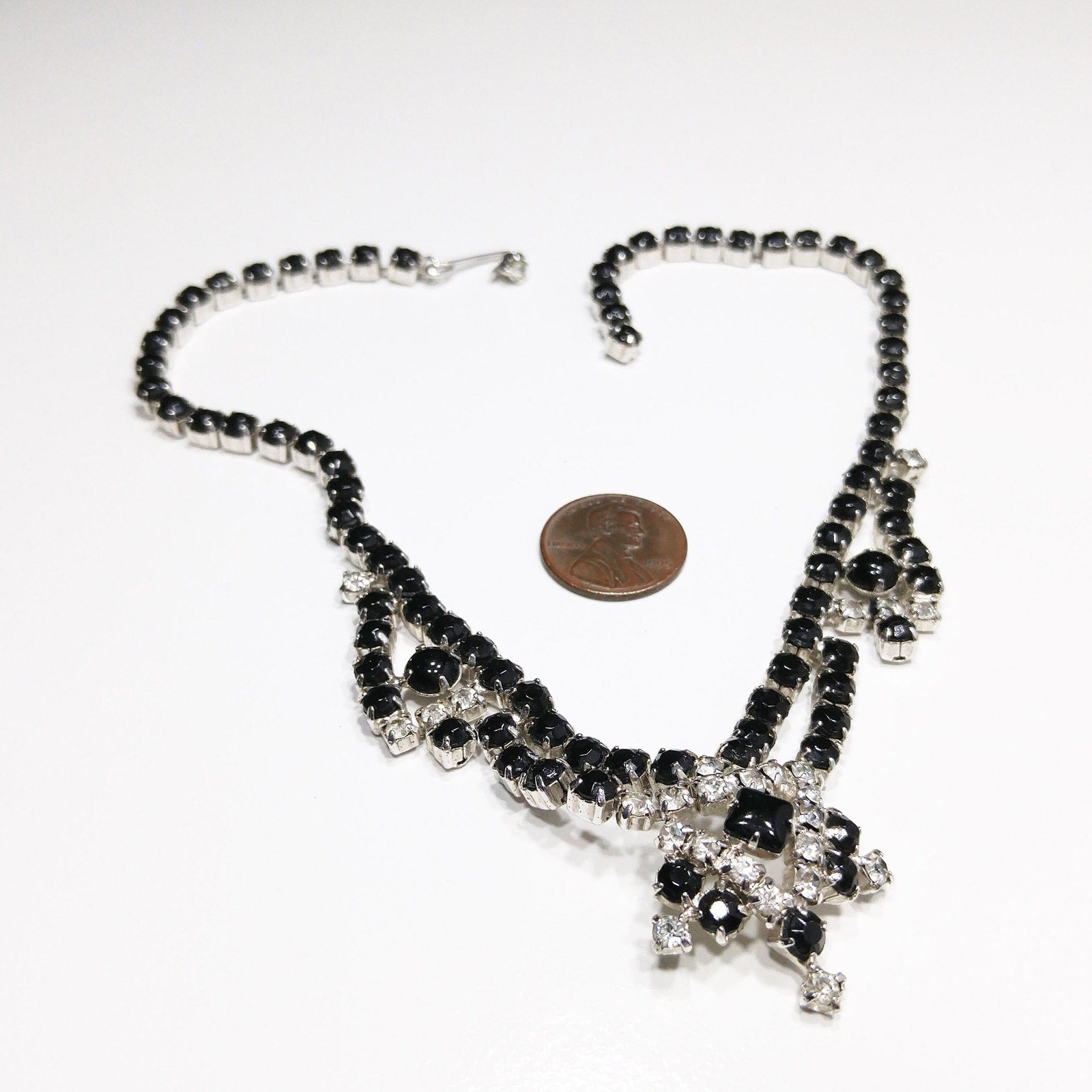 Vintage Black & Clear Rhinestone Festoon Necklace, Rhodium Plating, 1950s