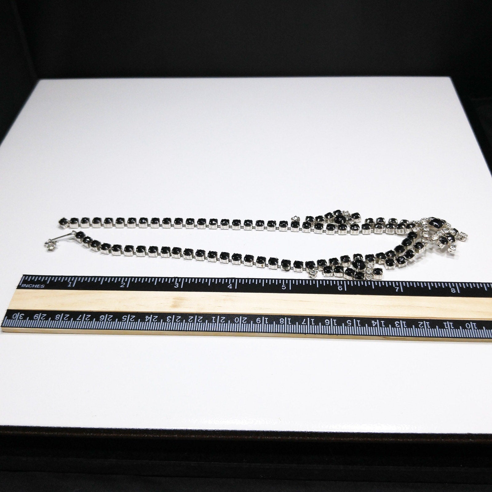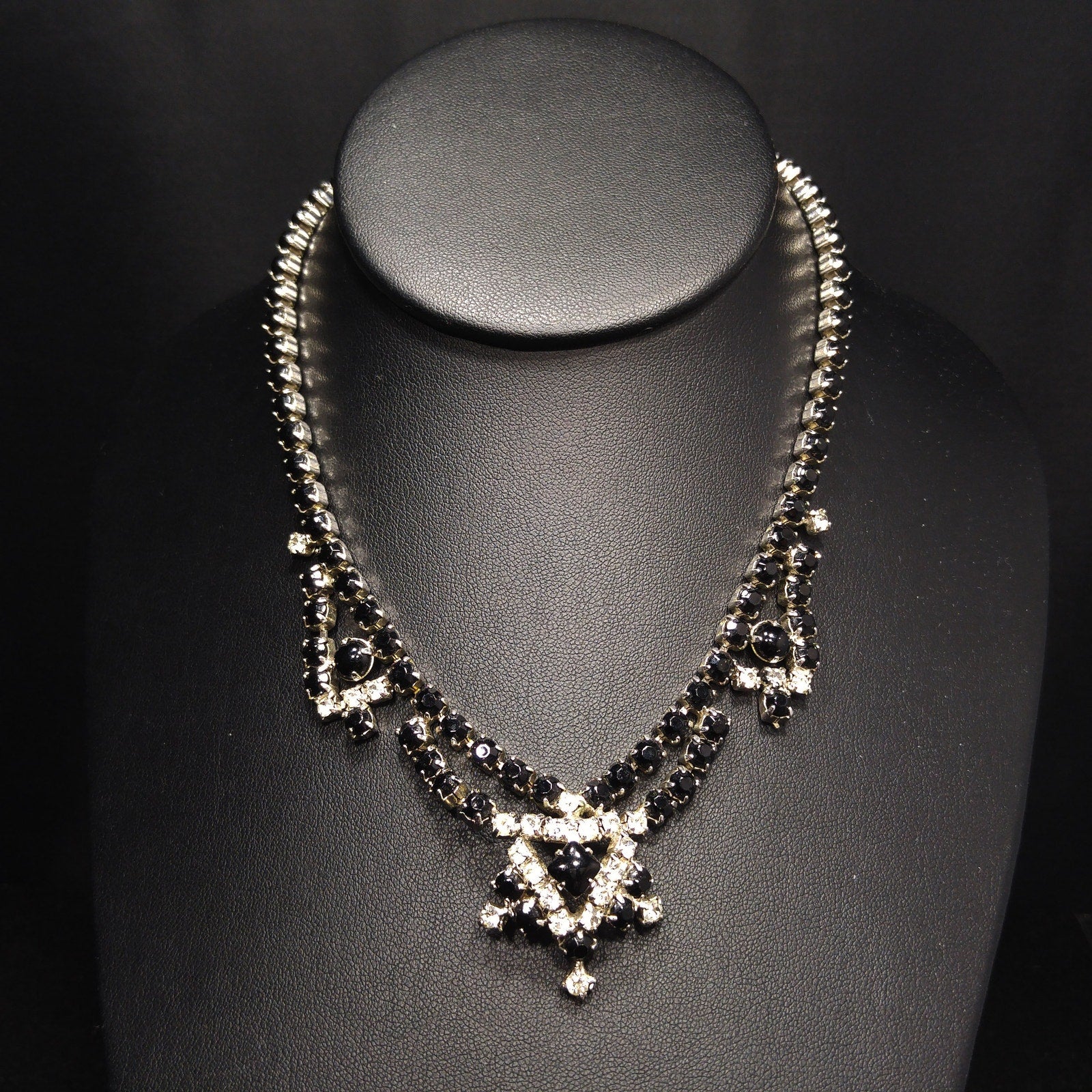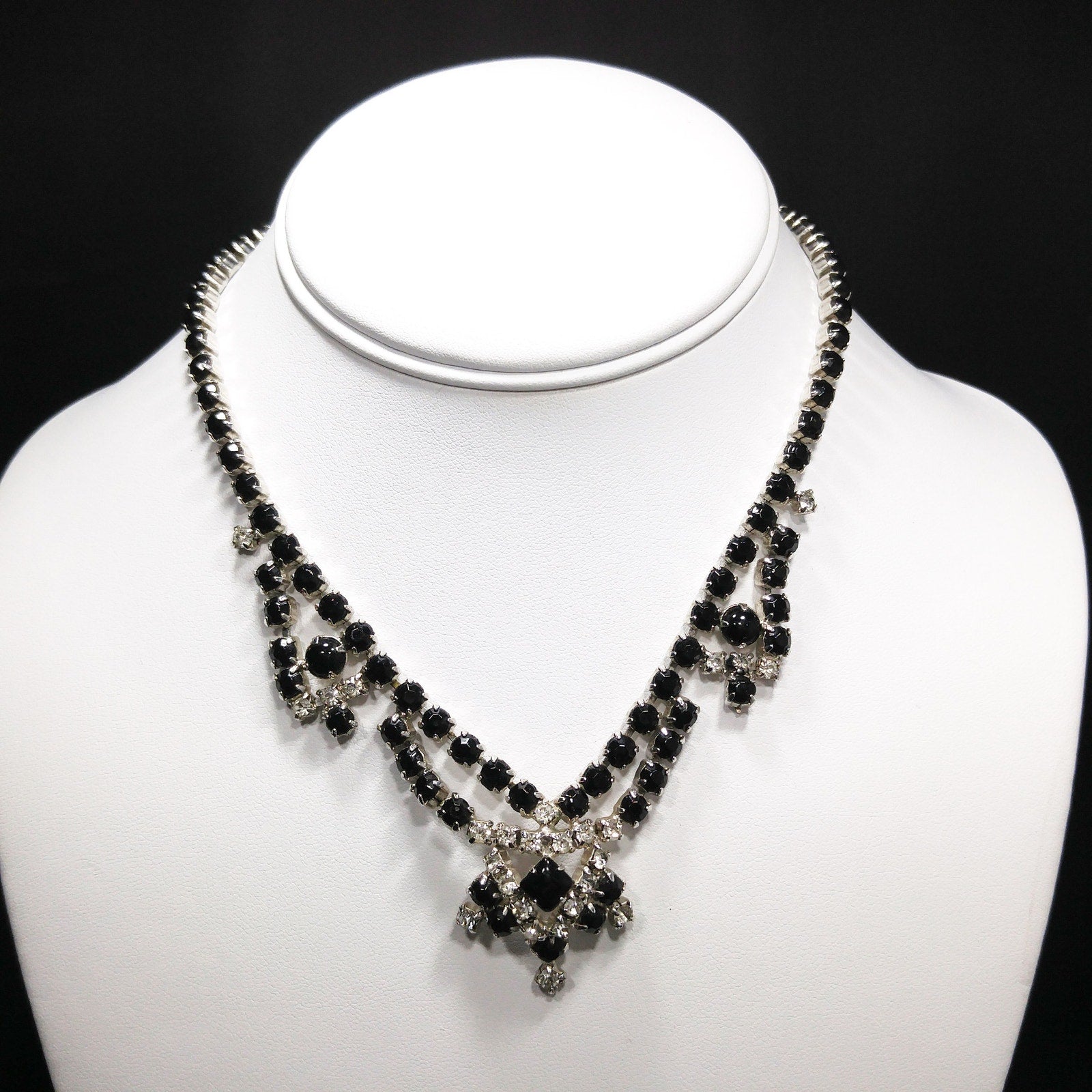 *Description: This is a beautiful mid-century rhinestone choker festoon necklace from the 1950s. The necklace has a slightly domed built in pendant and three black cabochons in the festoon design, as well as, black crystal chaton rhinestones and clear crystal chaton rhinestones throughout the necklace. This would be a great necklace to wear to any formal occasion. The back is rhodium plated and the hook clasp has a clear rhinestone decoration on the tip. This would be a great addition to your vintage jewelry collection and also make a great vintage gift.
