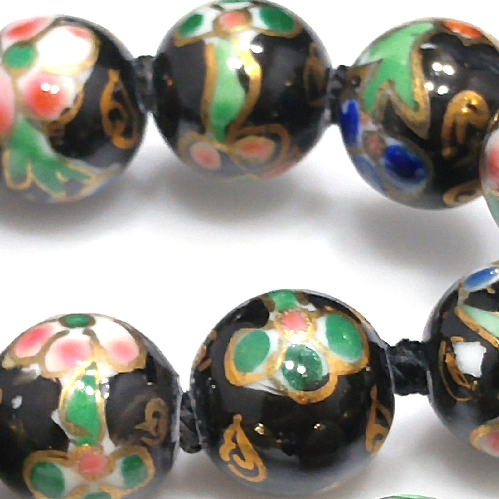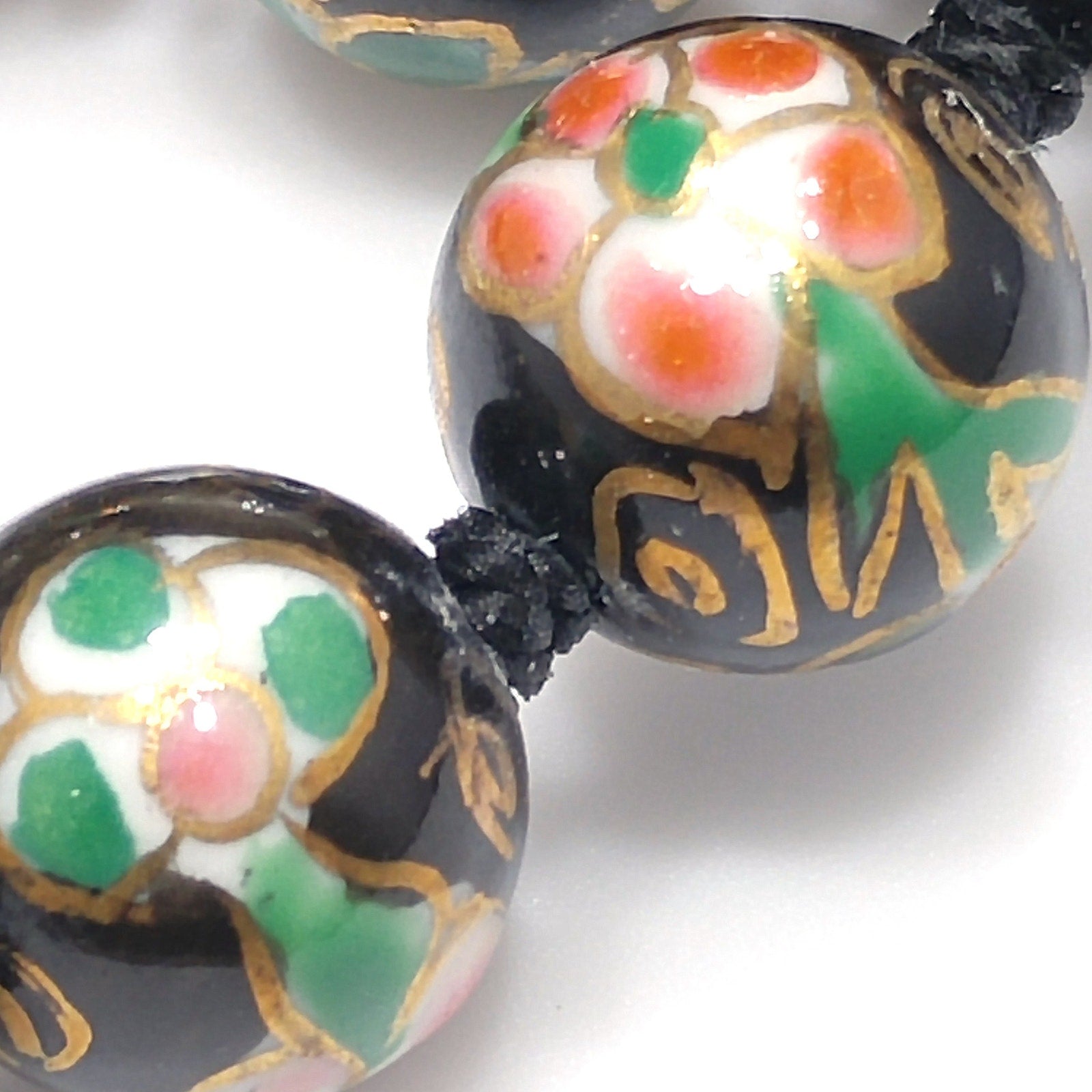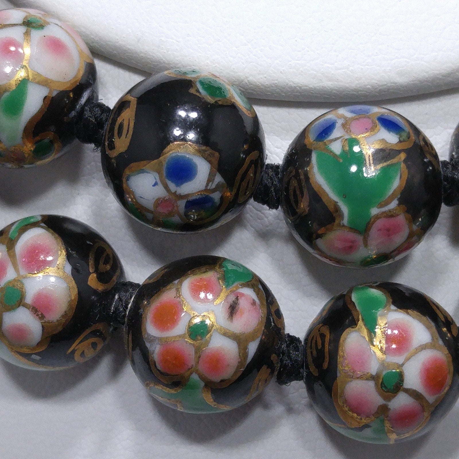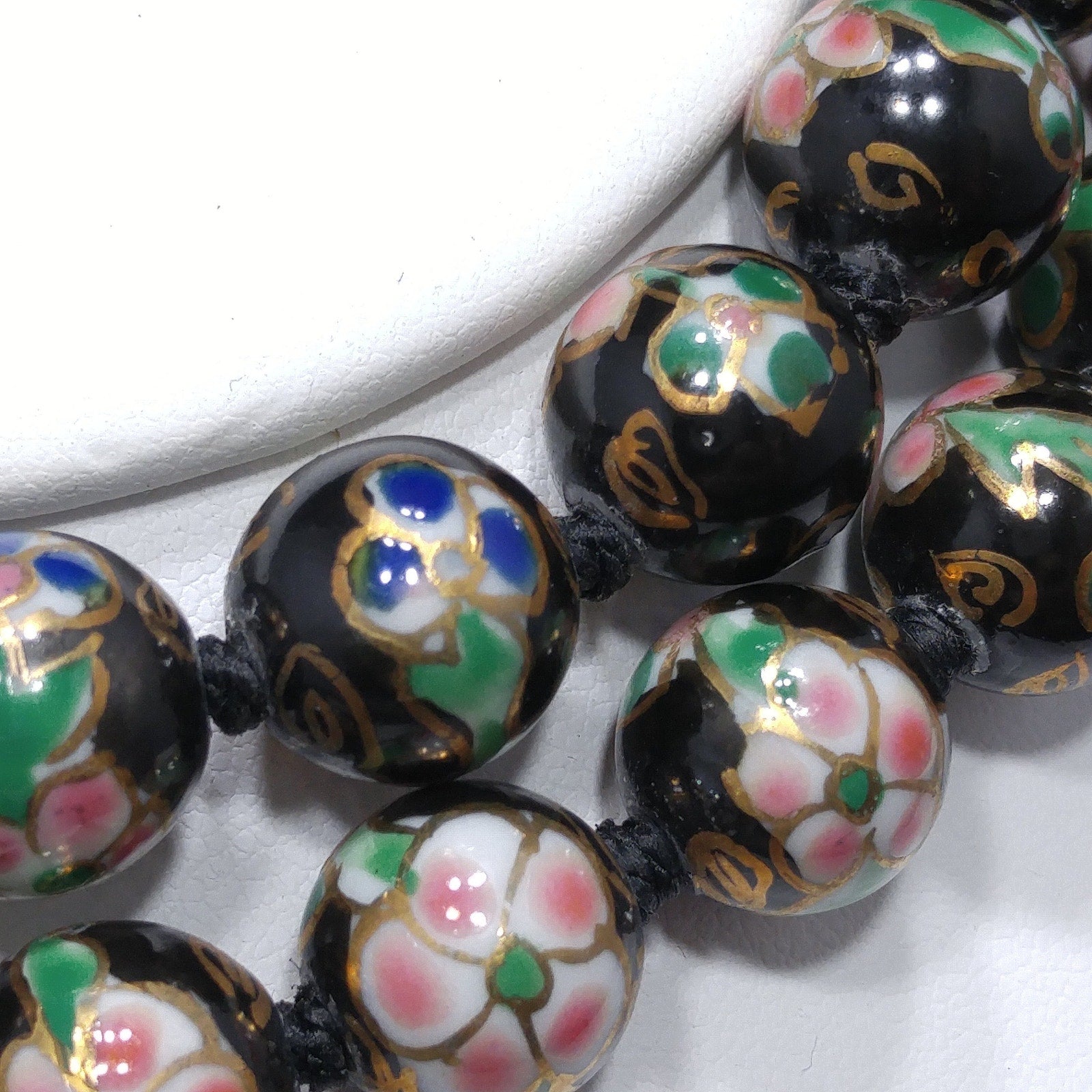 Vintage Black Cloisonné Floral Beaded Necklace, Pink Green Flowers, 1960s Vintage Jewelry