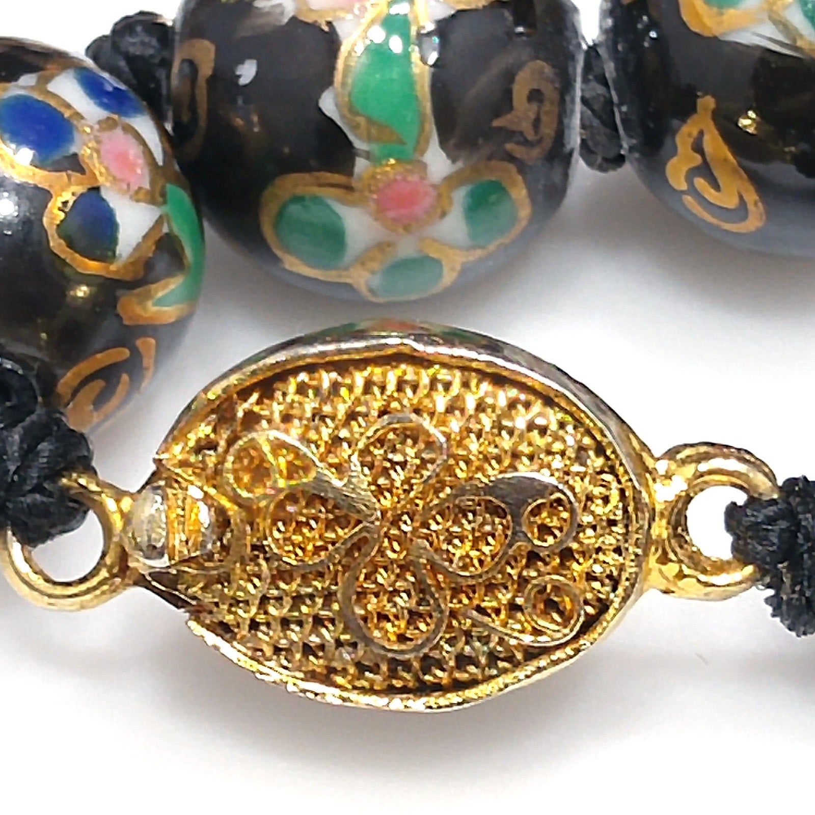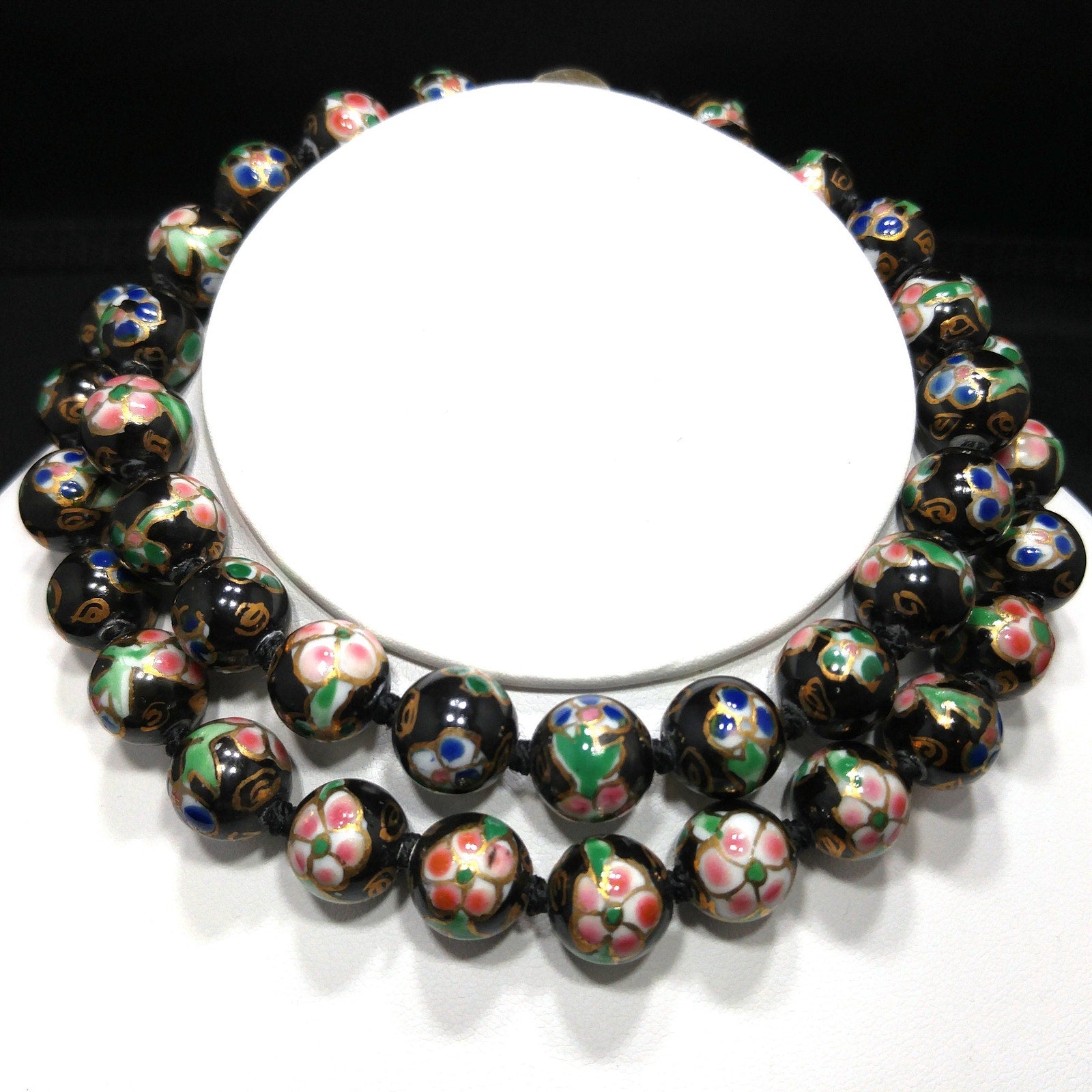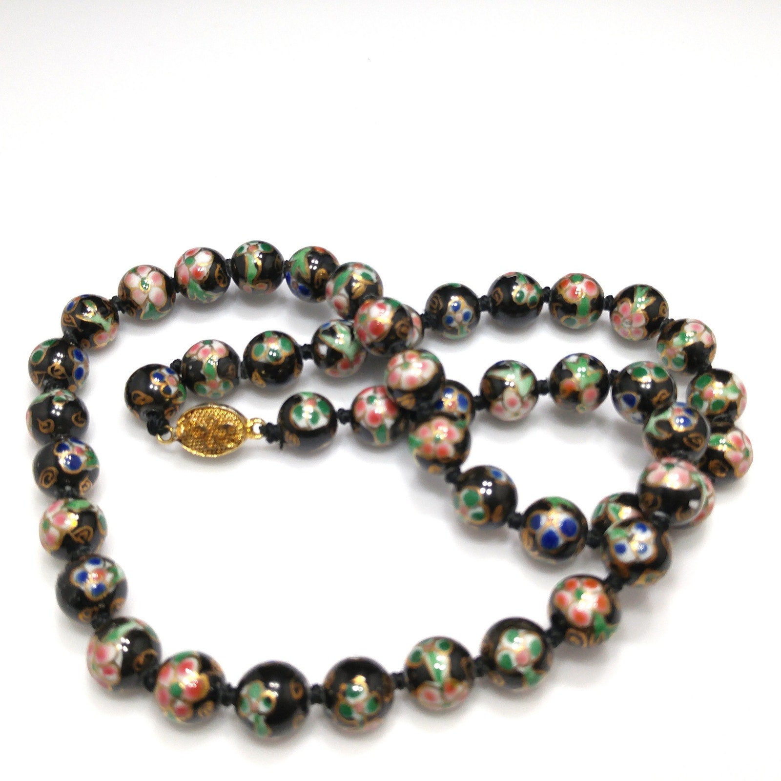 *Description: This is a beautiful cloisonné necklace with hand painted pink, blue, and green flowers and leaves on black porcelain beads trimmed in gold from the 1960s. This necklace is hand knotted to increase its strength. The filigree clasp is oval and gold in tone. This is a great vintage necklace and would make a great addition to your vintage jewelry collection. This hand-painted and hand-knotted necklace was imported from China in the 1960s. This would be a great addition to your vintage jewelry collection or make a great vintage gift!