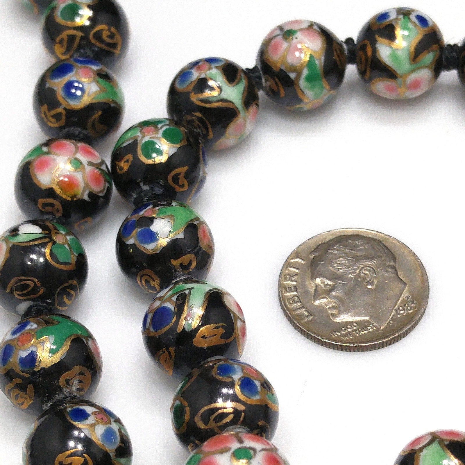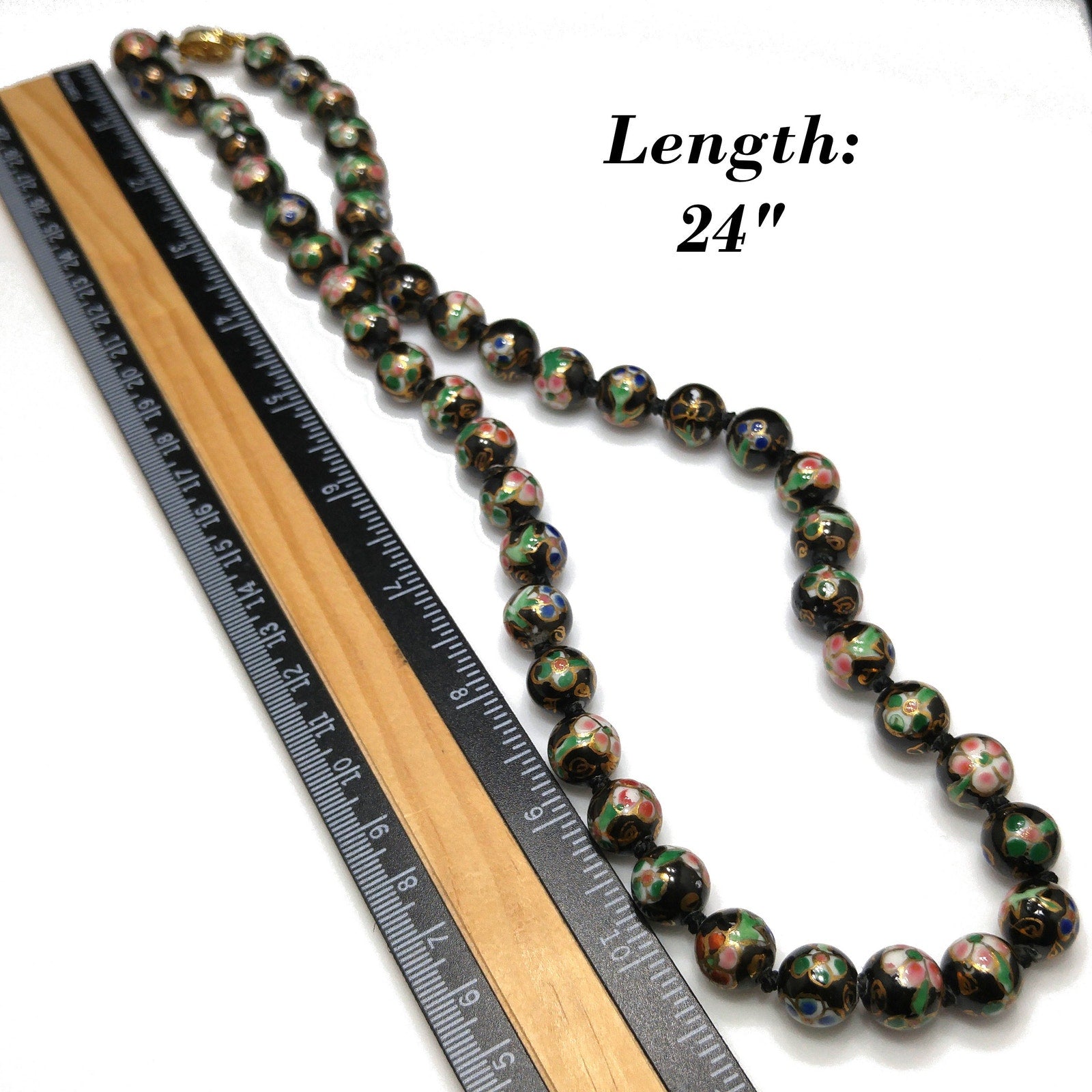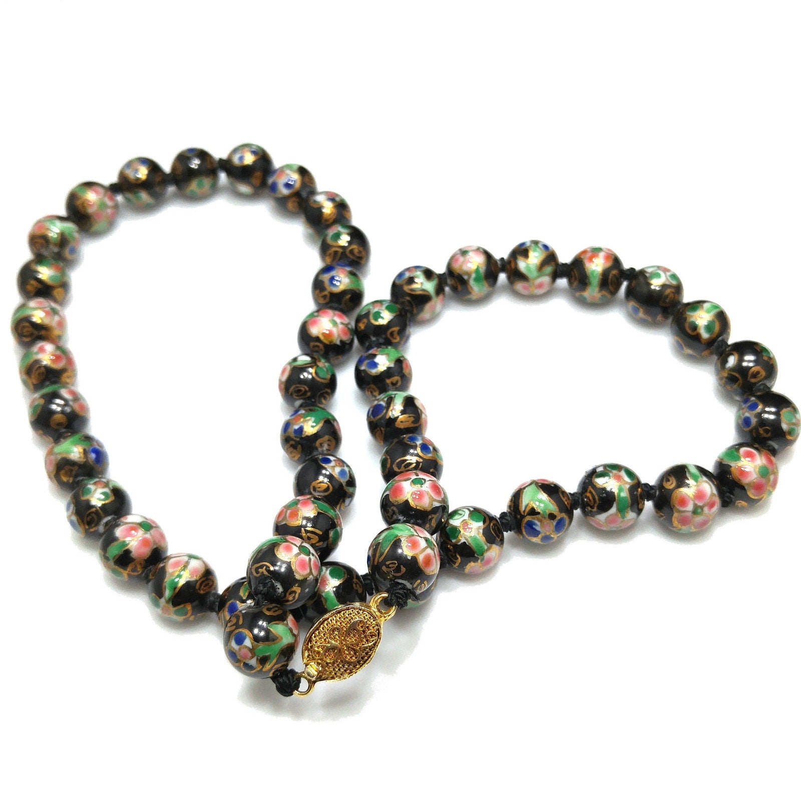 *Description: This is a beautiful cloisonné necklace with hand painted pink, blue, and green flowers and leaves on black porcelain beads trimmed in gold from the 1960s. This necklace is hand knotted to increase its strength. The filigree clasp is oval and gold in tone. This is a great vintage necklace and would make a great addition to your vintage jewelry collection. This hand-painted and hand-knotted necklace was imported from China in the 1960s. This would be a great addition to your vintage jewelry collection or make a great vintage gift!