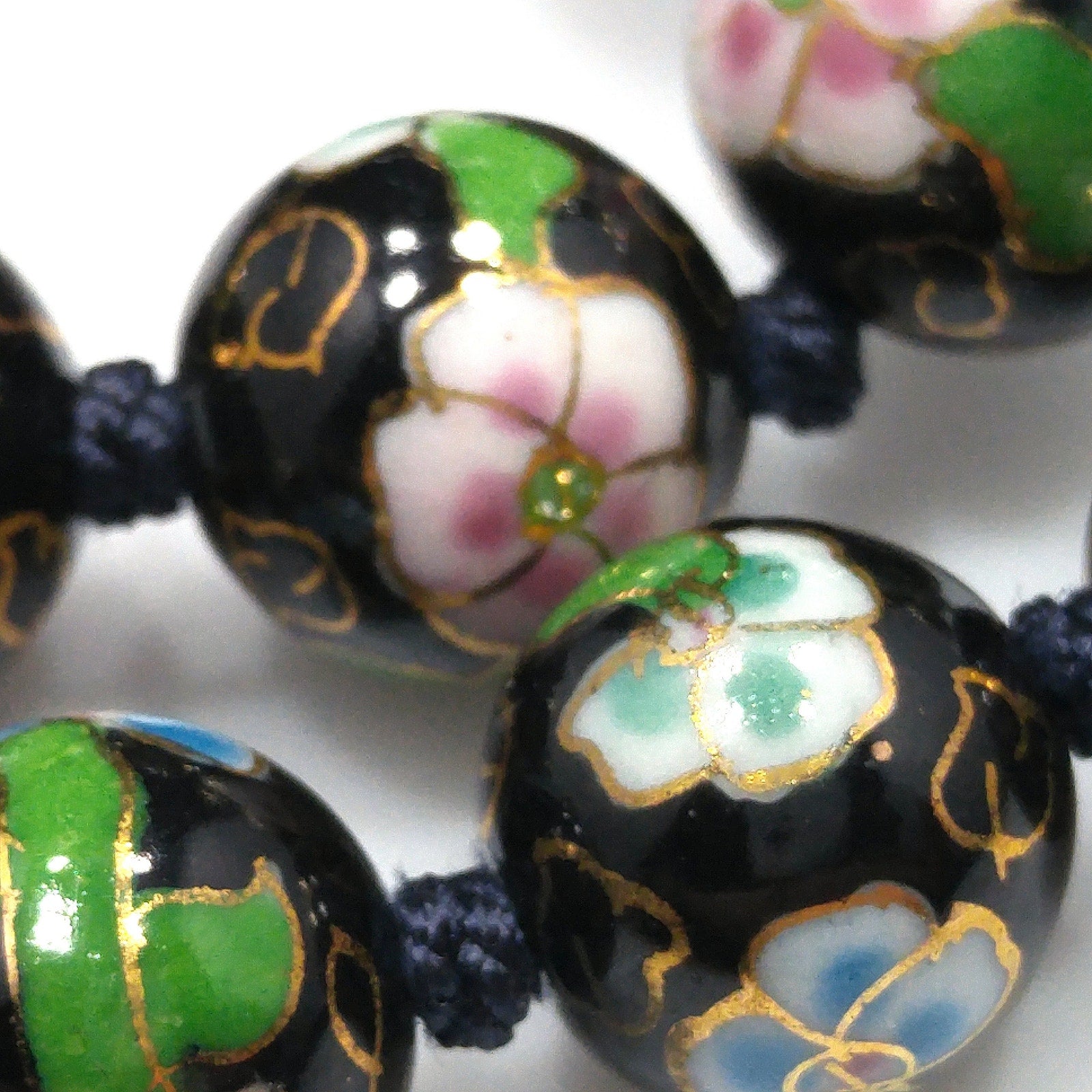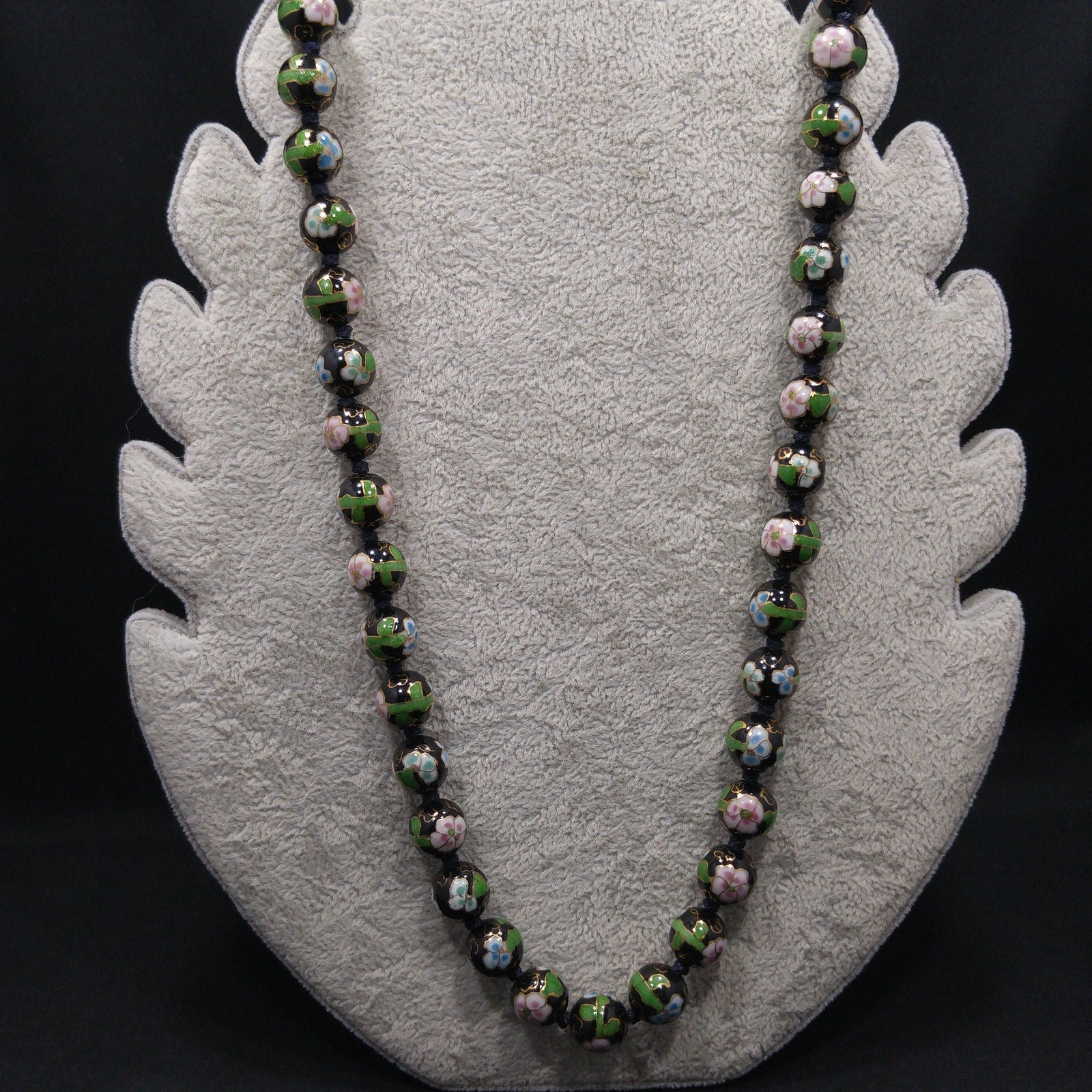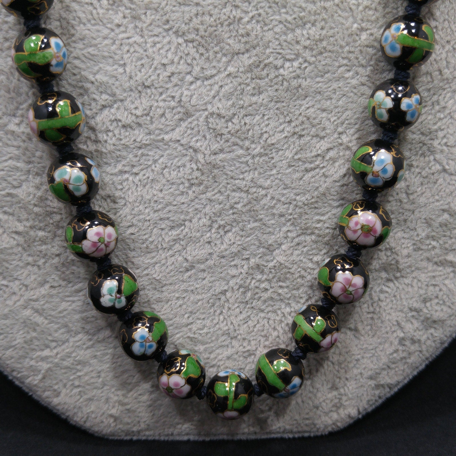 Vintage Black Cloisonné Floral Beaded Necklace, Pink Green Flowers, 1960s Vintage Jewelry