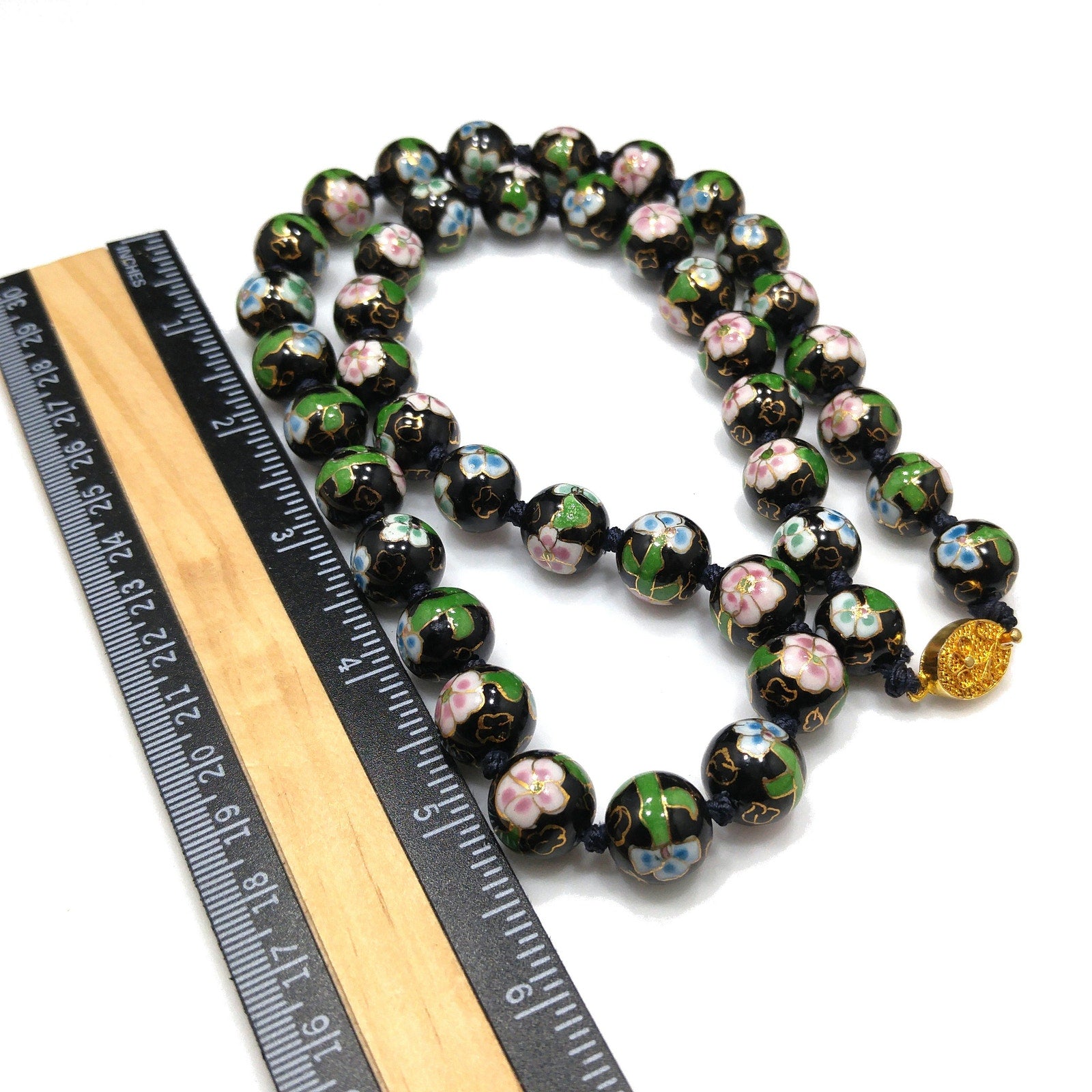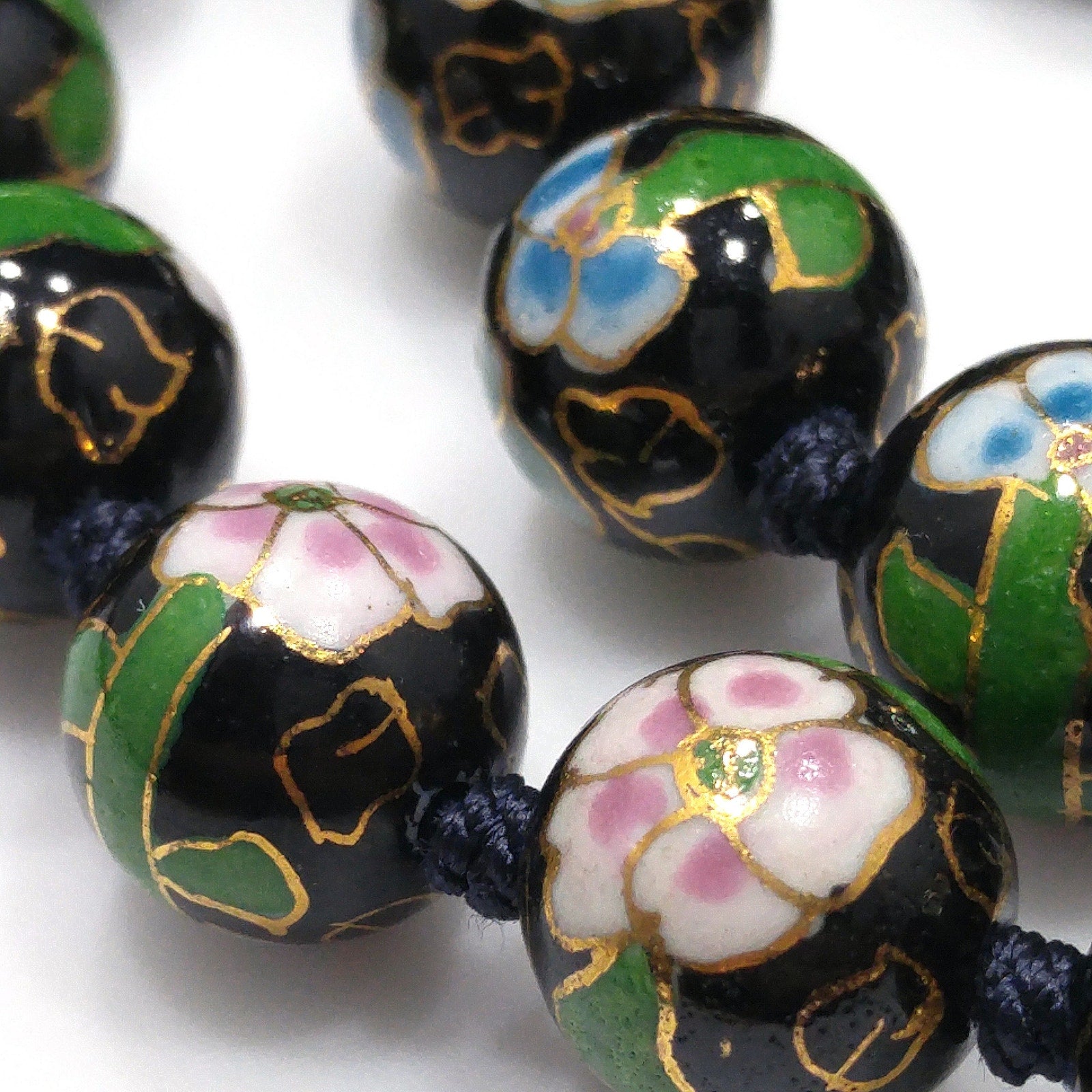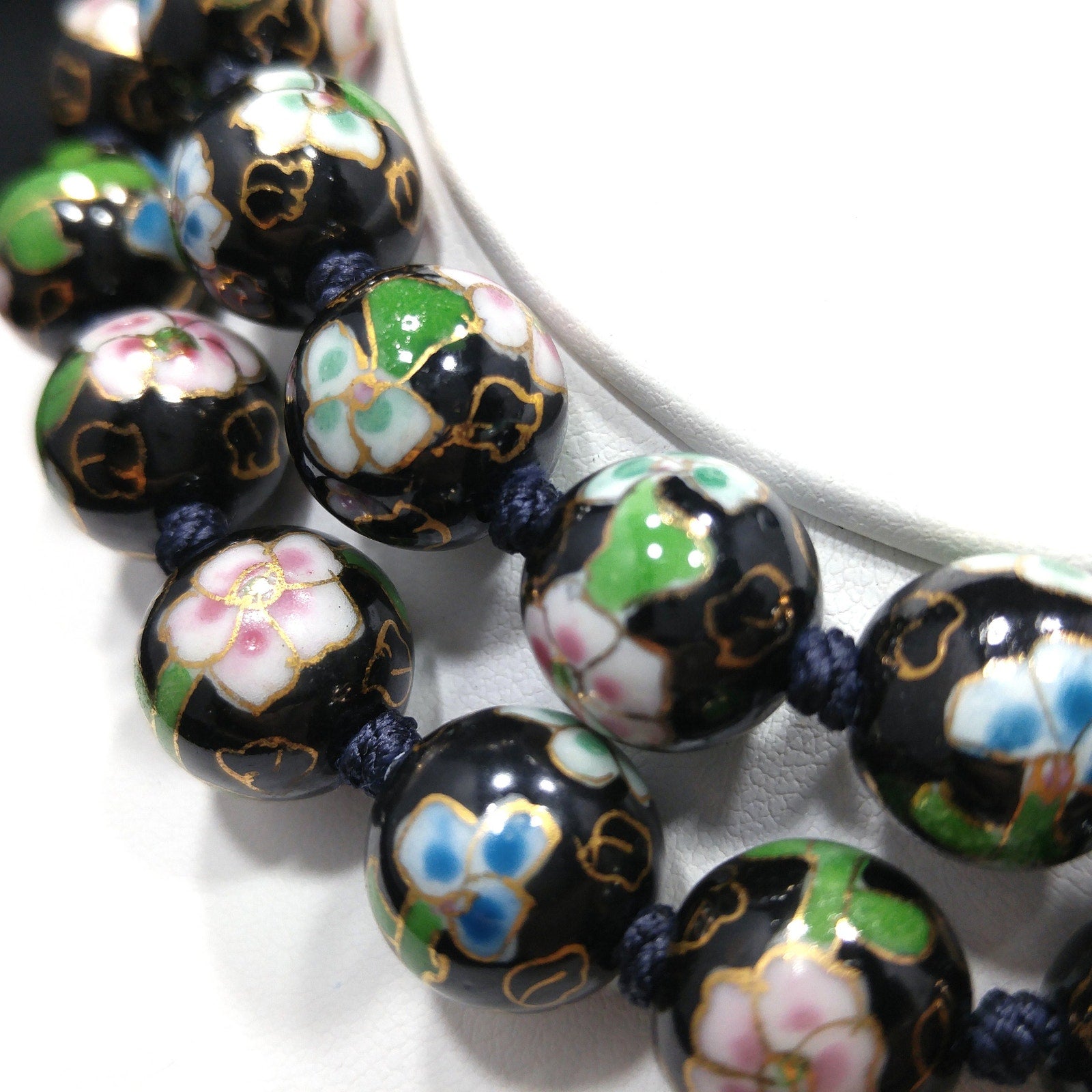 Vintage Black Cloisonné Floral Beaded Necklace, Pink Green Flowers, 1960s Vintage Jewelry