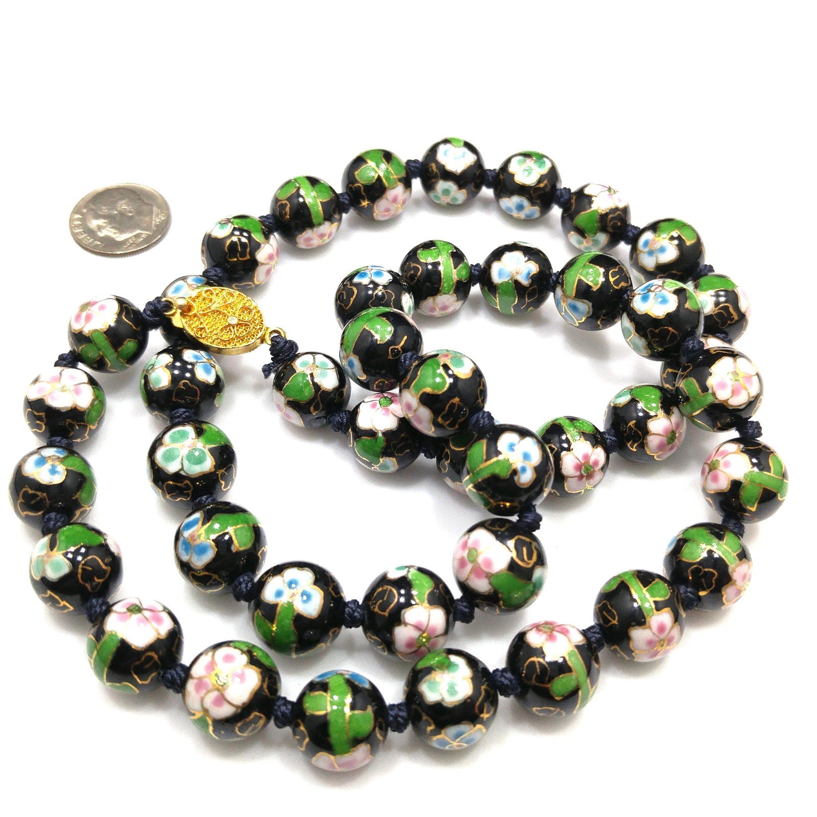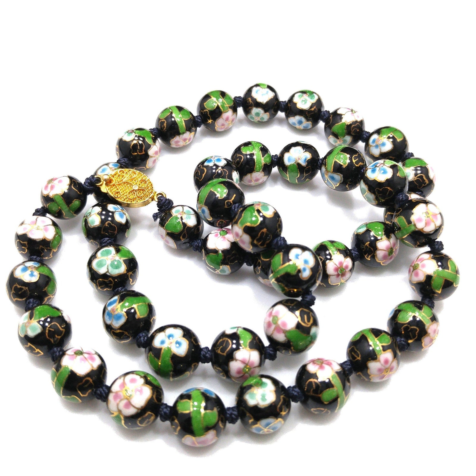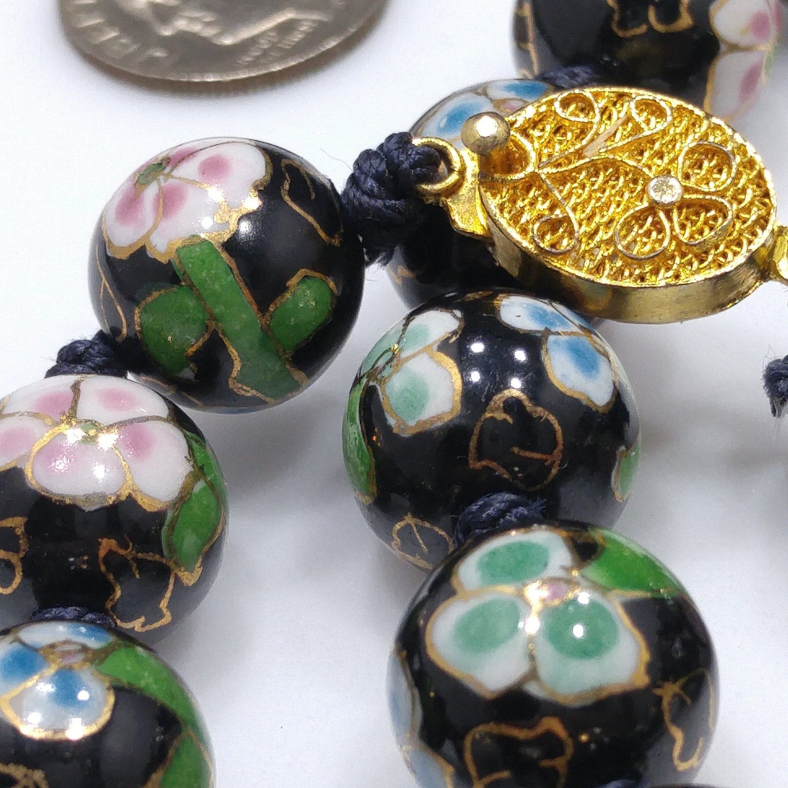 *Description: This is a beautiful cloisonné necklace with hand painted pink, blue, and green flowers and leaves on black porcelain beads trimmed in gold from the 1960s. This necklace is hand knotted to increase its strength. The filigree clasp is oval and gold in tone. This is a great vintage necklace and would make a great addition to your vintage jewelry collection. This style of necklace was imported from China in the 1960s. This would be a great addition to your vintage jewelry collection or make a great vintage gift!