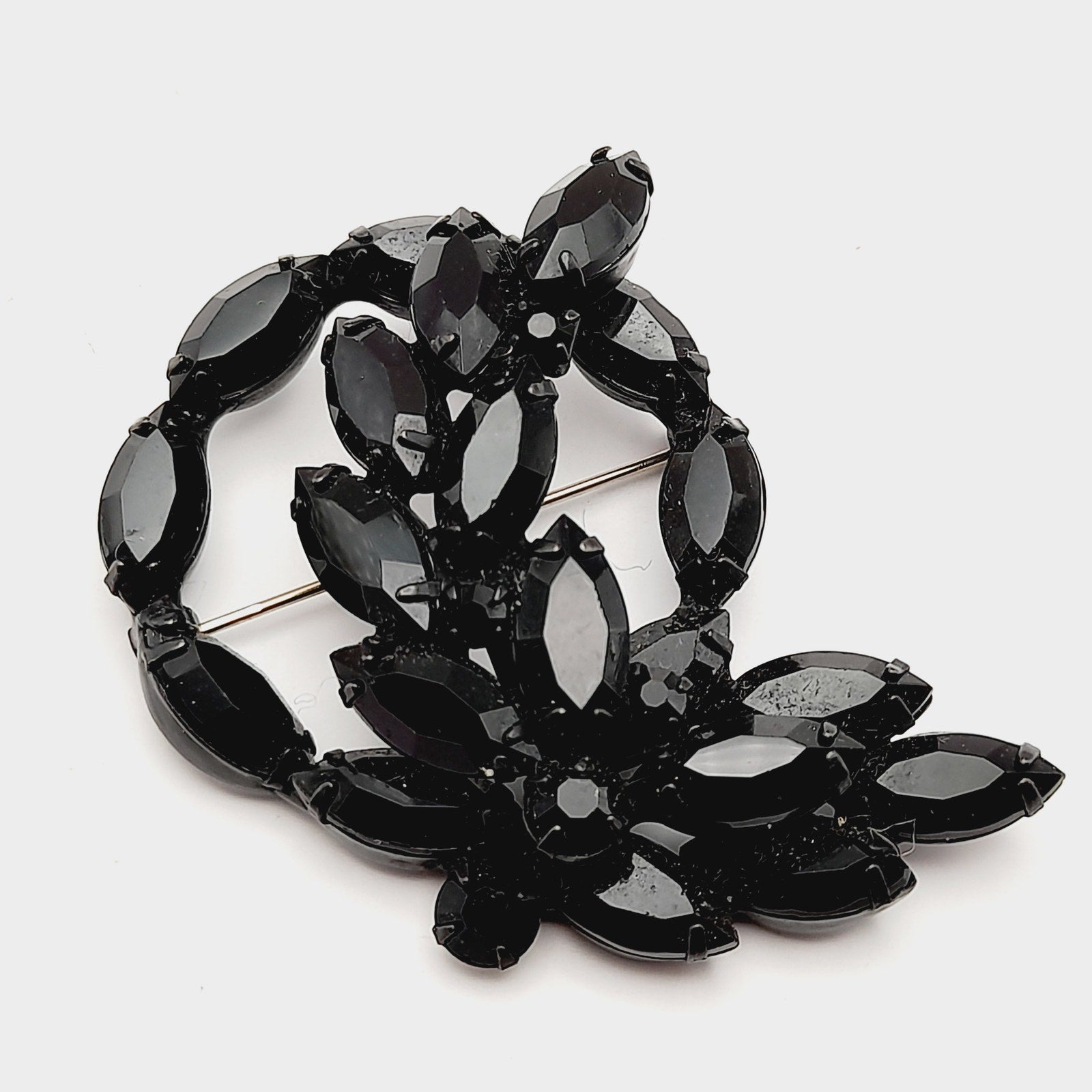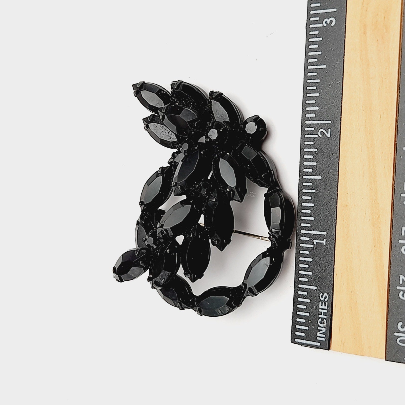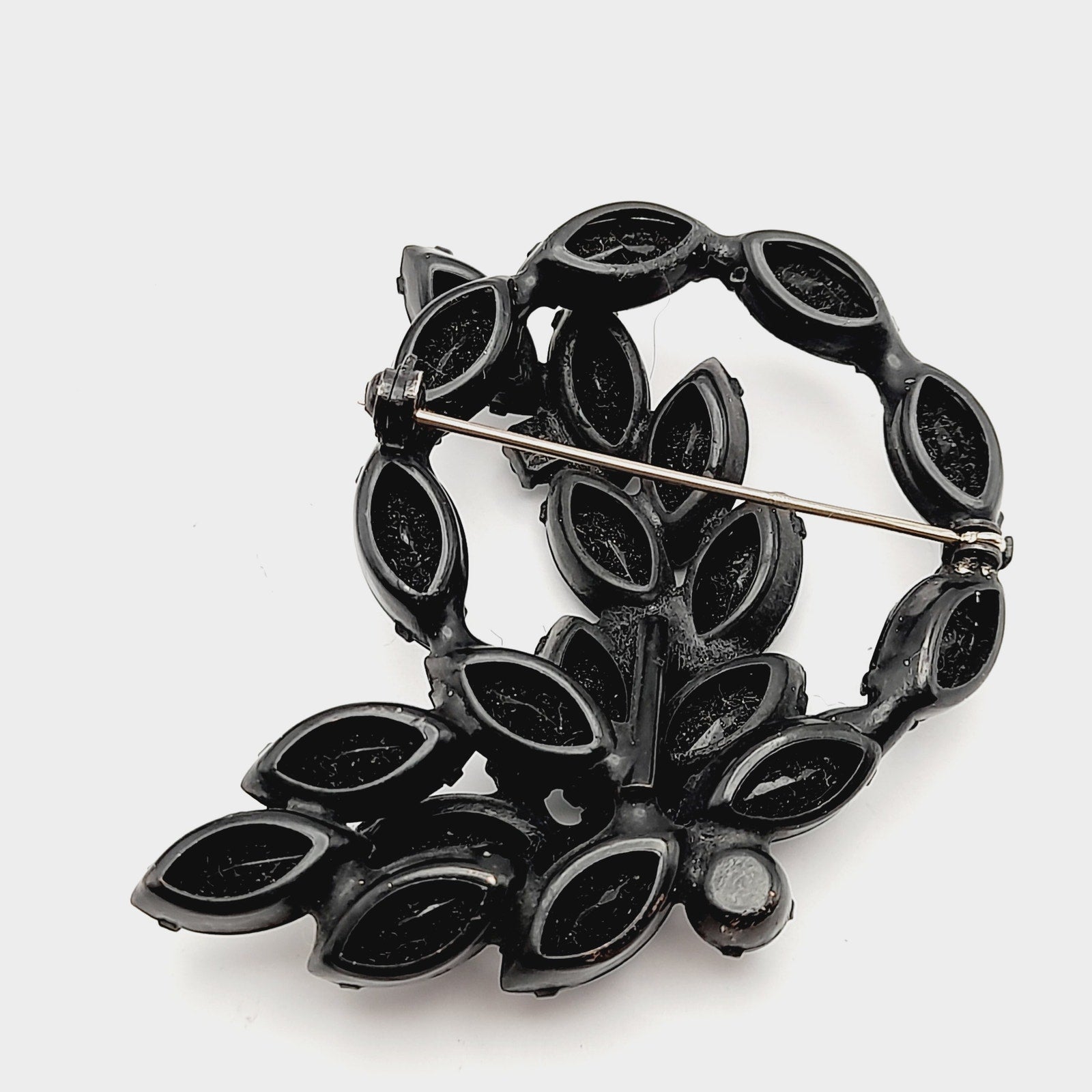 Add a touch of vintage elegance to your collection with this stunning 1960s black rhinestone brooch. The intricate wreath floral design is sure to catch the eye and elevate any outfit.